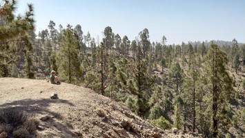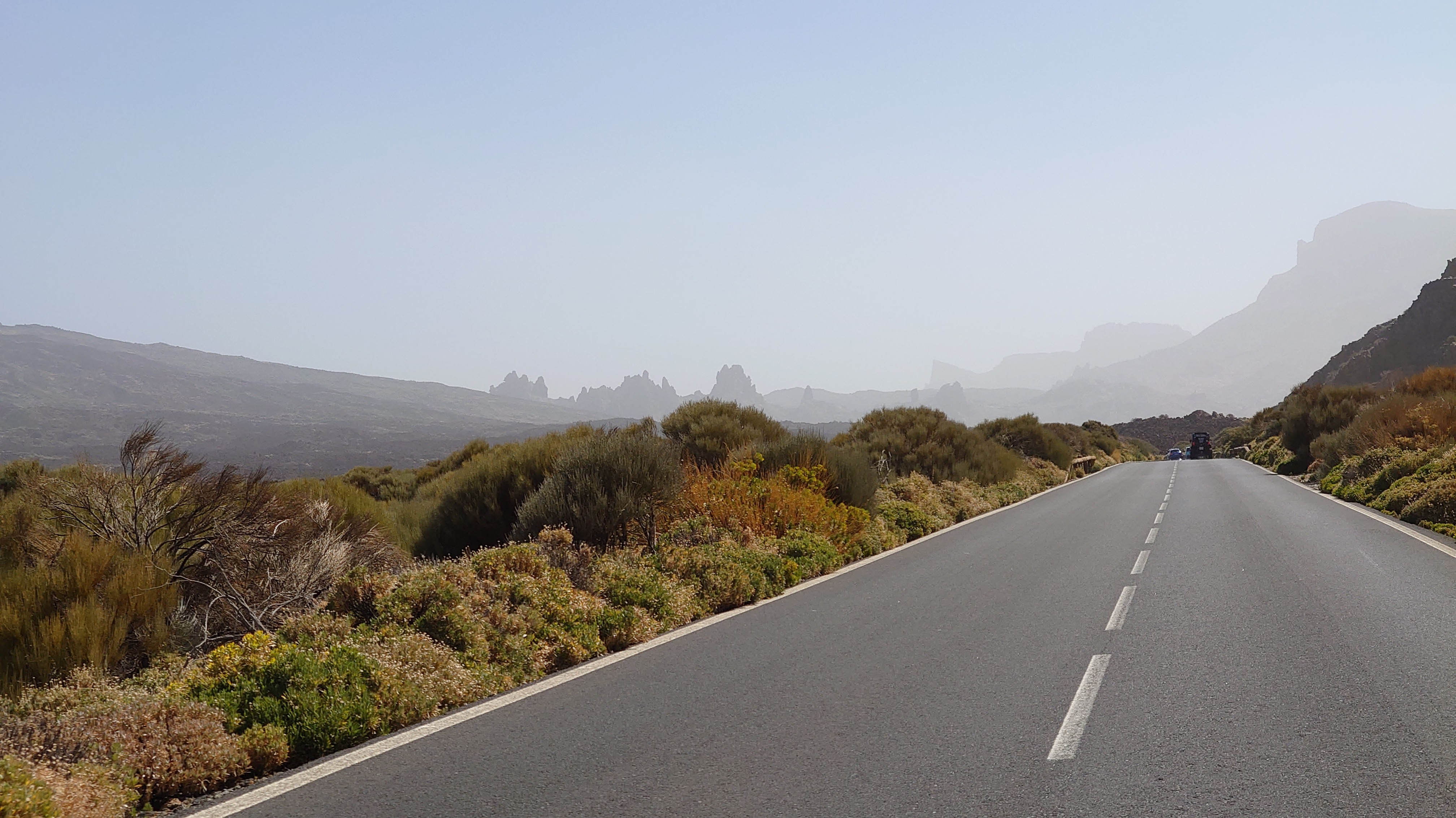 Es geht hinauf. Erstmal den Smog hinter uns lassen. Schon gestern konnte man vom Flugzeug aus nichts von der Insel erkennen, außer eine kleine Spitze des Teides. Alles liegt im Dunst. Das muss der Saharastaub sein, der zur Zeit bis Deutschland weht. Man konnte gestern Abend im Zwielicht am Strand deutlich eine gelbe Wolke über dem Meer erkennen. Und unser Auto ist jetzt auch mit gelbem Staub benetzt. Wir erreichen irgendwann die Baumuntergrenze des Corona Forestal. Die gibt's hier, weil es darunter zu trocken ist und die Wolken bis zur Küste hin schon längst verdunstet sind. Der Wald ist herrlich und mir kribbelt es in den Beinen. Zu sehr verbinde ich diese Landschaft mit laufen, dass es mir schwerfällt, es nicht zu tun.