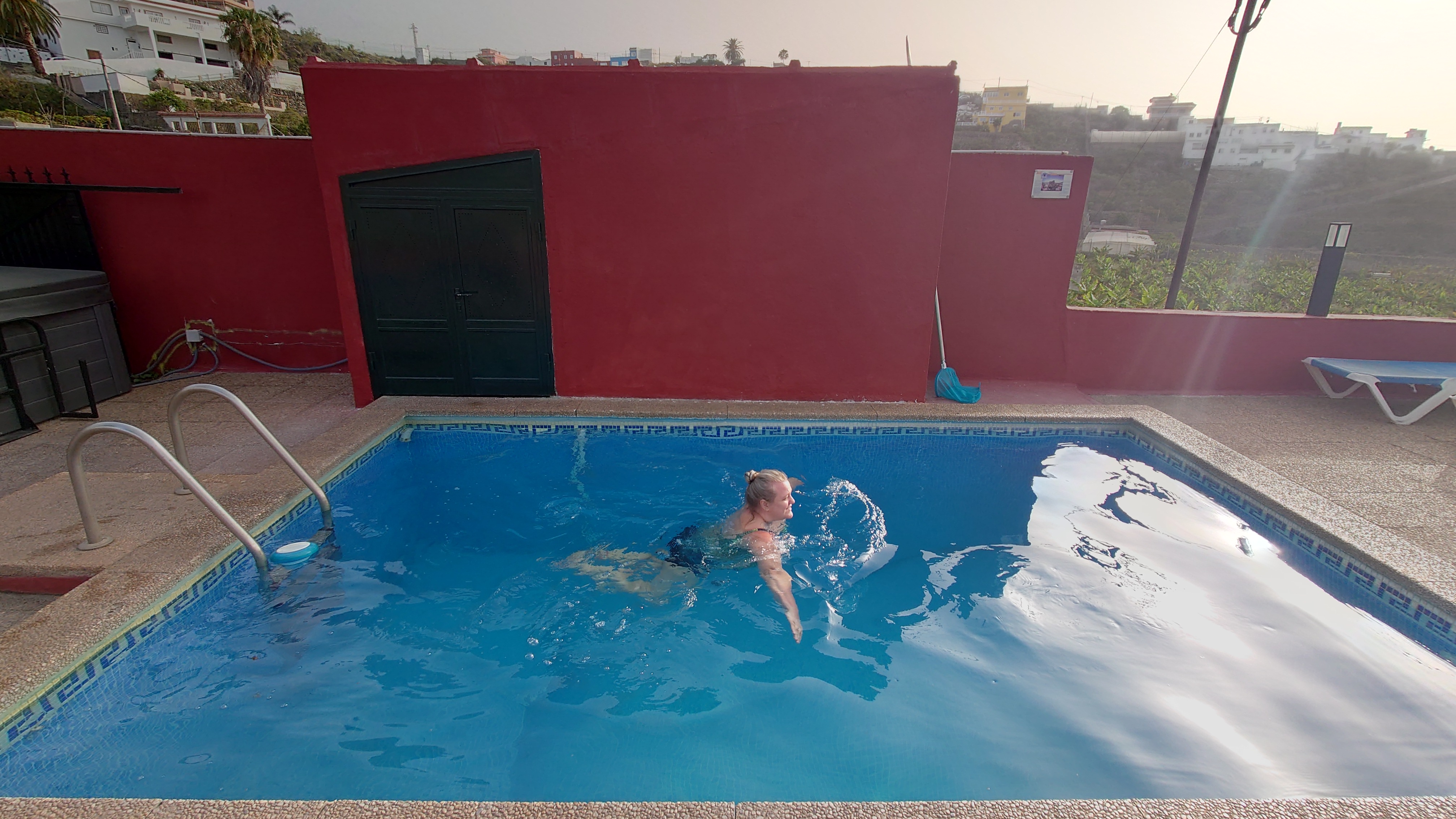 Unsere heutige Unterkunft liegt inmitten von Bananenplantagen und gehört einem deutschen Auswanderer, der sehr darauf bedacht ist, mir alles Notwendige fünf mal zu erklären. Es wirkt sehr pedantisch, aber er kann augenscheinlich auch nicht anders und bleibt mir sympathisch. Hier ist der Pool. Leander quiekt vor Glück. Und ein Jacuzzi! Leander explodiert vor Glück. Es wird geplanscht und geblubbert, bis die Zeit vergessen ist. Das ist hier nicht schwer.
