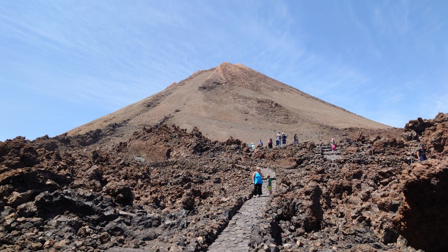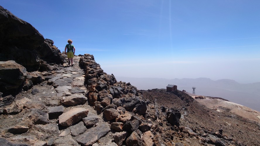 Und Leander ist begeistert. Eine Doppelmayr Gondelbahn für 45 Leute! Boaaah! "Ich will aber oben sitzen!" Leander, das ist kein Doppeldecker. Oben angekommen geht er wie selbstverständlich irgendwo hin los. Wir müssen ihn einfangen wie Schäfer die Herde. Eine Herde bestehend aus einem lauten Kater, der immer schlechter hört, je mehr er begeistert ist. Miiaaauuuuu! Aber er merkt schnell, dass Papa Recht hat, wenn es ums Pausen machen geht. Die Luft ins 3700 Metern Höhe ist aehr dünn, vor allem am ersten Tag und dann gleich von Null auf den höchsten Berg Spaniens. Und dann auch noch feuchte Löcher, aus denen es nach Eiern riecht! Lwander ist nicht amüsiert über Eierlöxher, auch nicht nach meiner Erklärung, dass diese Löcher nur bei aktiven Vulkanen existieren. Ee will weiter hoxh. Aber auch mir ist schwindelig ob der Höhe. Frances hingegen freut sich. Kein bisschen Höhenangst macht ihr zu schaffen. Und so erreichen wir alle drei bedächtig aber stetig das Ziel in Form des goldenen Punkt am oberen Kraterrand. Herr Bund ist schon ganz zappelig vor Freude und Kater Leander hilft ihm an den goldenen Podest. Geschafft! Alle vier! Der Ausblick ist ernüchternd durch den Sandnebel. Aber das macht nichts. Wir alle sind hier, als Familie, und das zählt.