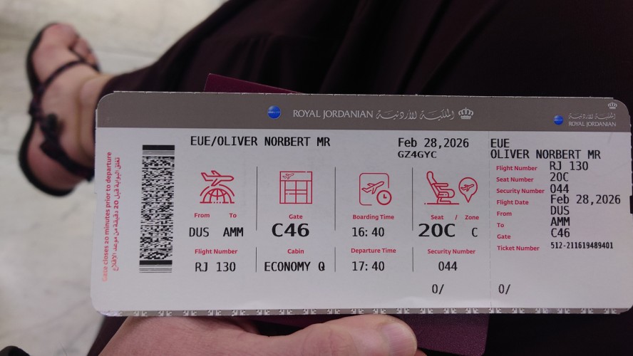 Bis Zypern geht die Route direkt auf Amman zu, bis der Flieger schließlich den Knick in Richtung Ägypten einschlägt, um einen Bogen um Israel zu schlagen und südlich über Aqaba in Richtung Amman zu steuern. Der Krieg lässt Haken schlagen. Der Flughafen von Amman ist offensichtlich verwaist. Nur ein paar RJ Maschinen stehen herum, andere Fluggesellschaften landen anscheinend nicht mehr. Im Terminal wartet um 1 Uhr Ortszeit geduldig der Bruder von Yaser auf mich mit einem "Oliver" Schild in der Hand, um mich abzuholen. Noch schnell die jordanische Sim-Karte besorgen und los geht's in Richtung Ma'in. Es ist kalt! Waren es in Düsseldorf noch 20 Grad, so sind es jetzt nur noch vier. Und das in einem Wüstenstaat. Scheiß Krieg, sagt auch er. Keiner käme mehr. Den Angriff zwischen Iran und Israel haben gestern Abend viele live verfolgt hier. Nicht im Fernsehen, sondern auf den Hausdächern. Die Raketen fliegen über Jordanien hinweg. Israel, die USA und Jordanien fangen die meisten ab, aber zwei drei hätten Jerusalem getroffen. Während wir nach Ma'in durch die Nacht fahren, sehe auch ich welche am Horizont. Sehr schnelle gelbe Punkte, die wie Düsenjäger klingen, fliegen nördlich von Amman in Richtung Israel. Der Bruder zuckt die Schultern. Im Sommer wäre es schlimmer gewesen, da kamen hunderte gleichzeitig, meint er. Die Leute säßen draußen mit Ferngläsern, um neugierig zu gucken. Jordanien wäre ja raus aus dem Spiel. Nur den Luftraum sollten sie schön in Ruhe lassen.