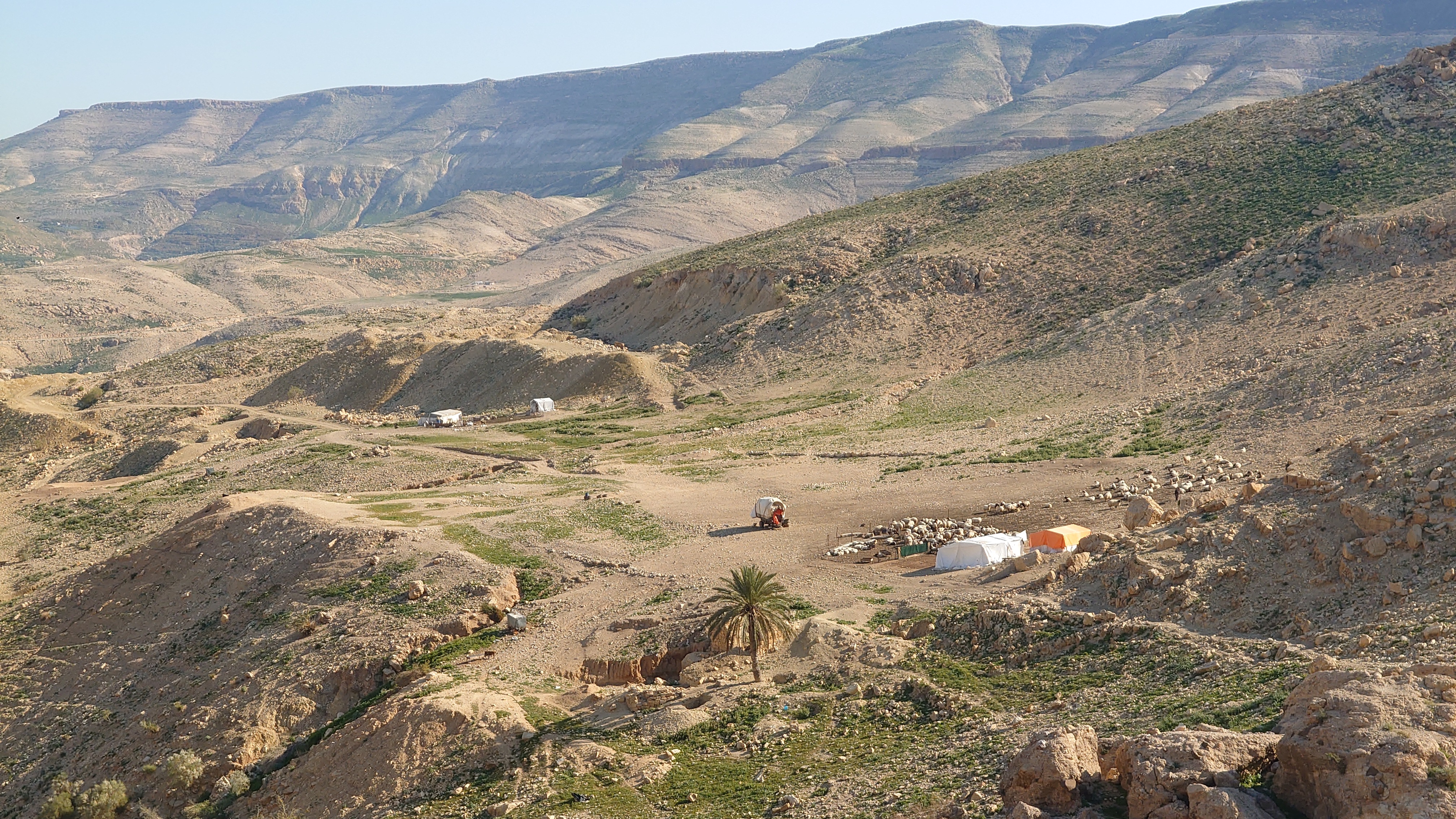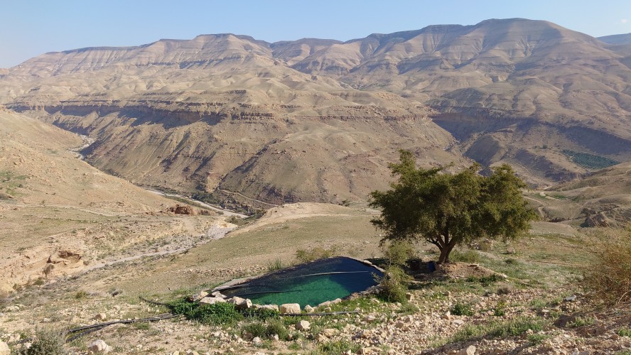 Irgendwann kommt auf einem Mal das Plateau mit grünen Feldern und einer grandiosen Aussicht auf das Jordantal und die dorthin mündenden Canyons. Ich brauche kaum Wasser. Das war meine größte Sorge. Wenn ich schon drei Tage durch Gegenden ohne große Infrastruktur laufe, will ich auf keinen Fall dehydrieren. Ich folge der Abbruchkante des Plateaus, bis der Weg mich schließlich zum dritten Wadi hinab führen will... und zwar nahezu senkrecht. Das sehe ich nicht ein, dafür ist die Markierung des Wegs einfach zu sporadisch. Eine durch Regenwasserfluten unbrauchbar gewordene Piste verläuft einen Kilometer weiter in Serpentinen bergab. Das ist nicht weniger anstrengend, aber mental deutlich einfacher. 4 Stunden dauert der verlängerte Abstieg, bis ich schließlich gegen 17 Uhr Wadi Murjib erreiche. In einiger Entfernung landen jetzt regelmäßig die Flugzeuge. Das beruhigt mich sehr, der Luftraum scheint sicher zu sein. Seit heute Morgen gab es keinen Rumms mehr. Auch an Zisternen komme ich vorbei, die direkt aus dem Hang gespeist werden. Eine Quelle scheinbar. Perfekt. Ich fülle gleich vier Flaschen auf. Mag sein, dass das schwer ist, aber noch schwerer sind die Kopfschmerzen zu ertragen, wenn man es nicht hat.