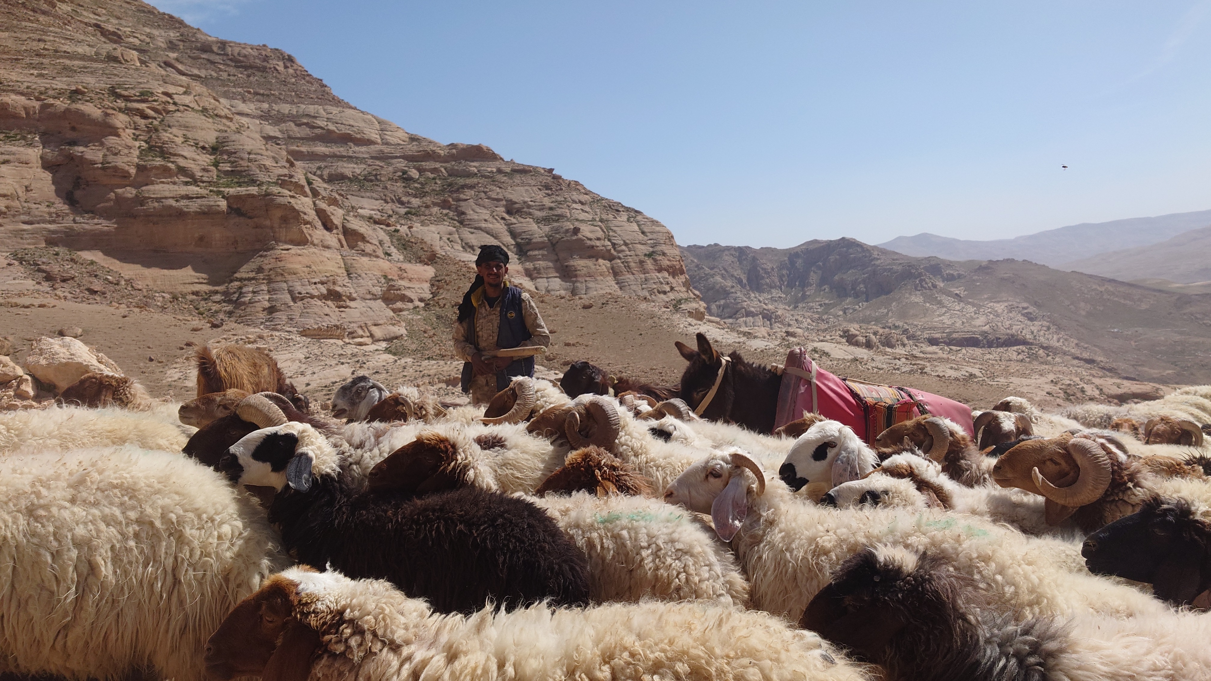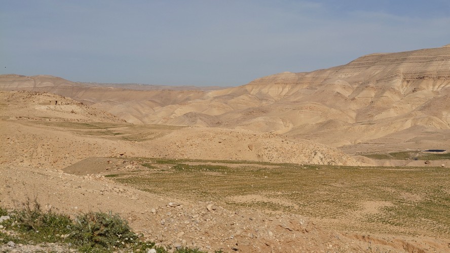 Ein nicht enden wollendes, leises Gefauche schwirrt währenddessen durch die Luft. Dann entdecke ich die wieder die weißen Striche. Viele viele Raketen in Richtung Westen. Ich kann mich mit dem Anblick nicht anfreunden. Die sehen so friedlich aus da oben. Ziel scheint nicht mehr Jerusalem zu sein. Die wurden ja permanent abgeknallt. Es muss Tel Aviv sein. Diese sind anscheinend zu hoch und passieren Jordanien ungehindert. Strategiewechsel? Ich will gar nicht nachsehen. Innerhalb von 5 Stunden komme ich langsam zum Wadi Hasa inmitten des breiten Tals und passiere viele Schafhirten, die mir alle wohlgesonnen sind, Wasser und Zigaretten anbieten und ihre Hunde im Zaum halten. Sie schauen skeptisch auf mein Schuhwerk. Das macht keinen Sinn für sie. Naja, hütete ich Ziegen, sähe ich das auch anders. Ich habe ja keine Eile hier. Und dass ich mich mit nichts untenrum am wenigsten verletze, ist tausende Kilometer lang erprobt. Gut, gegen Dummheit kann man nichts machen. Aber mein Arm hat eine saubere, farblose Kruste um mein Aua herum gebaut.