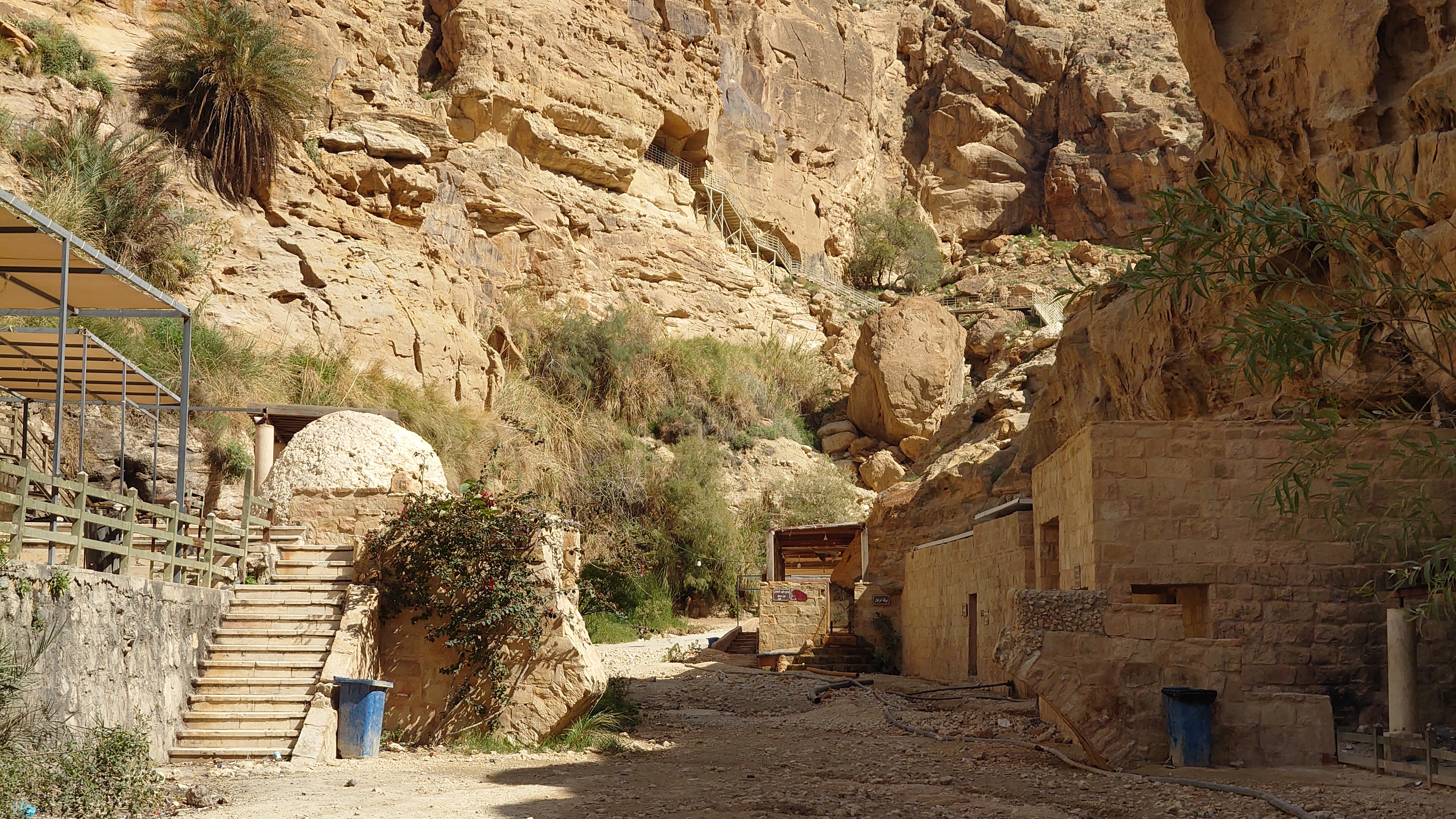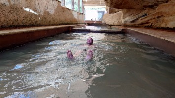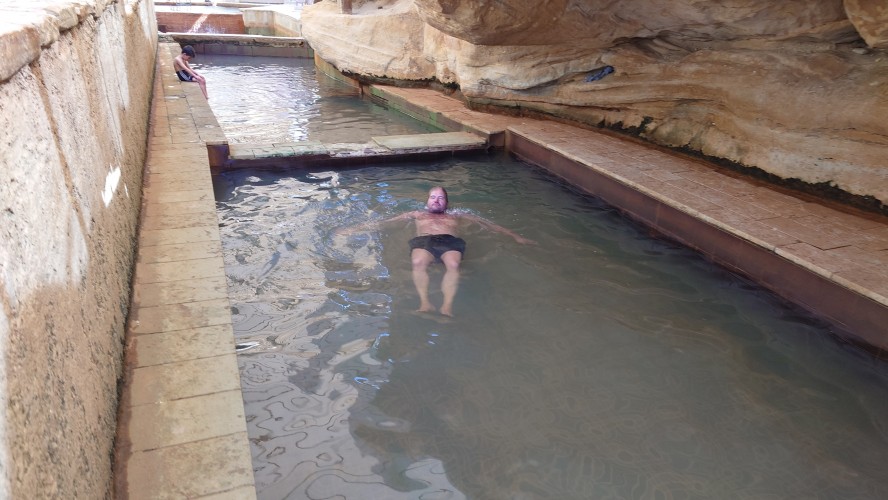 Das Wasser im Wadi ist lauwarm. Und mein Weg ist auf einmal weg. Hier unten wurde rumbegabbert. Der Weg war im Weg. Jetzt ist hier eine versehentlich renaturierte Furt entstanden, die ich nicht umlaufen kann. Und schon macht mein Schuhwerk wieder Sinn: Hosenbeine hoch und ab durch den Schlamm und das Wasser. Mein Ziel soll hier auch sein, ein Resort. Aber es sieht total verwaist aus. Keine Gäste, keine Saison, wie auch immer. Aber so sehr schön ist es hier auch nicht, eher reudig mit einigen landwirtschaftlichen Betrieben. Und was mache ich jetzt? Hier in der Nähe sollen heiße Quellen sein, hat mir Google Maps gestern verraten. Das Navi sagt 3km nach Westen auf einer Straße, die dort angeblich aufhört und 300m weiter wieder auftaucht. Was soll das denn? Naja, im Zweifel kenne ich mich offroad rumstaksen ja jetzt aus, also los, ich will baden.