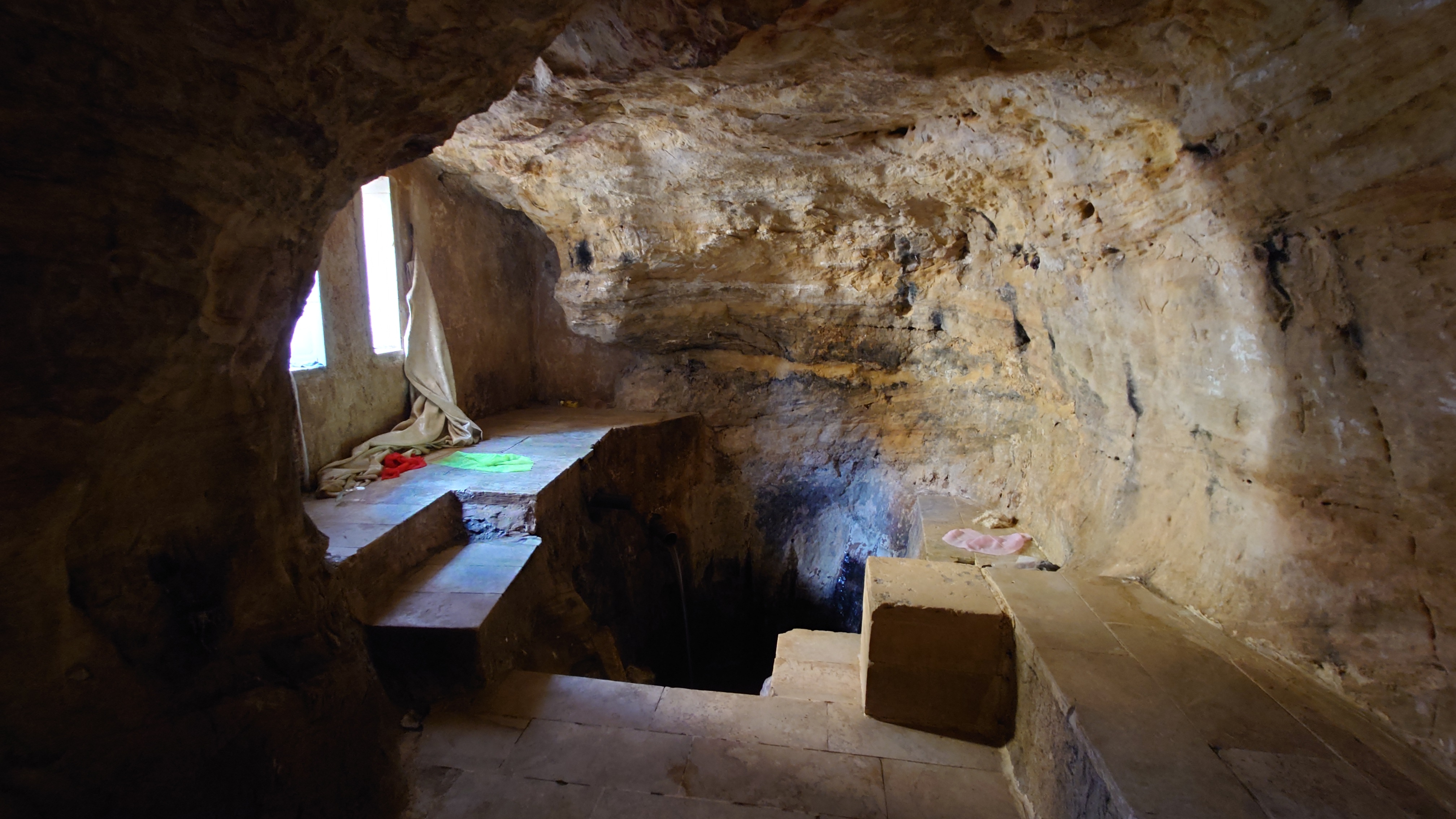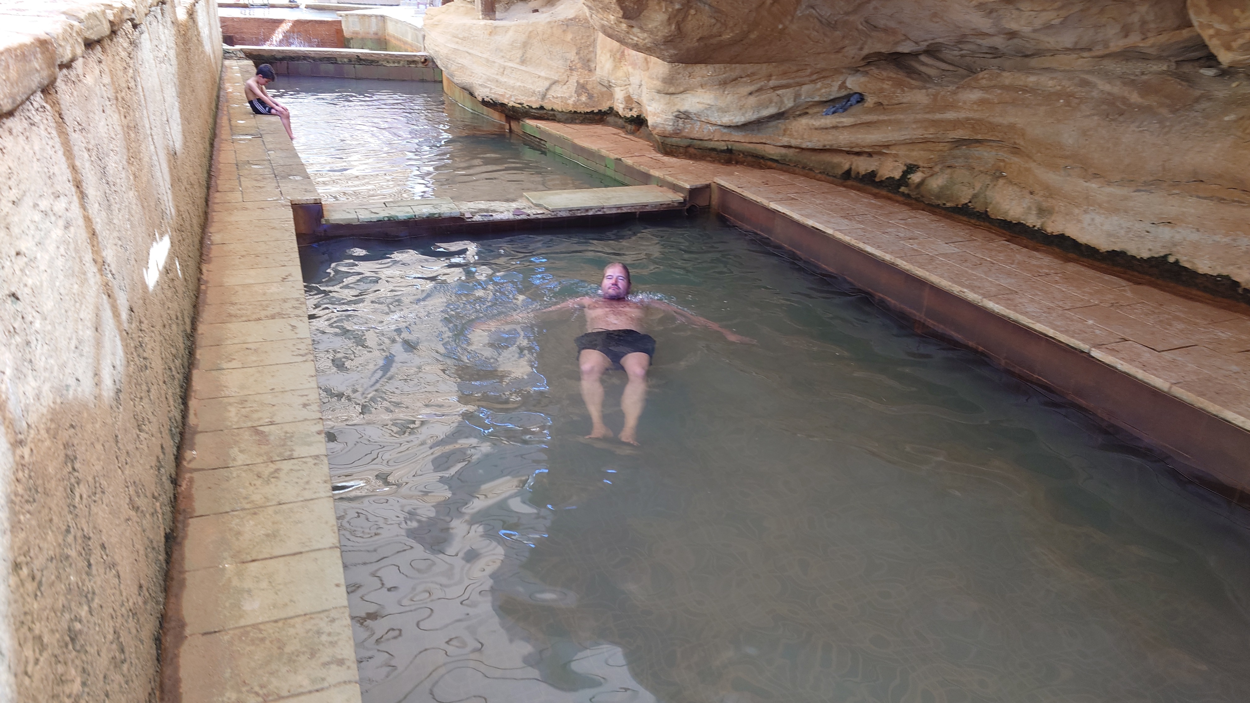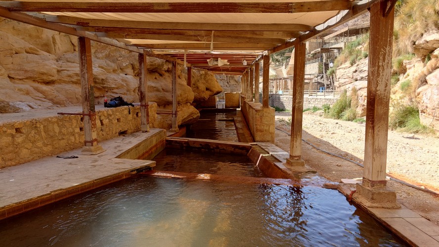 Niemand ist hier, bis schließlich auf halber Strecke ein südkoreanisches Blechgebildet neben mir hält. Zwei Männer und ein Kind schauen heraus: Sie wollen zu den heißen Quellen. Ich auch? Ich auch! So steig doch ein! Mache ich. Es grüßen mich Hamsa, Said und der kleine Abujenda, der Schwimmen lernen soll. Wir fahren also gemeinsam zum Afra Hot Spa, wo wohl so richtig was los... sein... könnte... wenn Menschen da wären. Vor Ort ist nur ein Händler für Getränke, der mich freudig mit einer 2 Liter Matrix Wildberry Flasche begrüßt. Es sieht verwahrlost aus. Hier war wohl auch mal ein Restaurant und ein Resort. Das muss aber alles stark mitgenommen worden sein durch eine Schlammlawine, die hier einst wütete. Ich gehe mit den Männern in eine Schlucht, in welche Bäder gebaut wurden und das Wasser mit über 40 Grad hinein fließt. Genau was ich gesucht habe. Aber leider weiß ich jetzt auch, warum hier die Straße endet. Sie ist einfach nicht mehr da und dafür einer Art Rückhaltebecken gewichen, das die Schlucht unpassierbar macht. Sackgasse. Egal, darum kümmere ich mich später. Erstmal soll ich mit baden kommen. Ich brauche ewig, bis mein Körper die Hitze aushält. Sie lachen sich kaputt. Jaja, habt mal ne empfindliche Wunde! Abujenda sitzt verunsichert im Becken, während der Vater versucht ihm Wasser über den Kopf zu gießen. Ich liege im Becken herum und fange regelrecht an zu schwitzen. Neee, der Kleine weiß nicht so recht, was mit dem Wasser gemacht werden soll und so gehen wir nach 20 Minuten wieder heraus. Hamsa will mir noch eine antike Felsenbehausung im Berg zeigen. Auch nett. Und nun? Ich stelle fest, das ich nur umdrehen kann. Naja, die drei auch. Sie würden mich och nach Ais mitnehmen, sagt Hamsa. Da wohnen sie. Na wenn das nicht eigentlich mein Ziel ist, das ich genommen hätte, wenn die Überquerung des Berghangs nicht so lang wäre... ich sage nicht nein. Die Strecke ist karg und unspannend. Das sagt auch mein Jordan Trail Pass. Habe ich damit gerechnet? Hmm... sagen wir so, ich schließe hier nichts mehr aus. Die Menschen sind einfach viel viel mehr miteinander, viel mehr eine homogene Gesellschaft als bei uns. Ich wusste, dass diese Option besteht, als ich in den Wagen gestiegen bin.