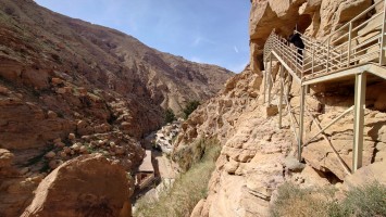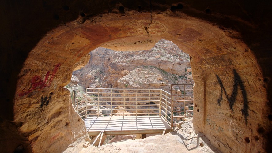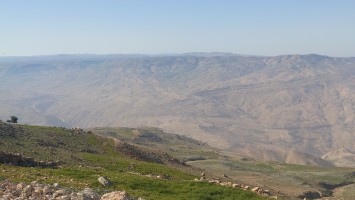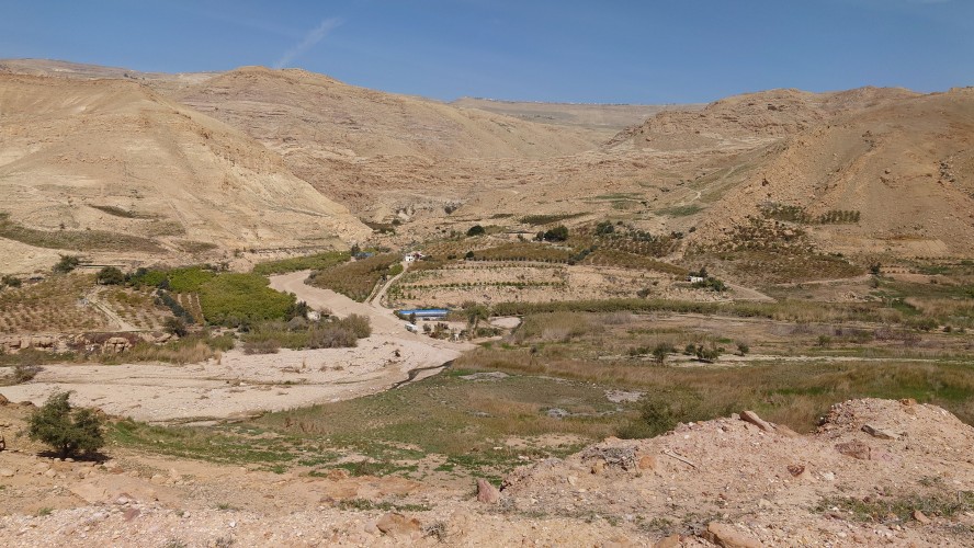 Es geht von Karak steil bergab auf einem markierten Pfad, wen man nur in der Theorie "Weg" nennen darf. Auch daran gewöhne ich mich. "Wanderweg" darf man nicht mit dem alpinen Vorbild gleichsetzen, bei dem die Markierungen einen ausgetretenen Weg begleiten. Immer wenn die Pisten enden, bleibt das Gefühl, dass außer dem Menschen mit dem rotweißen Farbeeimer nie jemand Menschliches den Boden betreten hat. Ziegen sicherlich. Diese Pfade führen regelmäßig in die Irre. Wenn ich nicht im Minutentakt das GPS Signal checken will, heißt es, die Intuition zu schärfen: Was hätte ich als Erbauer mit den Wanderern am ehesten vorgehabt? Das funktioniert erstaunlicherweise ähnlich gut wie beim Geocachen: Halte alle Formationen im Blick, schaue dir bei jeder Markierung an, in welche Richtung sie ausgerichtet ist und suche von dort aus die nächste. Das klappt! Aber man ist unglaublich langsam unterwegs, erst Recht mit 30% Gefälle.