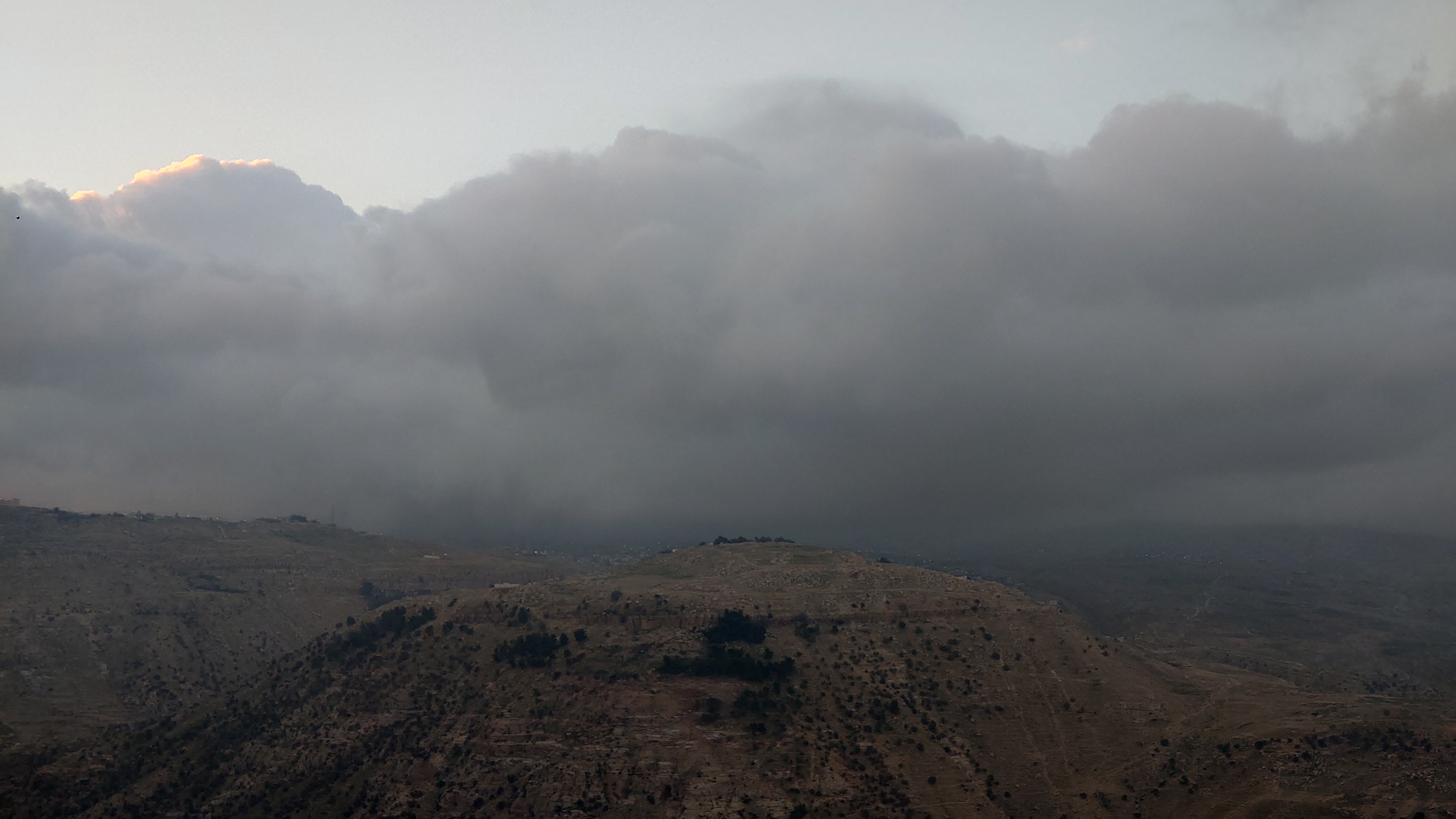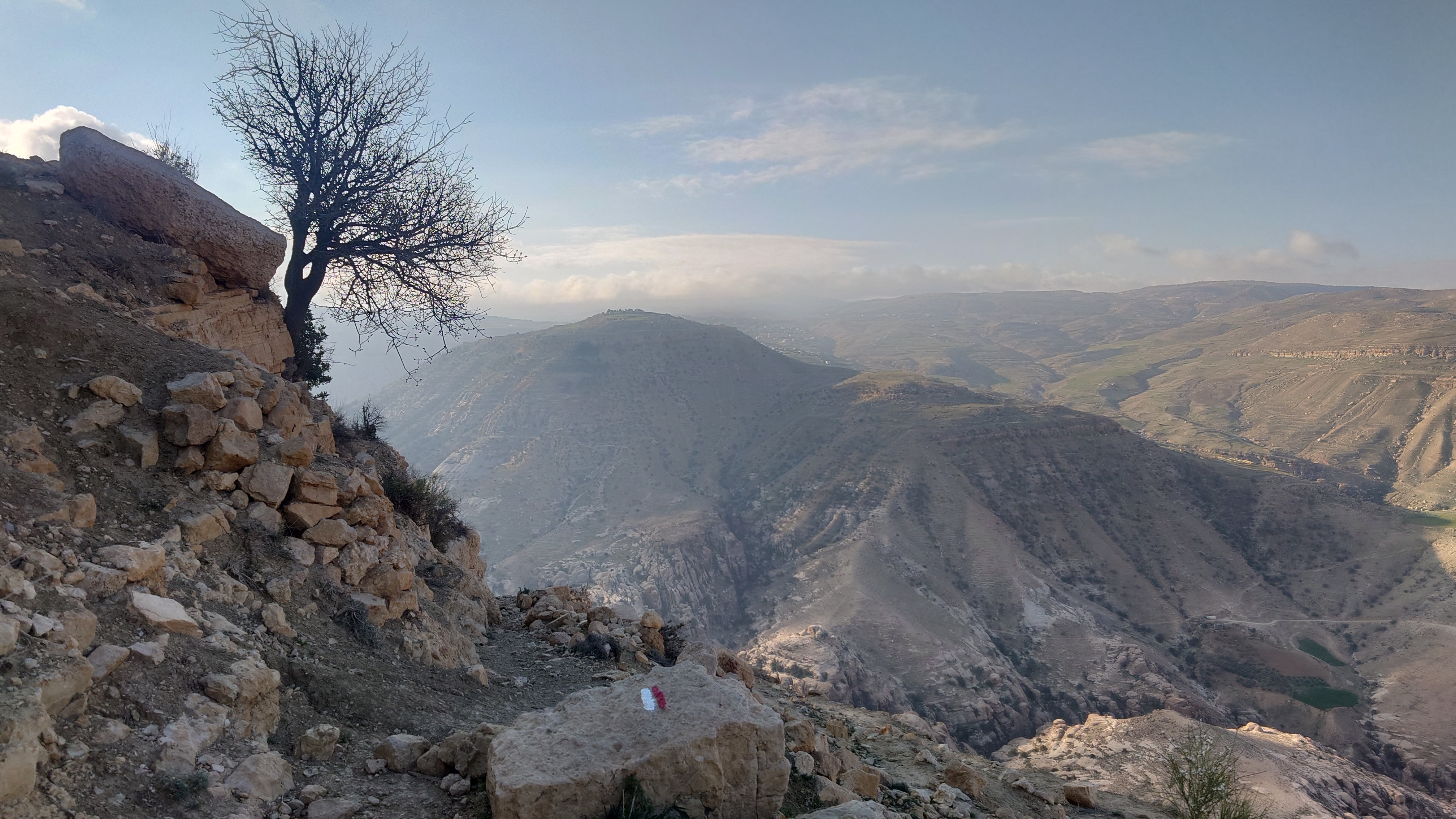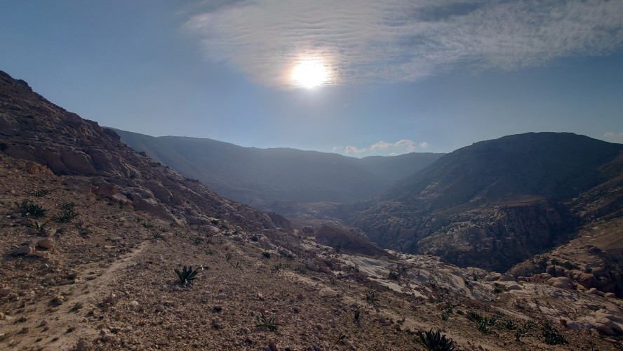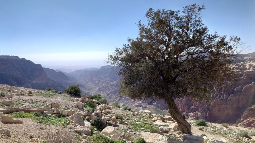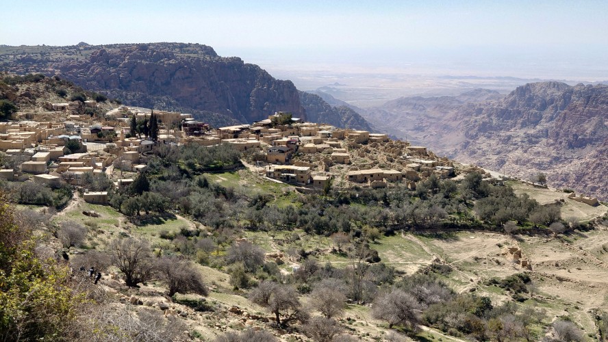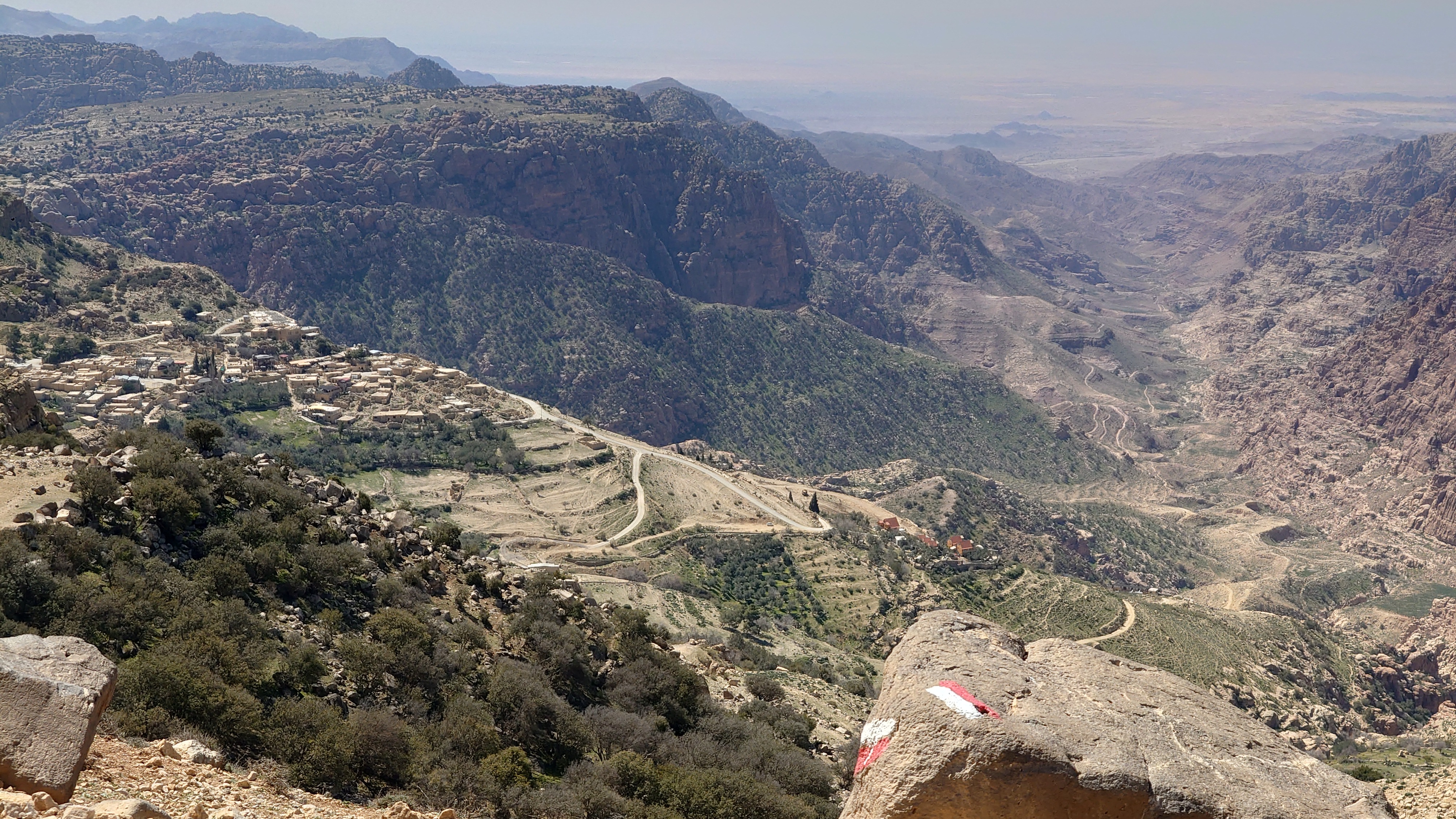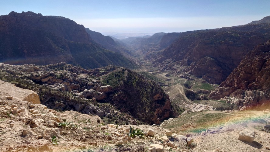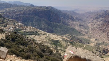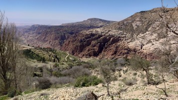 Der Aufstieg ist moderat, aber ewig lang, führt mich durch eine Ortschaft und einer nicht fertig gestellten Autobahn bis auf 1500 Meter Höhe hinauf. Ein saukalter Wind pfeift, der meine Glieder steif werden lässt, bis ich schließlich über den Zenit zum nächsten Tal schauen kann. Schlagartig verändert sich die Vegetation. Wo eben noch Wüste war, kommen auf einmal Kiefernwälder in Sicht. Die Hänge sind bewaldet. Weit unten strebt das Wadi Dana von mir weg und sieht komplett anders aus als alle Wadis vorher. Es ist geprägt durcht zerklüfteten, roten Sandstein und zieht sich lang durch in das -400 Meter tief gelegene Jordantal, das jetzt sehr breit geworden ist. Das Tote Meer habe ich mittlerweile hinter mir gelassen. Wunderschön sieht das Tal aus. Vor mir liegt das Dorf Dana zum Tal hin exponiert am Hang. Mein heutiges Ziel.