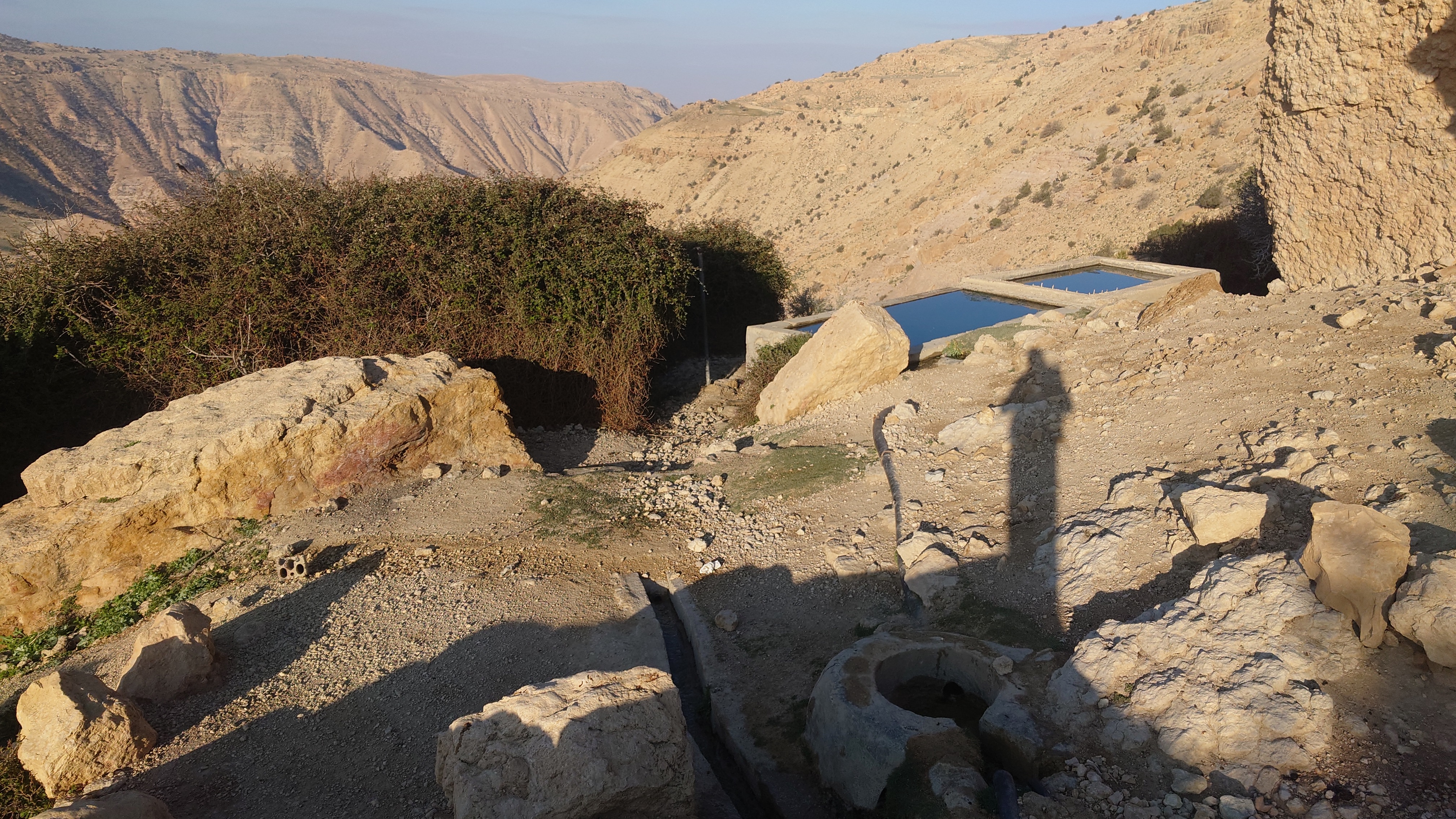 Erstmal duschen und dann die morgige Etappe planen. Drei Wild Camps folgen im sechsten Abschnitt bzw. im diesjährigen dritten Drittel des Jordan Trails aufeinander. Das will ich nicht durchhalten müssen. Aber es kommt auch nur noch eine vom Weg abgelegene Ortschaft zwischendurch. Und angeblich keine Straßen! Zum Glück Wasser überall, wobei ich bei den Temperaturen kaum mehr als einen Liter pro Etappe benötige auf dem Weg.