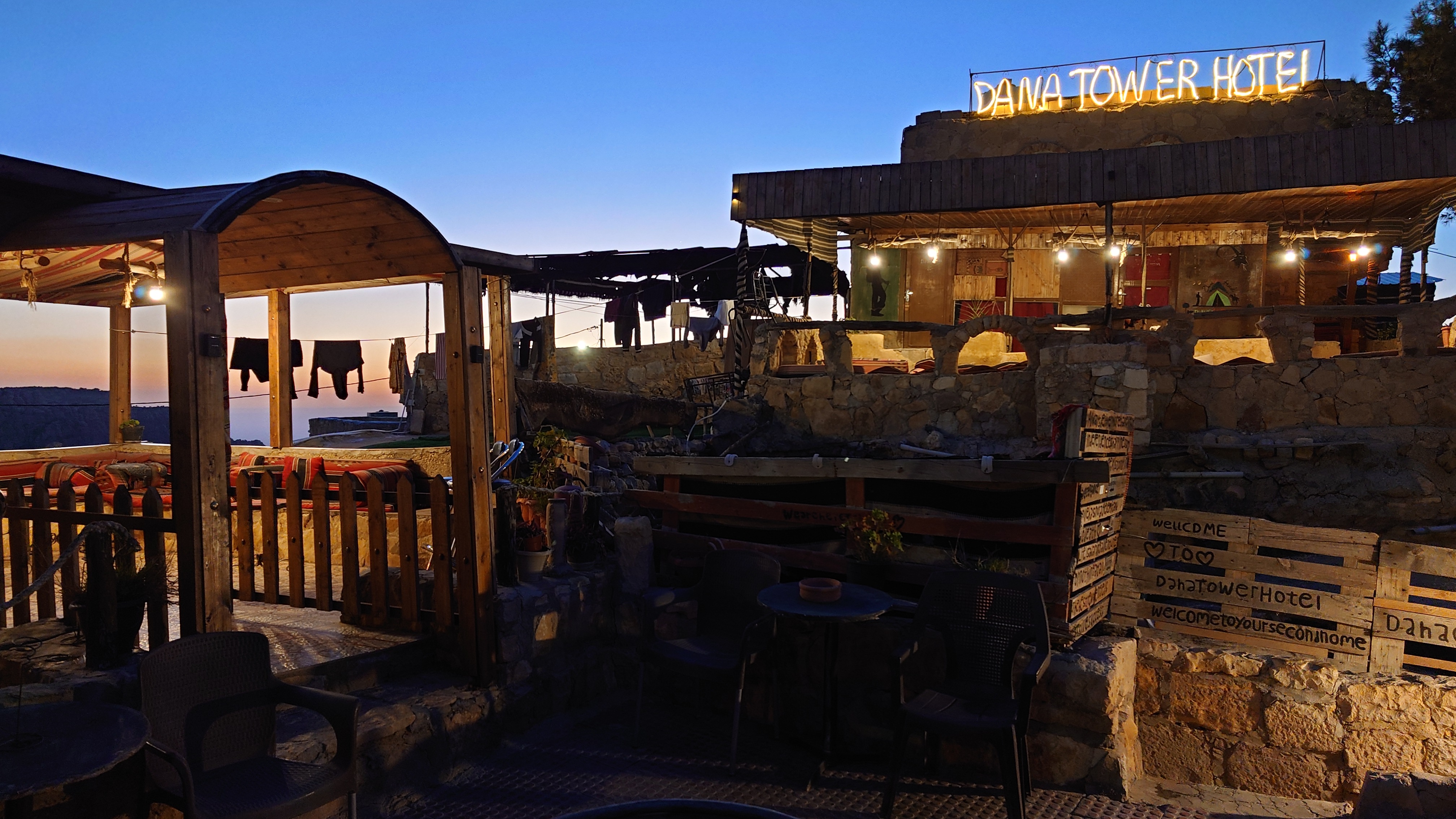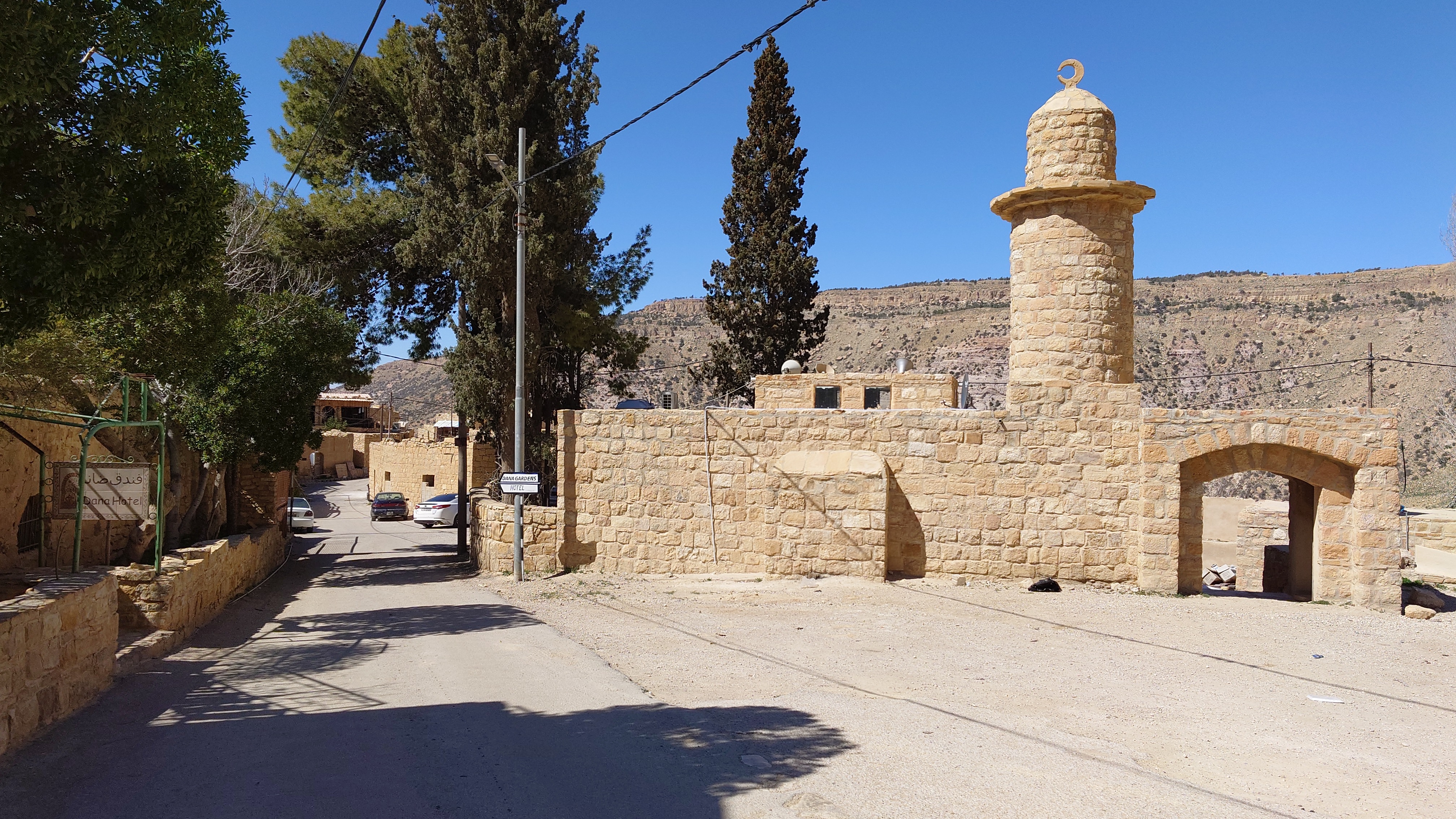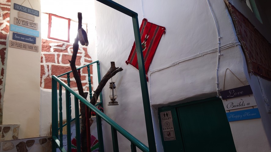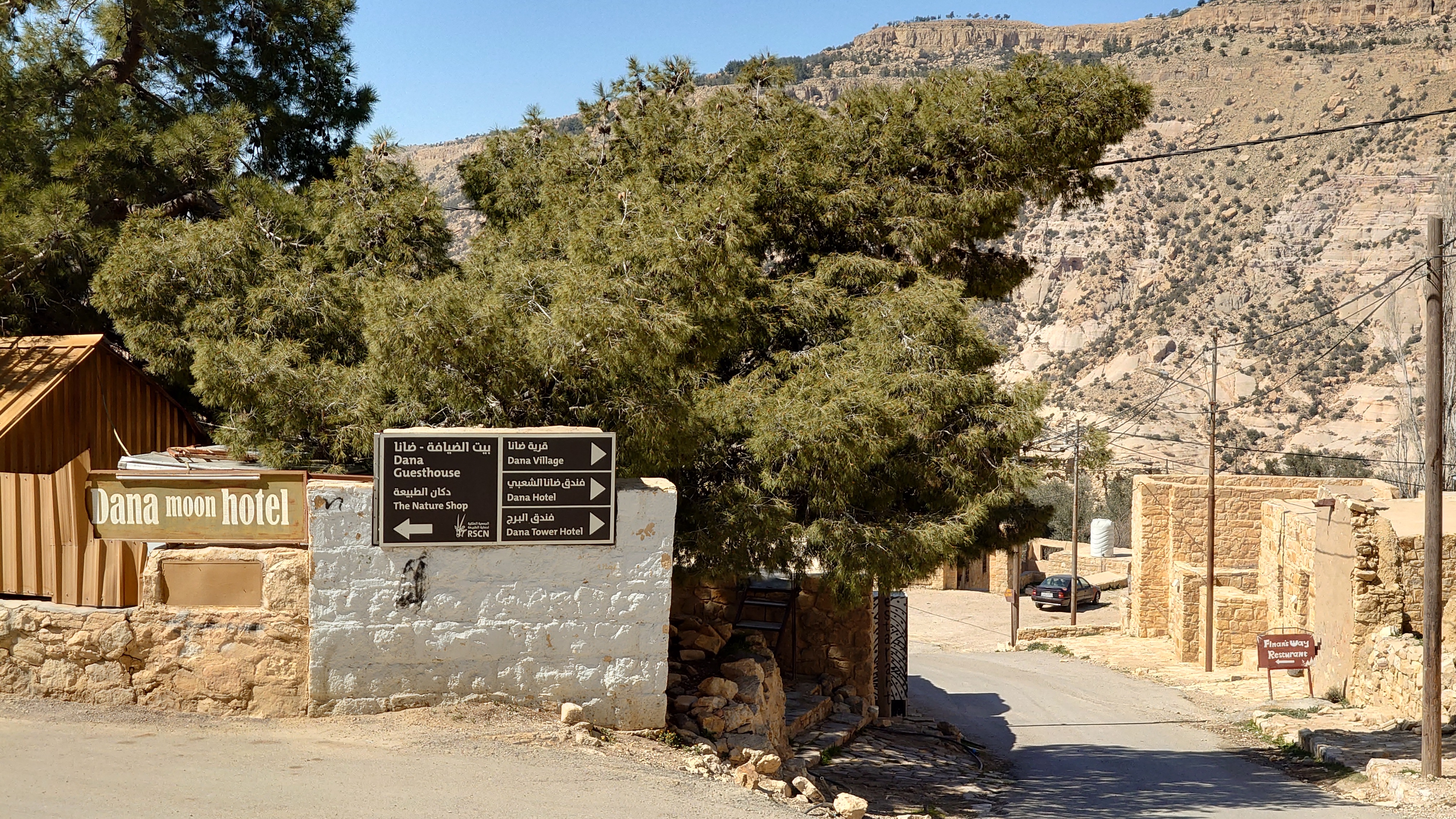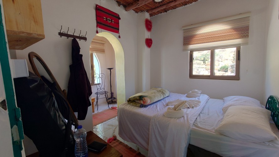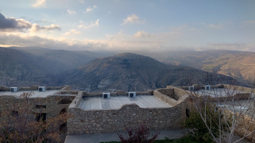 Der Ort ist relativ verlassen, besteht aber fast ausschließlich aus Fremdenunterkünften. Hiér ist an wärmeren Tagen - bzw. wenn gerade kein Krieg ist - sicherlich viel Wandertourismus. Ich habe mich für gnadenlose 10 JD ist Dana Tower Hotel eingebucht. Es ist ein Klötzchenwirrwar aus Mini-Zimmerchen, die man über schmale Treppen und Leitern erreicht. Auch ein Turmzimmer gibt mit Blick auf das imposante Tal. Tatsächlich bin ich nicht der einzige Gast heute.