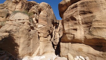 Den Tag über bleibt es unter 10 Grad. Es geht hinab ins Wadi unter meiner Übernachtungsstätte in eine faszinierende, schmale Schlucht. Ich soll laut Karte gleich wieder hinaus. Nee. Das muss ich mir anschauen und lasse meinen Rucksack zurück, um ein wenig hindurch zu wandern. Das würde auch Spaß machen: Von hieraus bis ins Jordantal durch die Schlucht. Viele quiekende Vögel haben hier ihre Nester.