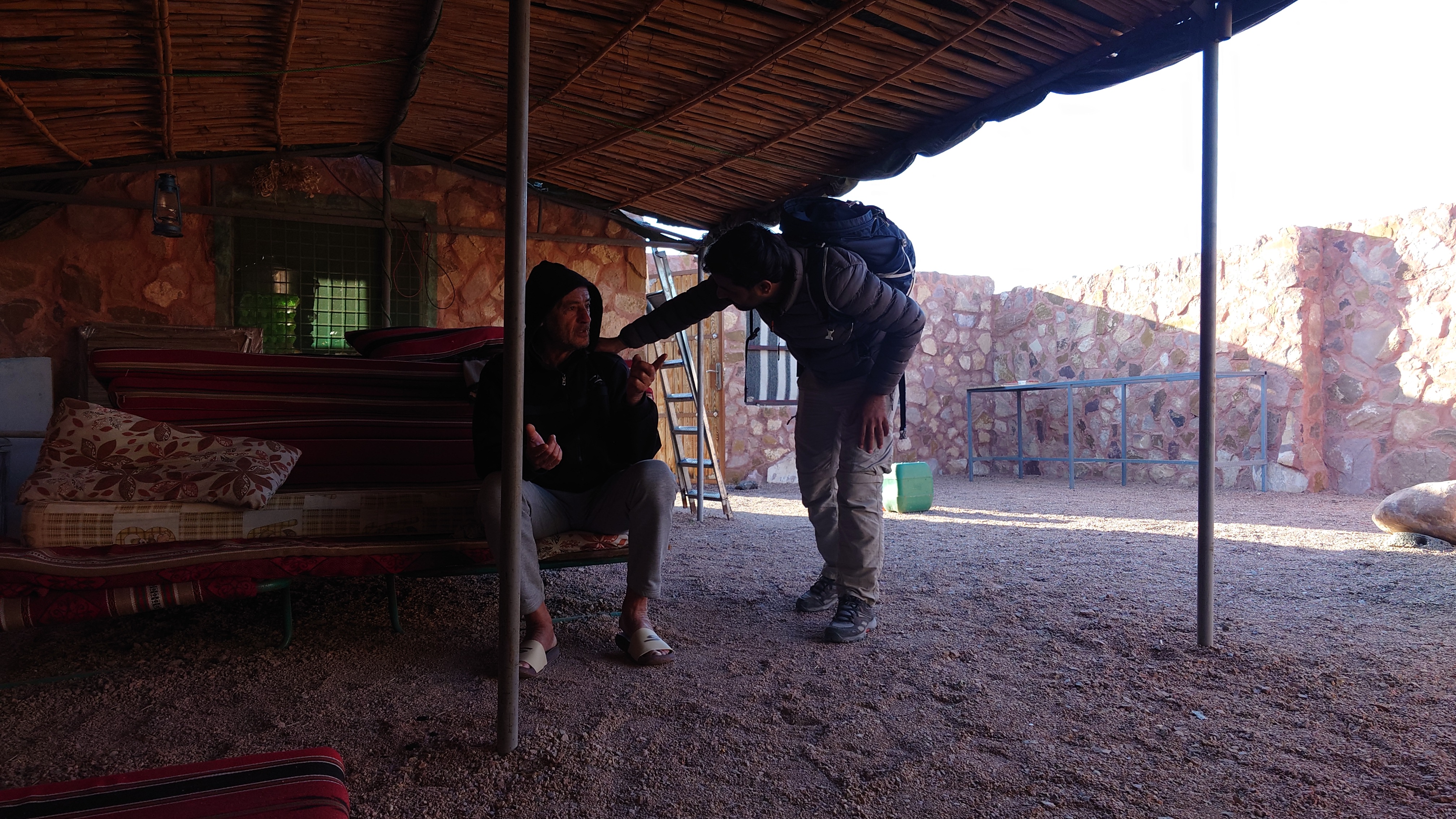Beim Frühstück treffe ich das Pärchen ebenfalls an und wir kommen ins Gespräch. Abgesehen von den Wanderern gestern sind das hier eigentlich die ersten Hiker, die in etwa das selbe machen wie ich. Er heißt Eberhard... auf französisch wird das aber anders ausgesprochen. Sie heißt Michelle. Ich errate, dass sie aus Belgien kommen. Sie sind überrascht, die meisten würden wie bei Hercule Poirot auf Frankreich tippen. Naja. Letztes Jahr waren alle französisch sprechenden Touristen Belgier. Scheinbar lieben sie Jordanien. Die beiden machen geführte Tagestouren mit ihrem Begleiter Mohammed. Alleine trauen sie sich das nicht zu. Er fährt sie zu schönen Trails und sie machen gemeinsam Tagesetappen. Abends organisiert er Unterkünfte wie diese hier. Auch sie hat der Krieg überrascht. Sie waren sogar in der Botschaft in Amman, um sich zu erkundigen. Die hat im Grunde zur Ruhe gebeten, woraufhin sie sich entschieden haben zu bleiben. Sie meinten, ein paar andere Hiker aus ihrer Schicksalsgemeinschaft im Airport wären sofort wieder nach Hause geflogen mit der nächstbesten Maschine. Und so sind wir drei jetzt hier und essen Eier, Fladenbrot und trinken Tee. Mohammed errät mich als Deutschen. Er meinte, das sähe man, wegen den langen, blonden Haaren. Er mache seit 15 Jahren solche Touren. Es stellt sich heraus, dass er ein Trail Agel des Jordan Trails von der ersten Stunde ist und den Weg 2015 mit aufgebaut und getestet hat und findet, dass "seine" Abschnitte zwischen Dana und Petra natürlich die schönsten des ganzen Trails sind. Er ist sehr überzeugt von sich. Eberhard geht schonmal zusammenpacken. Mohammed macht noch ein Foto mit Michelle und mir und meint, es wäre schon hart zur Zeit. Das Geschäft geht sehr schlecht. Eigentlich wären in Camps wie diesem abends immer gemeinsame Lagerfeuer mit vielen anderen Wanderern. Aber das ist schon seit Corona deutlich anders geworden und erst Recht mit Beginn der Konflikte im Gazasteifen ab 2024.