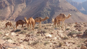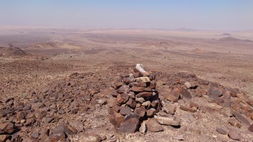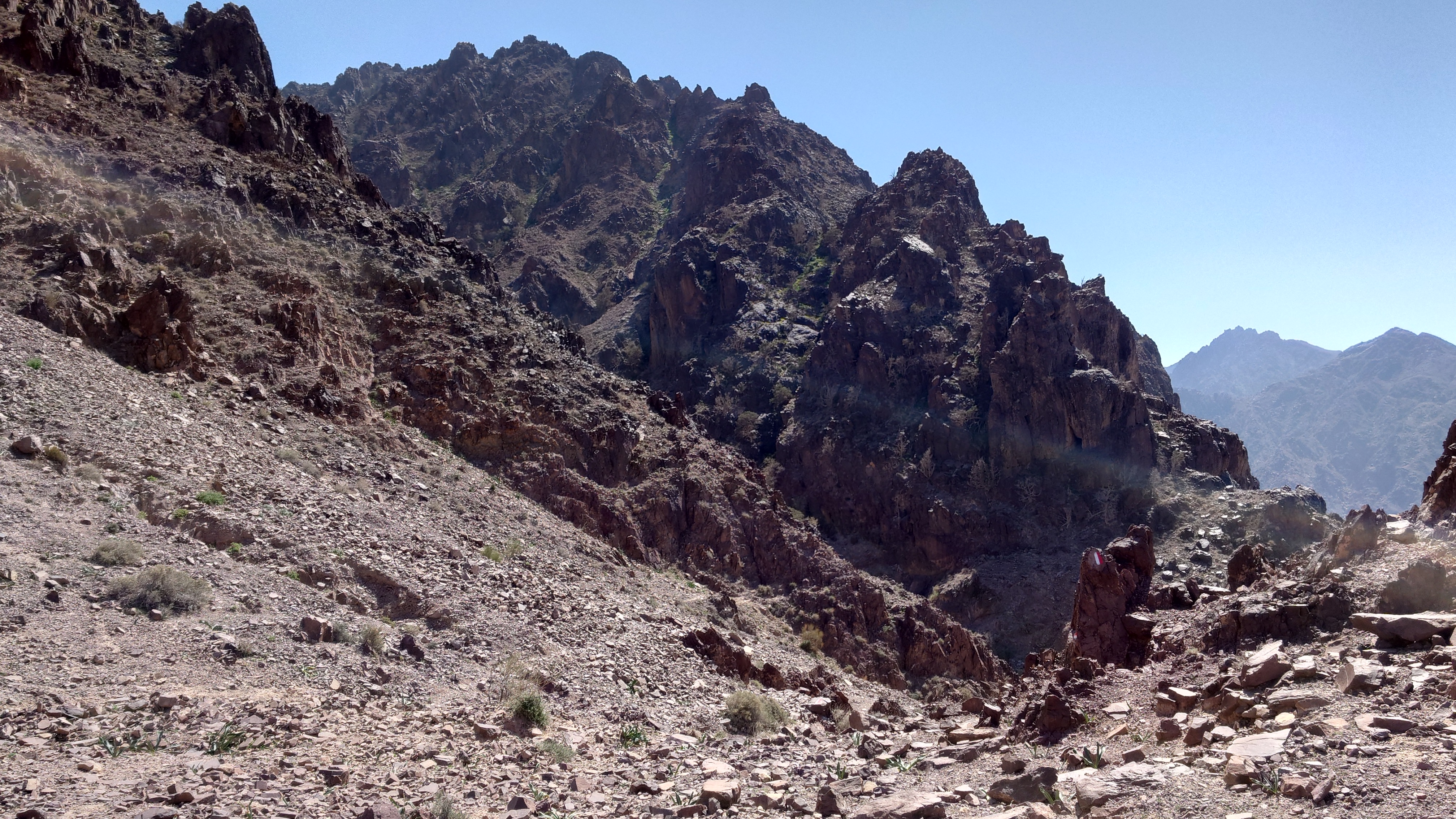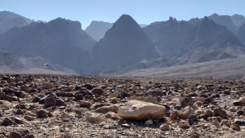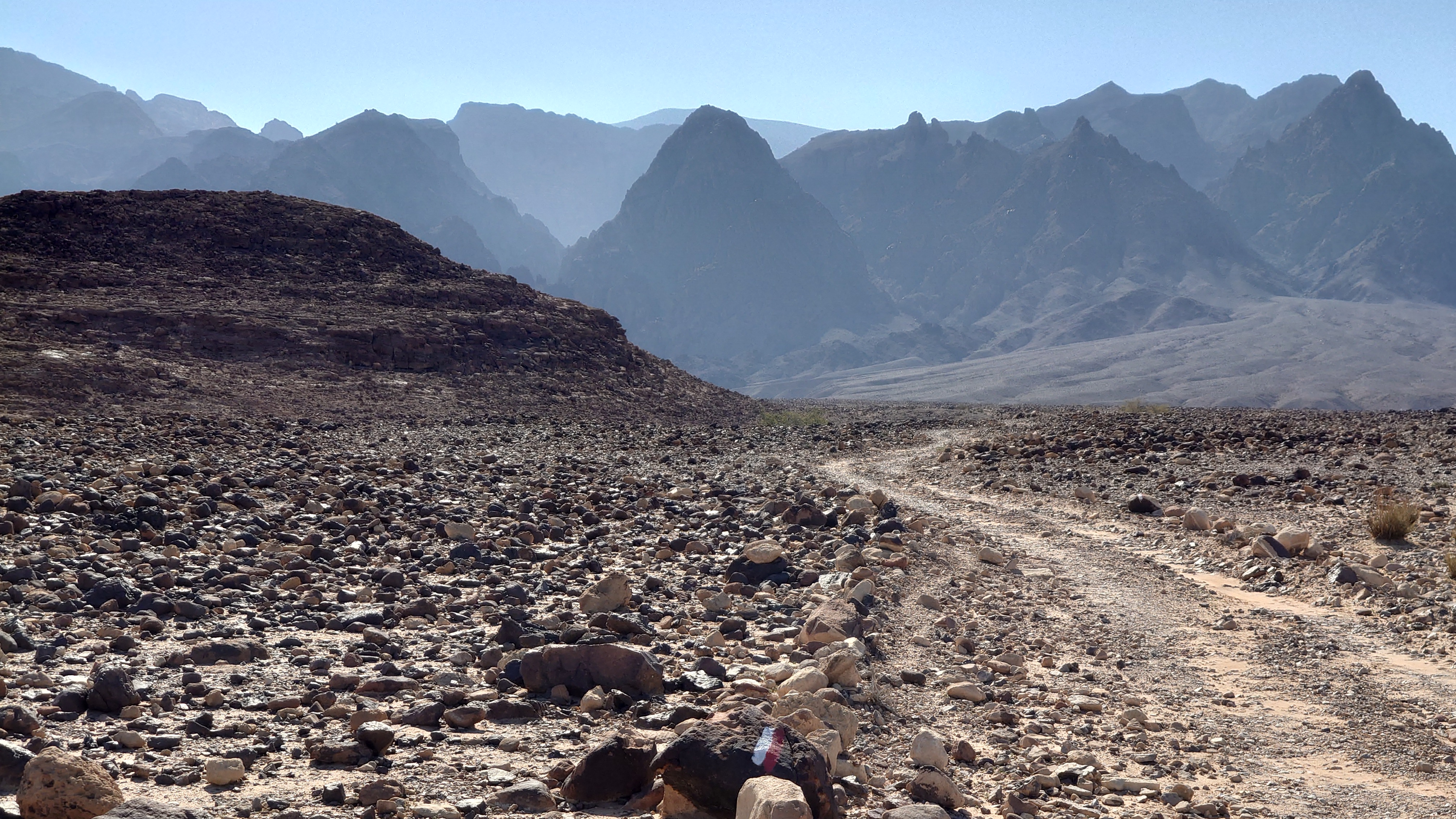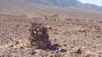 Der Weg führt lange entlang der Tiefebene an mehreren Beduinencamps vorbei. Es gibt auch Hunde, aber die Aggression der nördlicheren Camps ist hier nicht. Sie bellen zwar, aber lassen mich in Ruhe. Neugierige Köpfe gucken aus den Zelten und grüßen mich oder winken. Manchmal fliegt ein "Welcome" herüber. Es gibt wirklich niemals Missgunst. Hier unten sind Massen an Fliegen unterwegs. Es nervt gewaltig. Es weht auch kaum Wind und wird schnell warm. Der Weg ist anstrengend, weil es viel über Geröll geht, sodass auch vermeintlich ebene Streckenabschnitte zur Herausforderung werden. Irgendwann geht es endlich bergauf, sodass wenigstens die Fliegen weg geweht werden. 900 Meter geht es hinauf und es wird nicht besser. Es ist ein stundenlanger Balanceakt von Stein zu Stein und meine Füße brennen. In einem hatte Mohammed aber Recht: der Weg ist verdammt gut markiert. Alle 20 Meter ein Streifen, dazu Steinmännchen, die man schon von 2 Kilometer Entfernung aus sieht und ich den GPS Track im Grunde gar nicht brauche. Grandios. So muss das sein. Muss ich in Amman gleich als Kritikpunkt anbringen, dass "sein" Teil aber wirklich, wirklich... wirklich geil markiert ist und man das doch in den Abschnitten 1 bis 5 ebenso machen könnte.