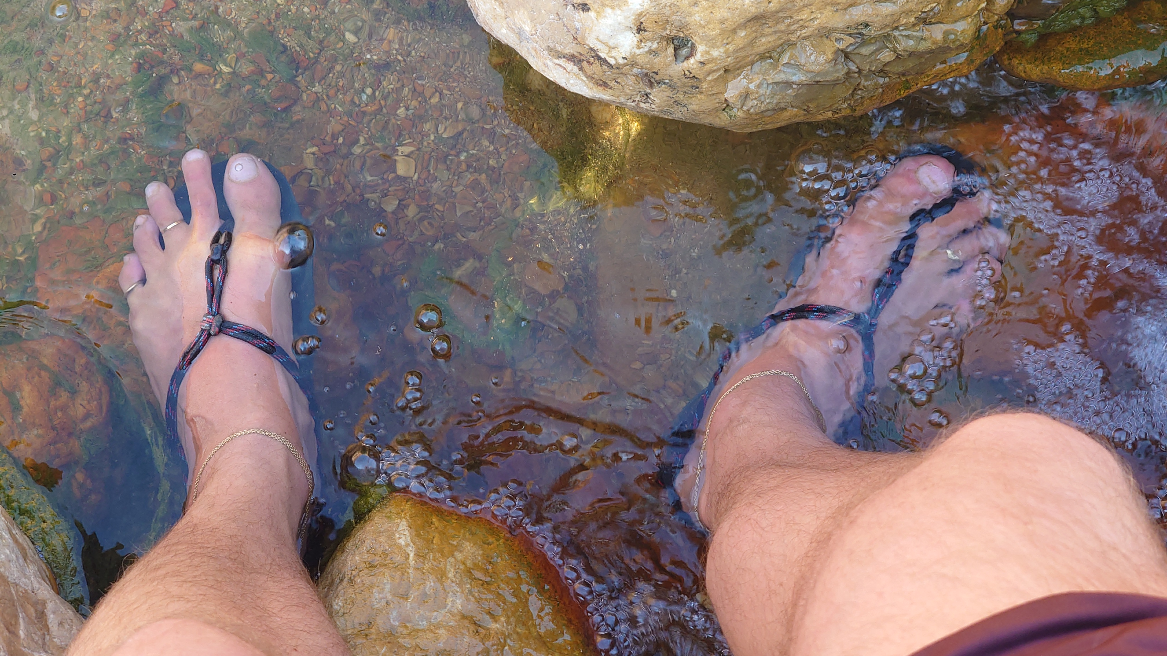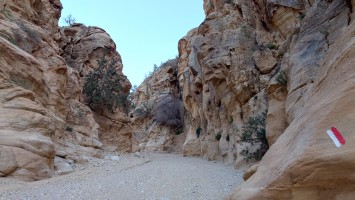 Gegen 17:30 erreiche ich tatsächlich ein Nebental, in dem es verdächtig rauscht. Und tatsächlich, es führt Wasser. Nicht viel. Ein "Wasserfall" ist das nicht, aber ein Bach, der so tief ist, dass ich meine Füße reinstecken und endlich Trinkpause machen kann. Das war anstrengend bis hierher. Zu anstrengend. Erstmal Fladenbrot von heute Morgen und Kekse futtern und Brausetabletten im Wasser auflösen. Ein Festessen. Viel Zeit kann ich mir nicht lassen. Ich fülle meine beiden Flaschen mit Flusswasser auf. Noch 3 Kilometer durch keine Schlucht muss ich hindurch, bis ich schließlich 18:30 kurz vor der Dämmung das Ende der Etappe erreiche. Eigentlich ist es kein richtiges Ende. Ich stehe mitten im Wadi... und das war's irgendwie. Um mich herum ist es totenstill. Hmm... na gut. Ich schlage mein Zelt im Flussbett auf. Dort ist es sandig und eben. Regen ist nicht angekündigt, dann wird es sich wohl über Nacht nicht adhoc füllen. Ich baue mein Zelt auf. Es wird auch schon kalt. Schon Bemerkenswert, dass ich während der 12 Stunden Dunkelheit jetzt dort drinhocke. Es ist so still, dass wirklich alles zum ein Vielfaches lauter erscheint draußen. Gruselig. Irgendwann vernehme ich einem sehr leises, weit entferntes Fliegeralarm-Echo von den Berghängen widerhallen. Ein Stein kullert irgendwo herunter. 18:48 wird auch irgendwo Allah gerufen. Dann ist es dunkel und nichts ist zu hören.