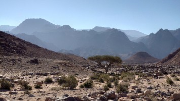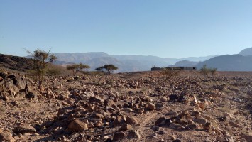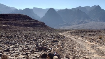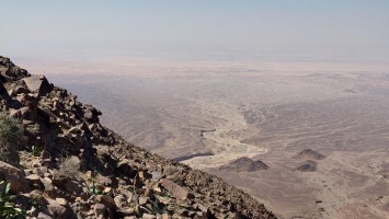 Je höher ich komme, desto mehr erstreckt sich unter mir eine endlos wirkende Wüstenlandschaft in den Südeesten. Da leben bestimmt Oryxe. Hier oben leider nur Fliegen, die meine Ohrmuscheln zum Hamsterrad spielen toll finden. Der Weg mündet in ein Kerbtal und es wird langsam wieder etwas grüner und schattiger. Mist. Wenn es schon schattig wird, bin ich viel zu spät dran. Gerade mal 7 Kilometer und schon 13:30 Uhr. Das ist nicht gut. Jetzt fangen meine Fußsohlen langsam an zu bribbeln. Zu viel spitzes Gestakse und jeder Schritt muss mit Vorsicht und Bedacht gesetzt werden. Es schlaucht. Gegen 15 Uhr passiere ich erst den höchsten Punkt auf etwa 1000 Metern, nur um vor mir eine Geröllhalde abwärts zu finden. Der eine Kilometer Luftline, den ich bergab muss, zieht sich über zwei Stunden. Ich bin körperlich das erste Mal am Limit. Viel Wasser habe ich noch nicht getrunken , weil ich nicht riskieren will, dass ich kein Wasser mehr habe, wenn der noch angekündigte Wasserfall doch trocken ist. Ich traue dem nicht ganz. Wo soll hier ein Wasserfall kommen. Es ist furztrocken. Ein Dromedarhirte mit Gewehr über der Schulter kommt mir entgegen. Ich frage ihn, ob gleich Wasser käme, aber er bietet mir nur was aus seinem Schlauch auf dem Esel an, den er mitführt. Nee. Das hält mein Darm ist aus, fürfhte ich. Außerdem habe ich noch 1,5 Liter. Aber ich muss was trinken, hilft nix. Mir kribbeln schon die Hände.