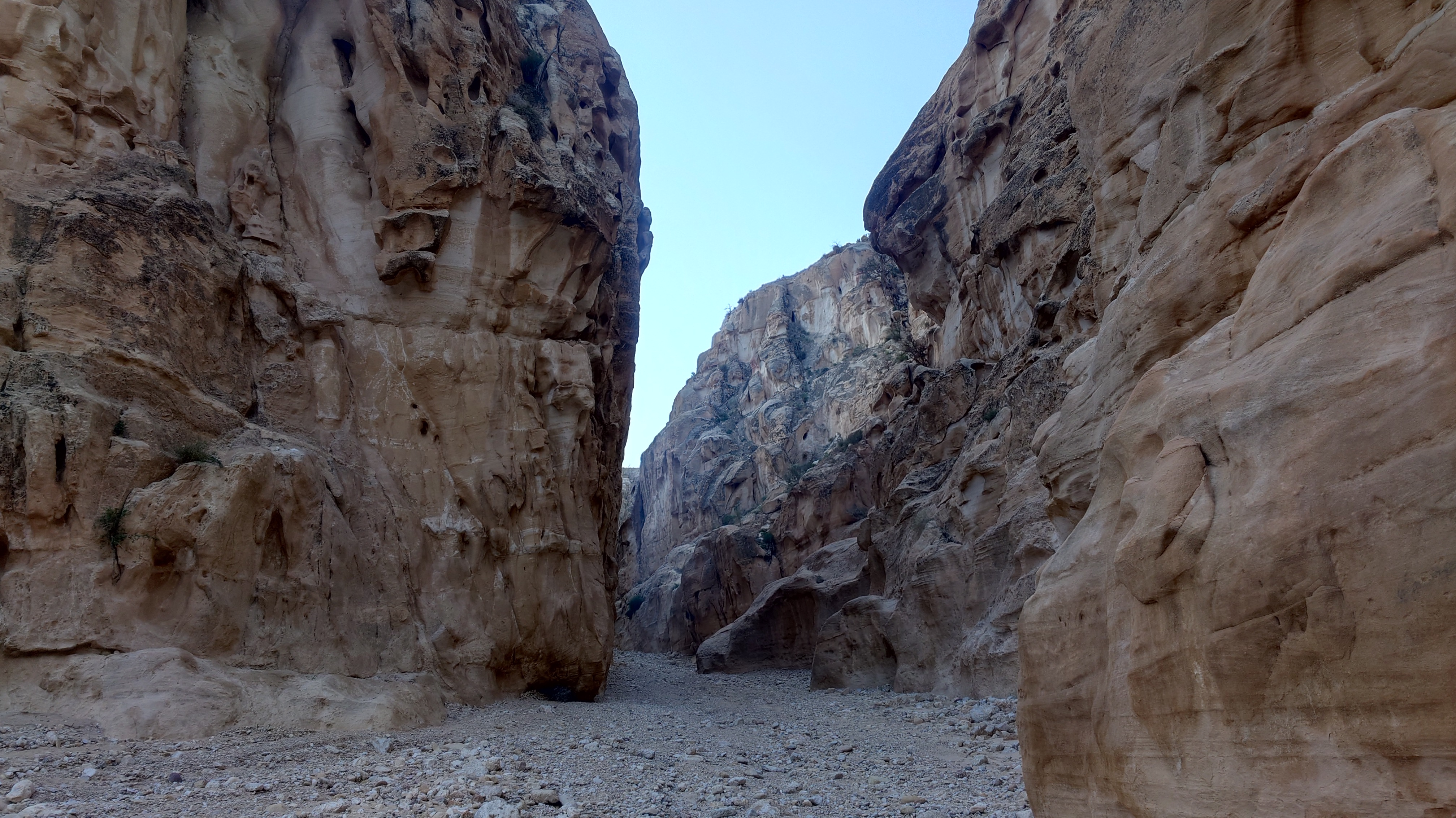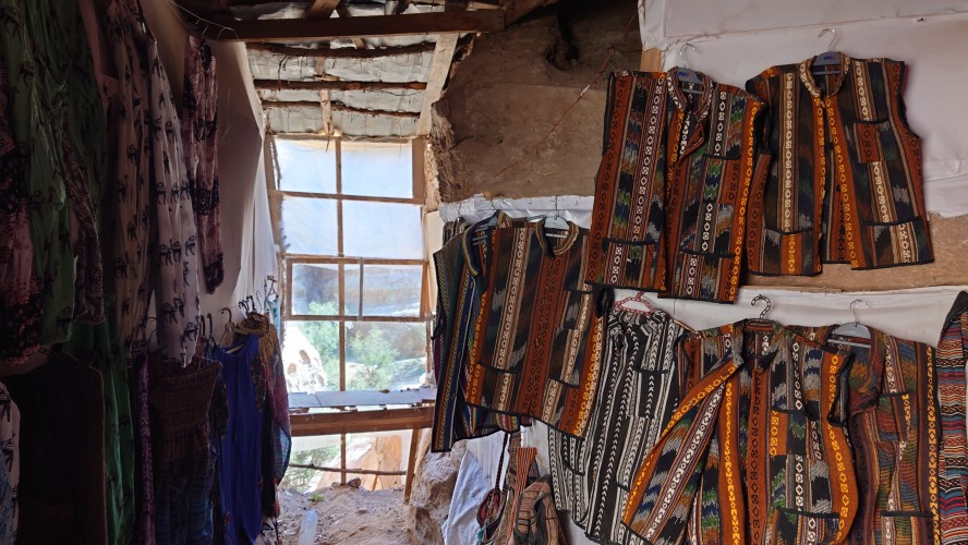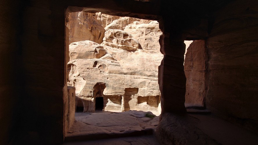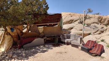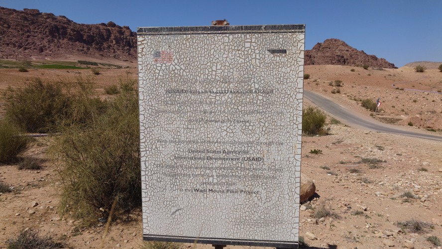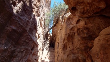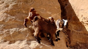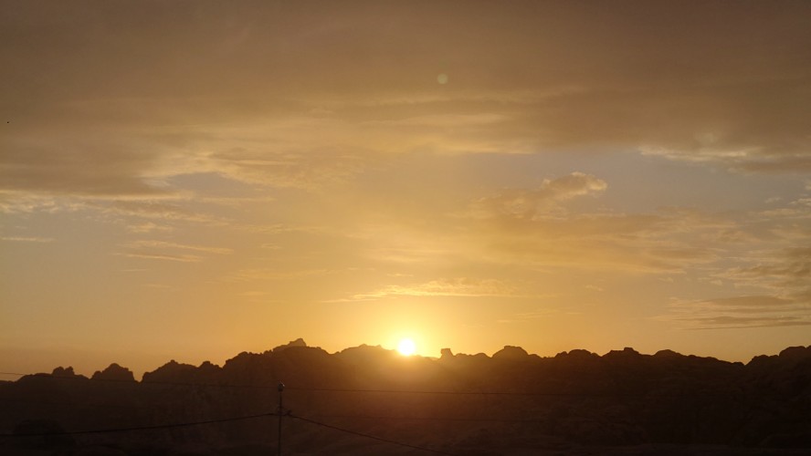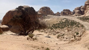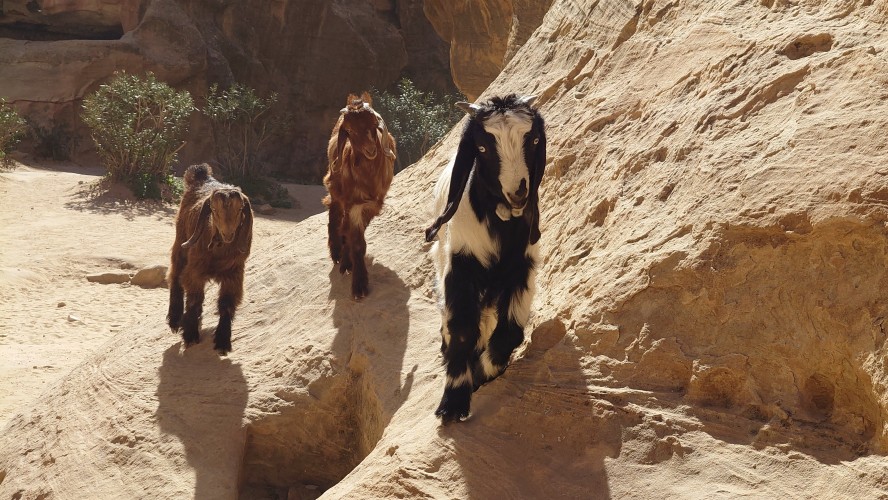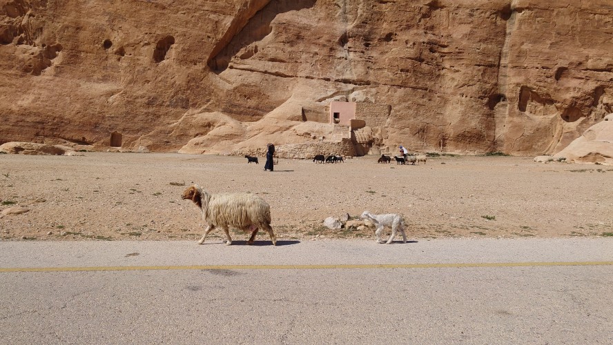 Die Piste führt schließlich zurück in die Zivilisation zu einer Straße, die zu meinem Zielort Al Beyda führt. Eine Infotafel am Eingang der Piste verrät, dass ich bereits auf einem Wandernetzwerk im Einzugsgebiet von Petra unterwegs bin. Mein Ziel ist nah. Aber erst einmal 8 Kilometer Straße. Na ob da nicht vielleicht ein... 30 Minuten bin ich unterwegs, bis schließlich ein... natürlich will ich mitfahren. Wir fahren die restlichen 5 Kilometer hinab nach Al Beyda. Von dort aus ist es nicht mehr weit bis zum Etappenziel mit dem Namen Little Petra. Die Umgebung hier ist eindeutig touristisch geprägt. Viele Camps: Beduin Camp, The Rock Camp, Little Petra Camp,.Petra View Lodge... nur eines fehlt komplett: die Touristen. Ein großer Parkplatz vor dem Eingang in den sogenannten "Vorort" von Petra zeugt davon, dass hier viele Autos und Busse erwartet werden würden, wäre da nicht dieses Raketenproblem über unseren Köpfen. Shops reihen sich aneinander mit allerlei Tourikram,.in denen Frauen versuchen etwas zu verkaufen an Menschen, die auf absehbare Zeit nicht kommen werden. Ein paar Verkäufer versuchen fast flehend eine Unterkunft an mich zu vermitteln. Der Eintritt in den Felsenstadt-Vorort ist aber frei und ich bekomme einen ersten Eindruck davon, was mich wohl morgen erwarten wird. Tempel,.Behausungen, Zisternen, Bewässerungsanlagen und Treppen sind hier vor 2000 Jahren in den Fels gegraben worden. Niemenad ist da. Nur drei Ziegen huschen einmal rein, machen ein kräftig echondes "Määäh" und schwirren wieder davon. Die Location wirkt durch das gänzliche Fehlen von Leuten natürlich umso anmutiger. Alles meins. Wenn es nicht mit solch tragischen Unständen verbunden wäre, wäre es wohl der ultimative Traum eines jeden Besuchers, diese Stätten für sich allein zu haben. Aber auch hier häulen, während ich langsam von Bauwerk zu Bauwerk schlenderte, zwei Mal die Fliegersirenen los. Es rummst zweimal dumpf aus der Ferne und echot durchs das Kerbtal der Felsenstadt.