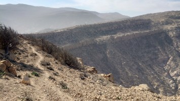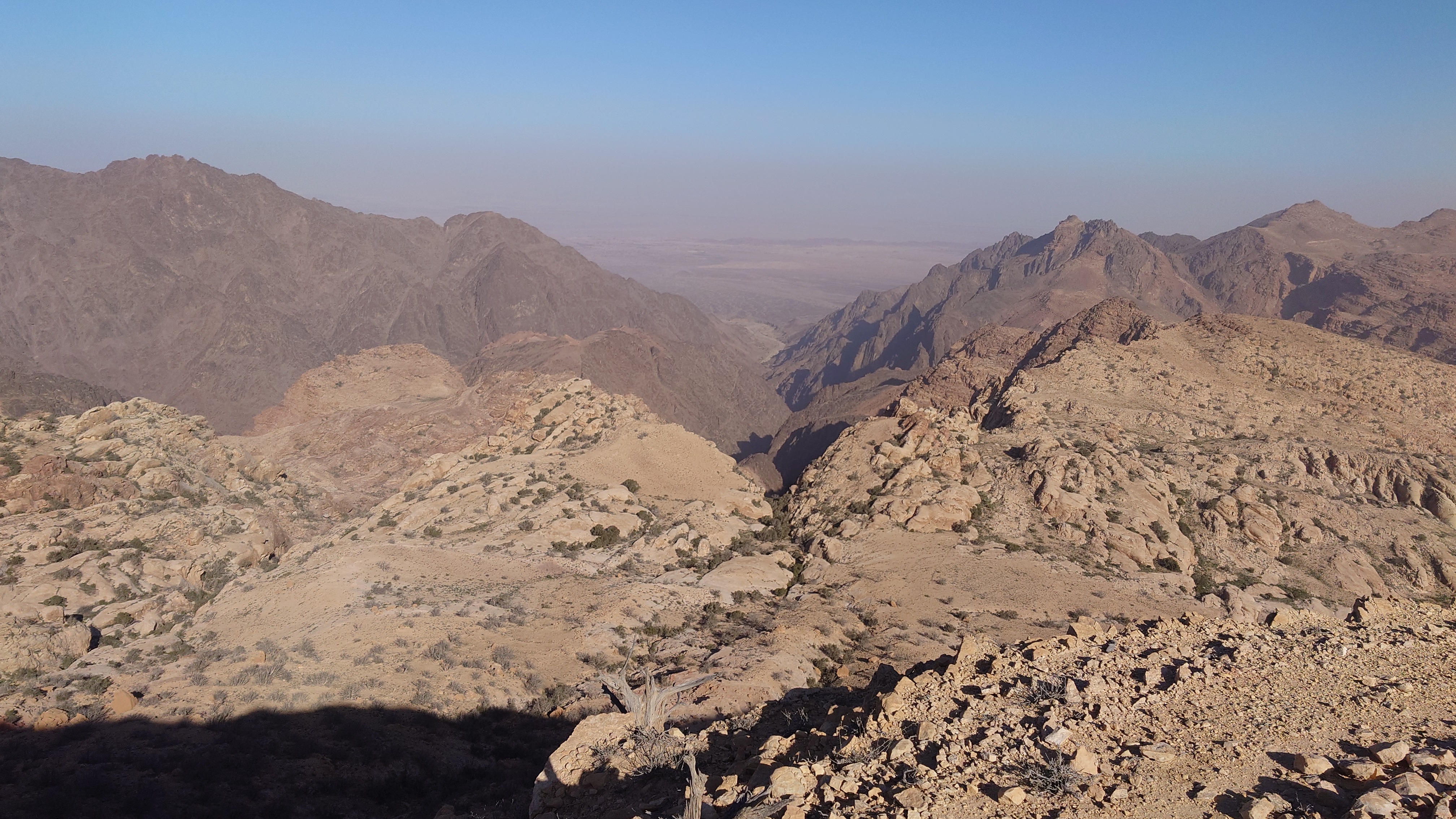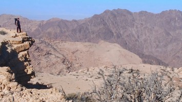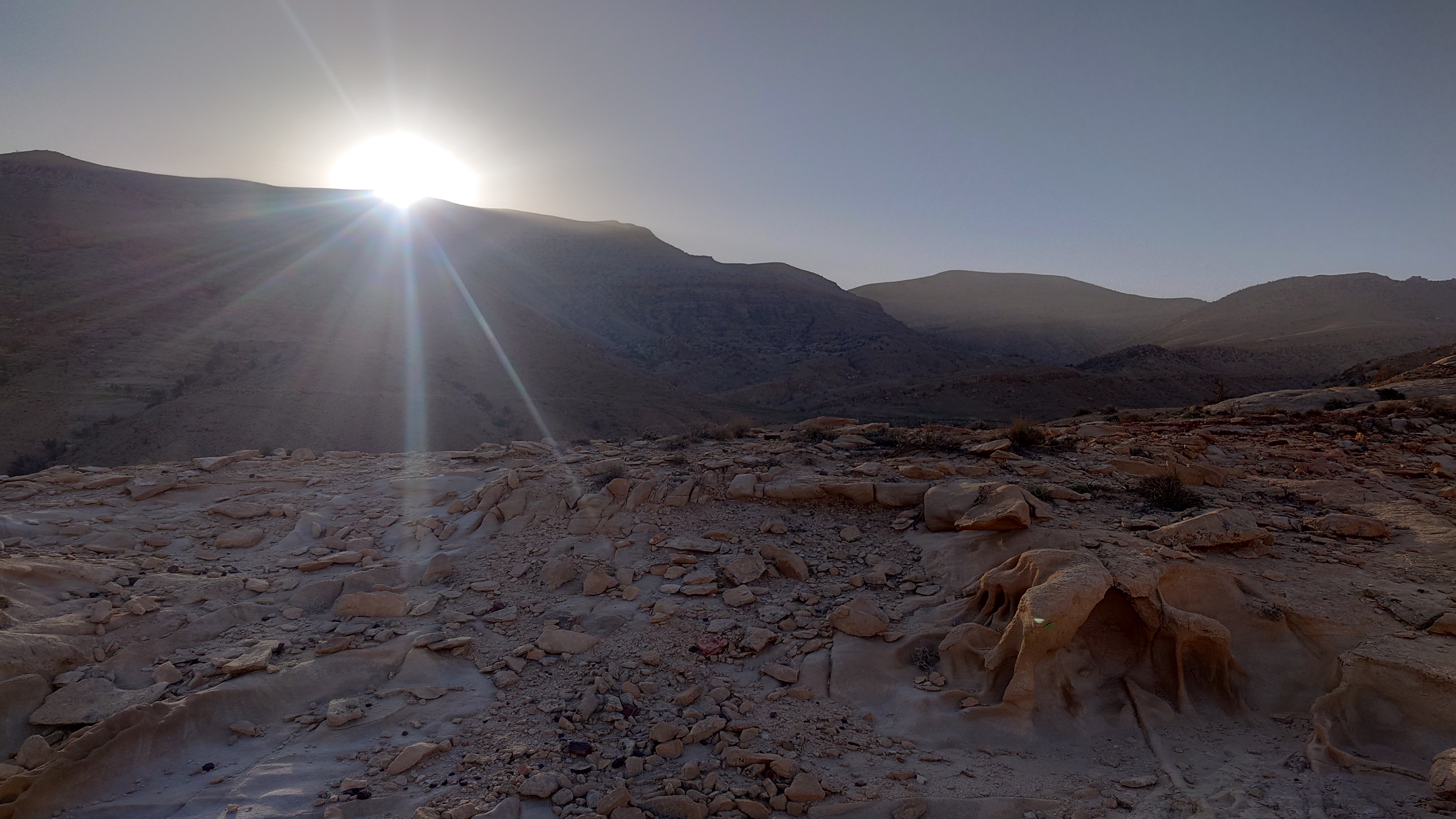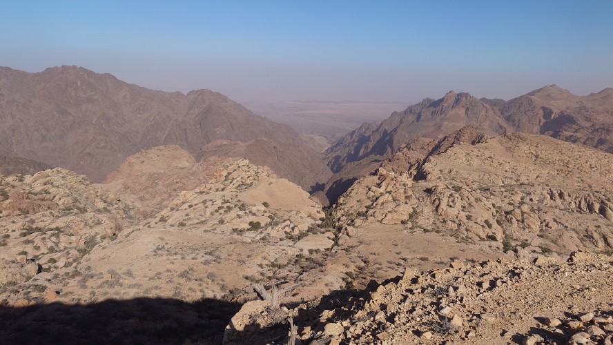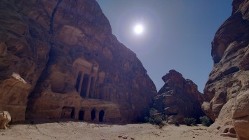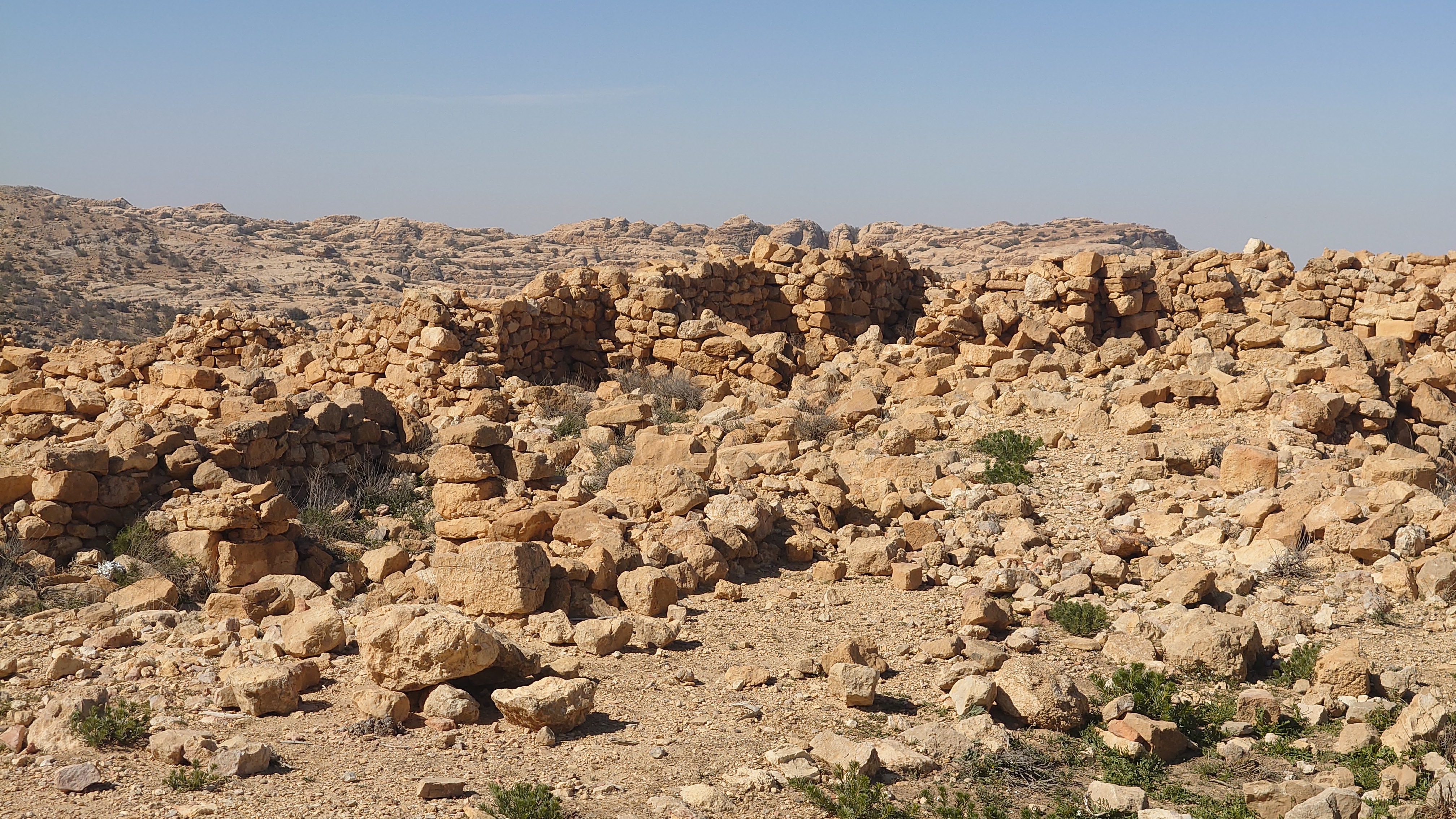 Die Piste führt schließlich zurück in die Zivilisation zu einer Straße, die zu meinem Zielort Al Beyda führt. Eine Infotafel am Eingang der Piste verrät, dass ich bereits auf einem Wandernetzwerk im Einzugsgebiet von Petra unterwegs bin. Mein Ziel ist nah. Aber erst einmal 8 Kilometer Straße. Na ob da nicht vielleicht ein... 30 Minuten bin ich unterwegs, bis schließlich ein... natürlich will ich mitfahren. Wir fahren die restlichen 5 Kilometer hinab nach Al Beyda. Von dort aus ist es nicht mehr weit bis zum Etappenziel mit dem Namen Little Petra. Die Umgebung hier ist eindeutig touristisch geprägt. Viele Camps: Beduin Camp, The Rock Camp, Little Petra Camp,.Petra View Lodge... nur eines fehlt komplett: die Touristen. Ein großer Parkplatz vor dem Eingang in den sogenannten "Vorort" von Petra zeugt davon, dass hier viele Autos und Busse erwartet werden würden, wäre da nicht dieses Raketenproblem über unseren Köpfen. Shops reihen sich aneinander mit allerlei Tourikram,.in denen Frauen versuchen etwas zu verkaufen an Menschen, die auf absehbare Zeit nicht kommen werden. Ein paar Verkäufer versuchen fast flehend eine Unterkunft an mich zu vermitteln. Der Eintritt in den Felsenstadt-Vorort ist aber frei und ich bekomme einen ersten Eindruck davon, was mich wohl morgen erwarten wird. Tempel,.Behausungen, Zisternen, Bewässerungsanlagen und Treppen sind hier vor 2000 Jahren in den Fels gegraben worden. Niemenad ist da. Nur drei Ziegen huschen einmal rein, machen ein kräftig echondes "Määäh" und schwirren wieder davon. Die Location wirkt durch das gänzliche Fehlen von Leuten natürlich umso anmutiger. Alles meins. Wenn es nicht mit solch tragischen Unständen verbunden wäre, wäre es wohl der ultimative Traum eines jeden Besuchers, diese Stätten für sich allein zu haben. Aber auch hier häulen, während ich langsam von Bauwerk zu Bauwerk schlenderte, zwei Mal die Fliegersirenen los. Es rummst zweimal dumpf aus der Ferne und echot durchs das Kerbtal der Felsenstadt.