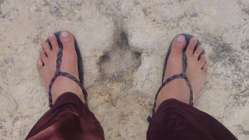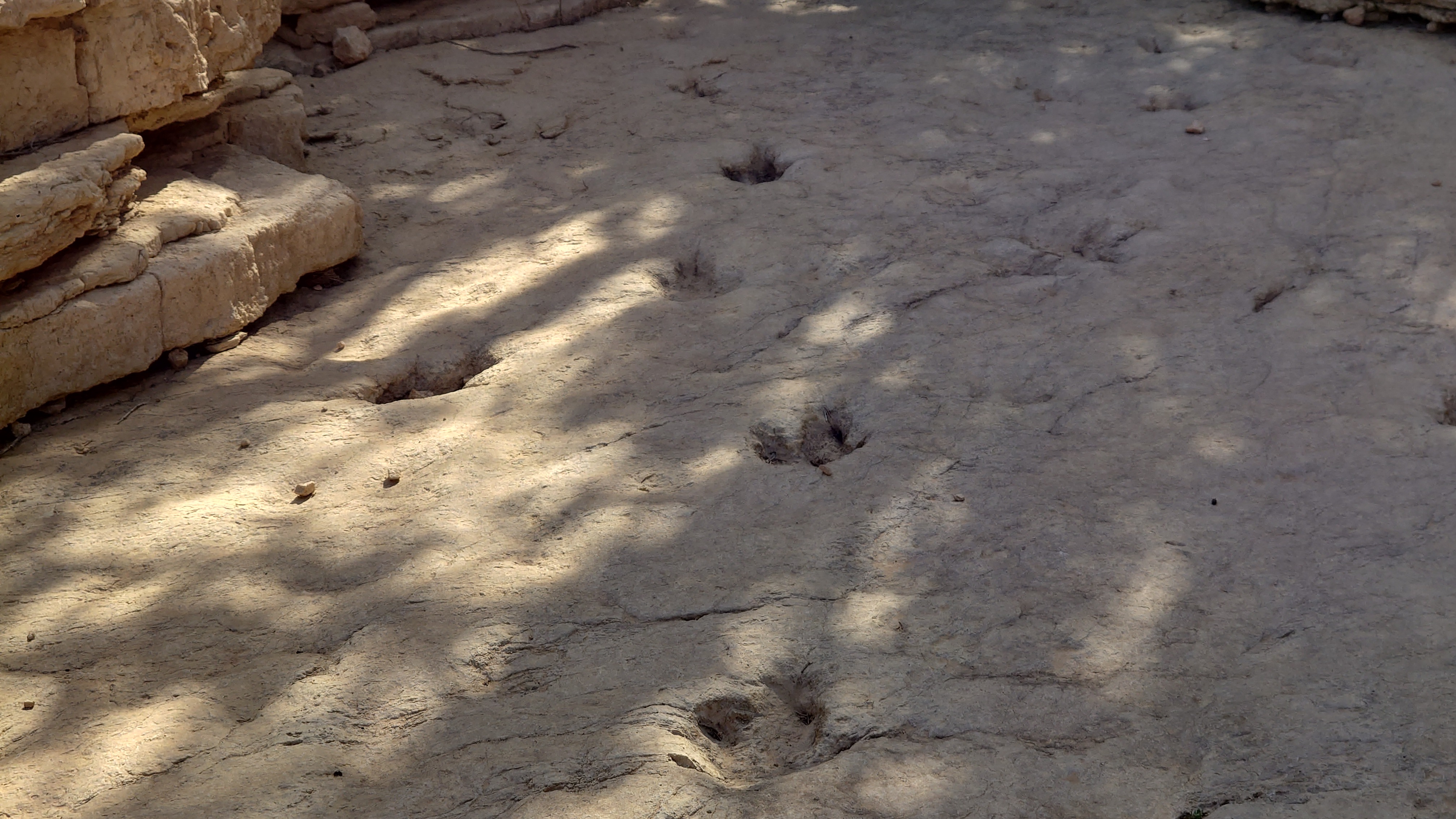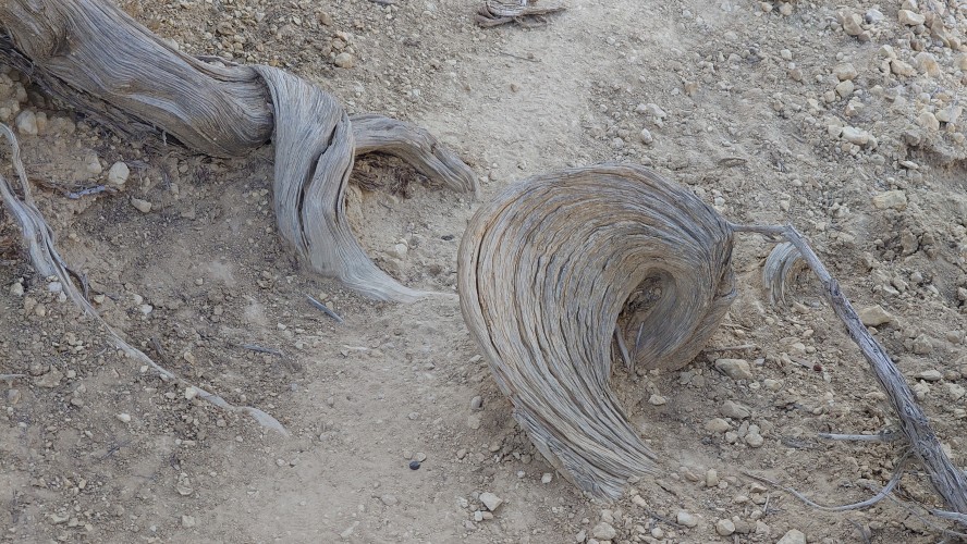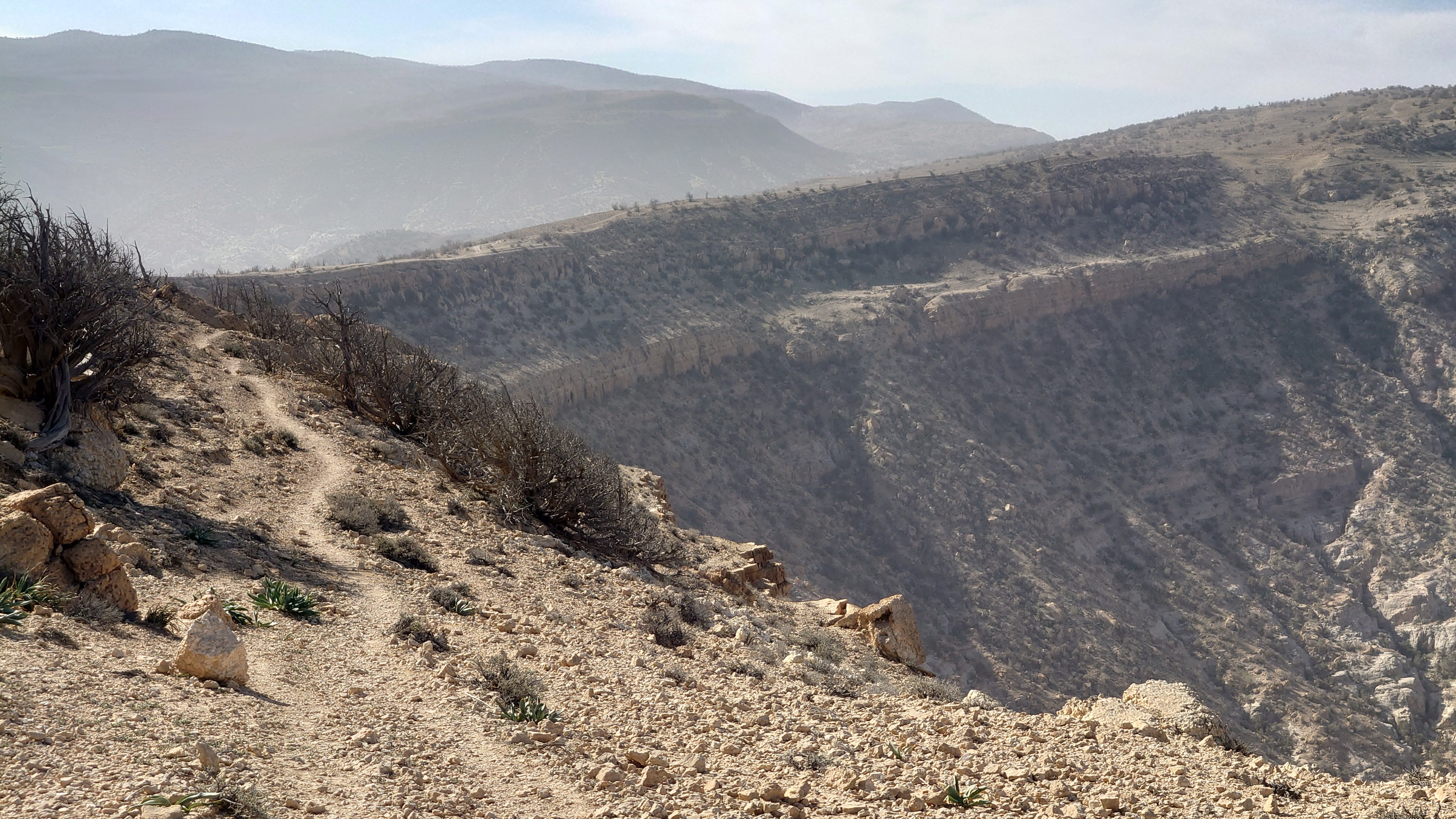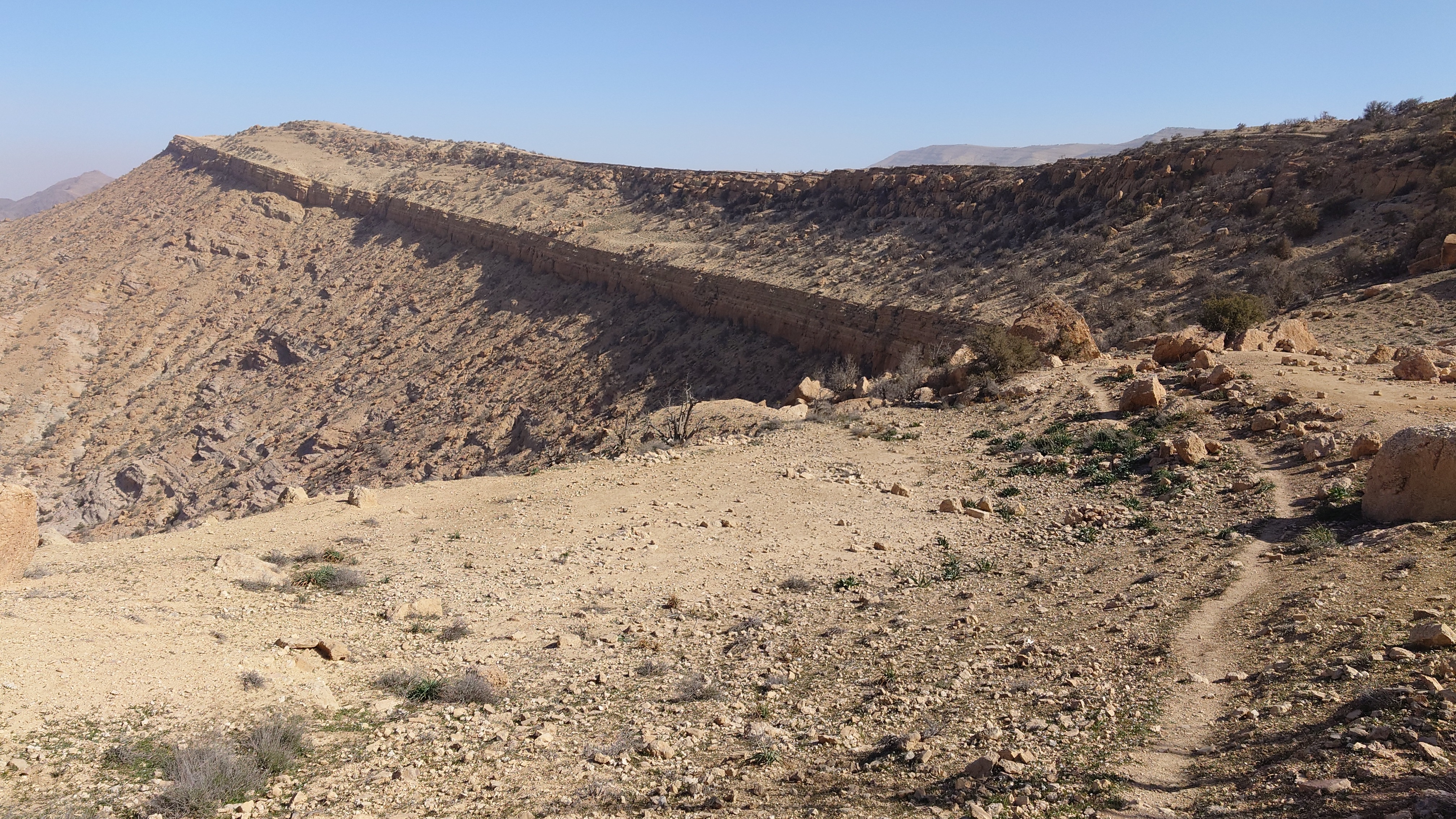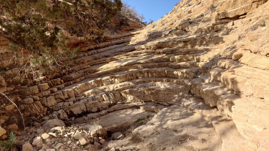 Ich treffe schließlich wieder auf den Weg, der an einer Abbruchkante entlang führt, die ein großes Tal abgrenzt. Im Gegensatz zu gestern wird der Weg zur Autobahn und verläuft genau entlang einer Gesteinsschicht, in der auffällig viele Muschelversteigerungen stecken. Es wird warm, aber erstaunlicherseise sind heute keine Fliegen mehr da. Was anstrengend bleibt, ist das permanente Kurs korrigieren, weil es meist über Sandstein gehr. Ich mäandere immer so Plusminus 50 Meter um den unmarkierten Weg herum und es kostet doch wieder Zeit.