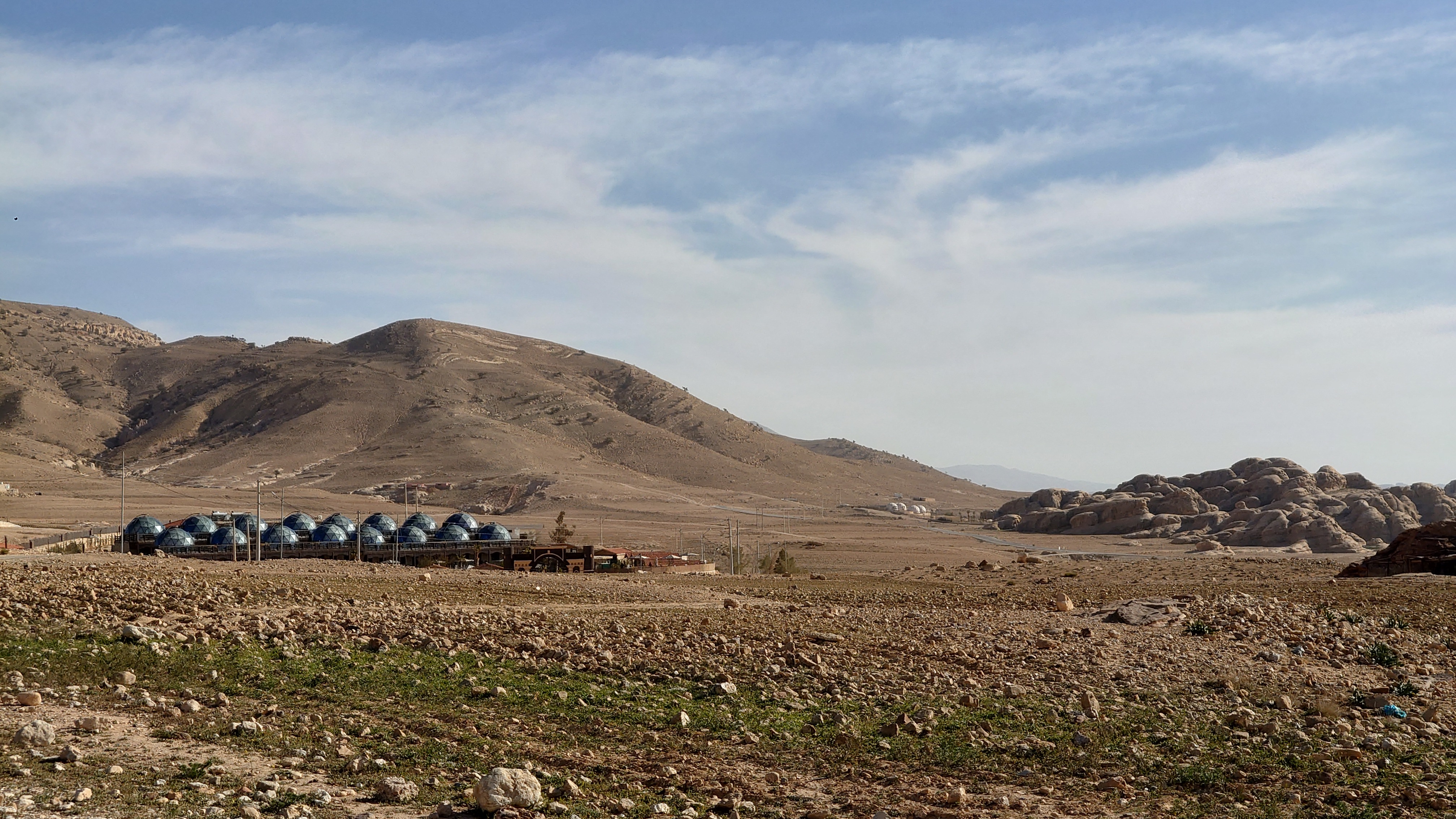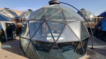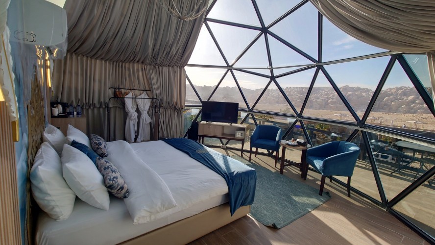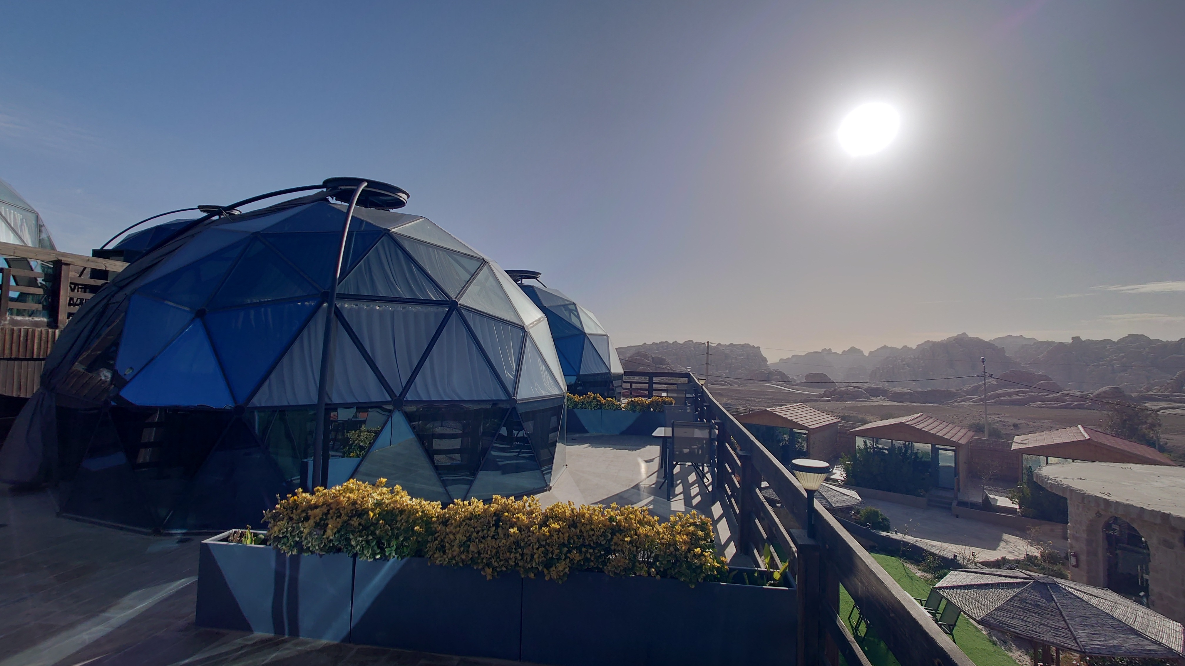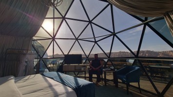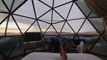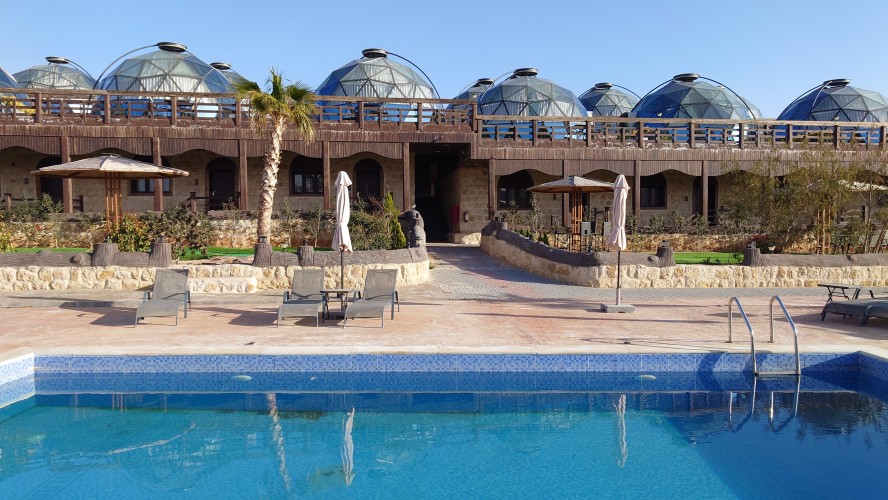 Gegen 16 Uhr begebe ich mich in den Ort, vorbei an einem Supermarkt, der komplett ausgeblutet noch genau eine Limo anbietet. Ich habe da was gesehen beim reinfahren. So ne Weltraumbehausung. Tatsächlich gibt es hier ein Grandhotel mit Sphären, unter denen man schlafen kann. Ich komme hinein und werde wieder ungläubig angeschaut. Ja, ich habe. icht gebucht und naja, vielleicht kann ich in so einer Kugel da vielleicht übernachten vielleicht? Griiiins. Ich darf. Mega Special Price. Es ist nämlich sonst niemand hier. Statt 200 JD heute nur 70. Aaaber: alles hat zu: Das Restaurant, die Bar. Kein Abendessen, kein Frühstück, kein Hotelpersonal außer dem Rezeptionisten. Aber hey. der Pool hat 12 Grad kaltes Wasser! Mehr brauche ich nicht. Ich bekomme ein Austronautenbett mit 10 Kissen unter einer Sphäre. Wieder alles meins!