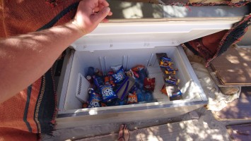 "Wo ist die Kamera", ist mein erster Gedanke. Zwei kalte Dosen Barbican lachen mich an. Ich begreife das nicht. Wer hat das hier hingestellt? Ich suche vergebens nach einer Dose mit Schlitz, auf der 1 JD steht oder so, aber ich finde nichts. Hinter den Sitzgelegenheiten steht eine Kiste mit leeren Dosen, das ist alles. Egal, ich MUSS die zwei Dosen nehmen... und Schoki... und mache ausgiebig Pause und kann mein Glück kaum fassen.