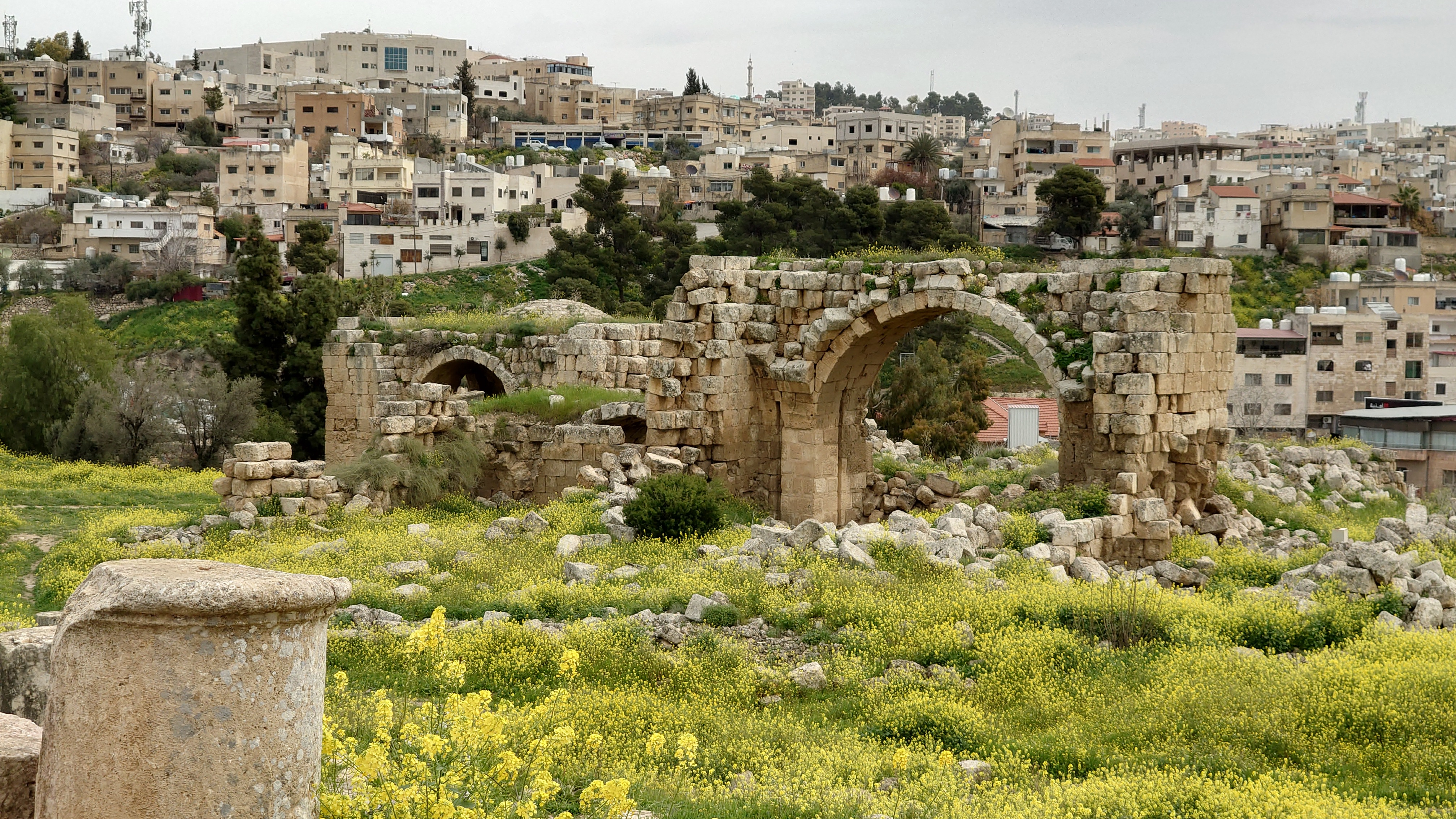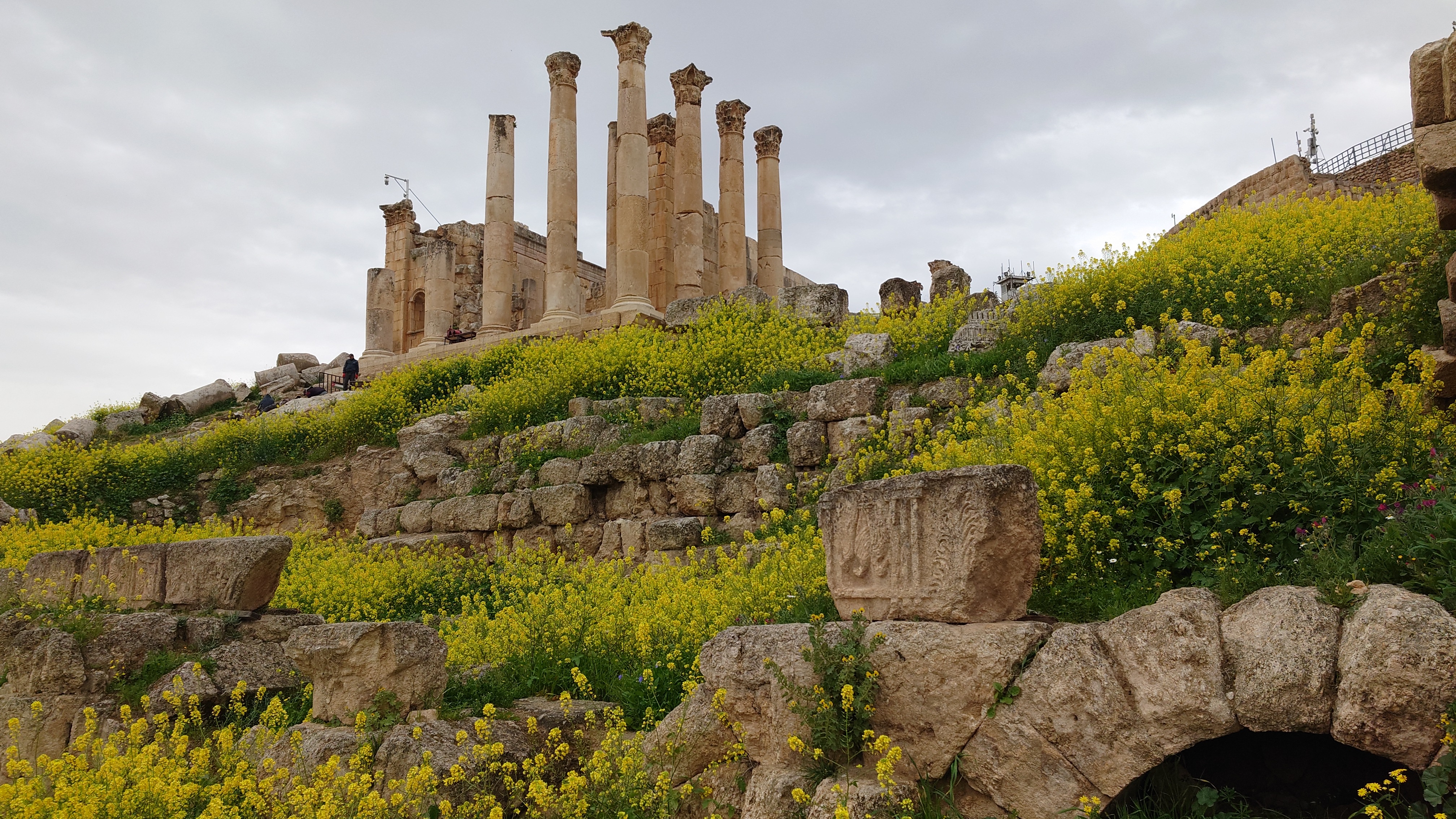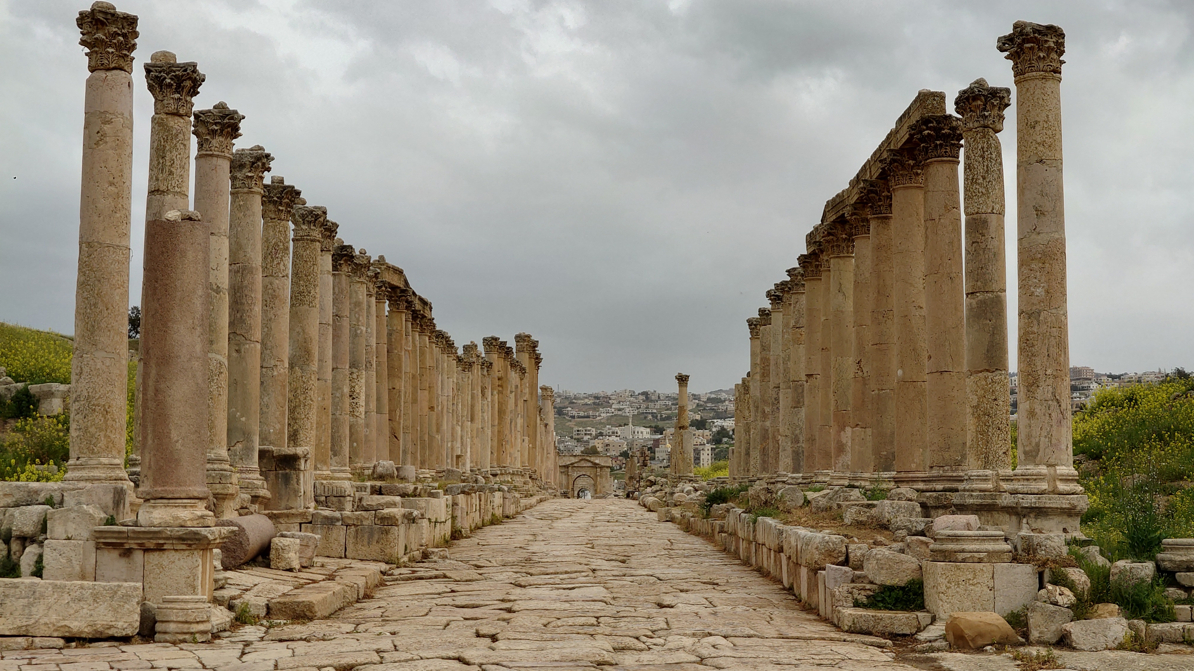 Das Areal ist groß und bietet eine Stätte einer antiken Stadt, die ebenso beeindruckend erhalten ist wie Umm Qais und es beeindruckt mich sehr, wie die alten Straßenzüge erhalten sind, mit Zebrastreifen und Gullideckeln, die sogar manchmal noch eiserne Haken zum Anheben montiert haben. Drei Stunden schlendere ich alleine durch das Areal Vieles ist griechischem Ursprungs nach Alexander dem Großen entstanden. Der Raps blüht und es duftet entsprechend intensiv. Ein tolles Bild, die Regelwolken und der Raps, dazwischen die Ruinen. Eine ganz andere Stimmung offenbart sich, wenn nicht die sonst typsichen, sandfarbenen Töne im Süden bzw. im Mai das Farbbild bestimmen.