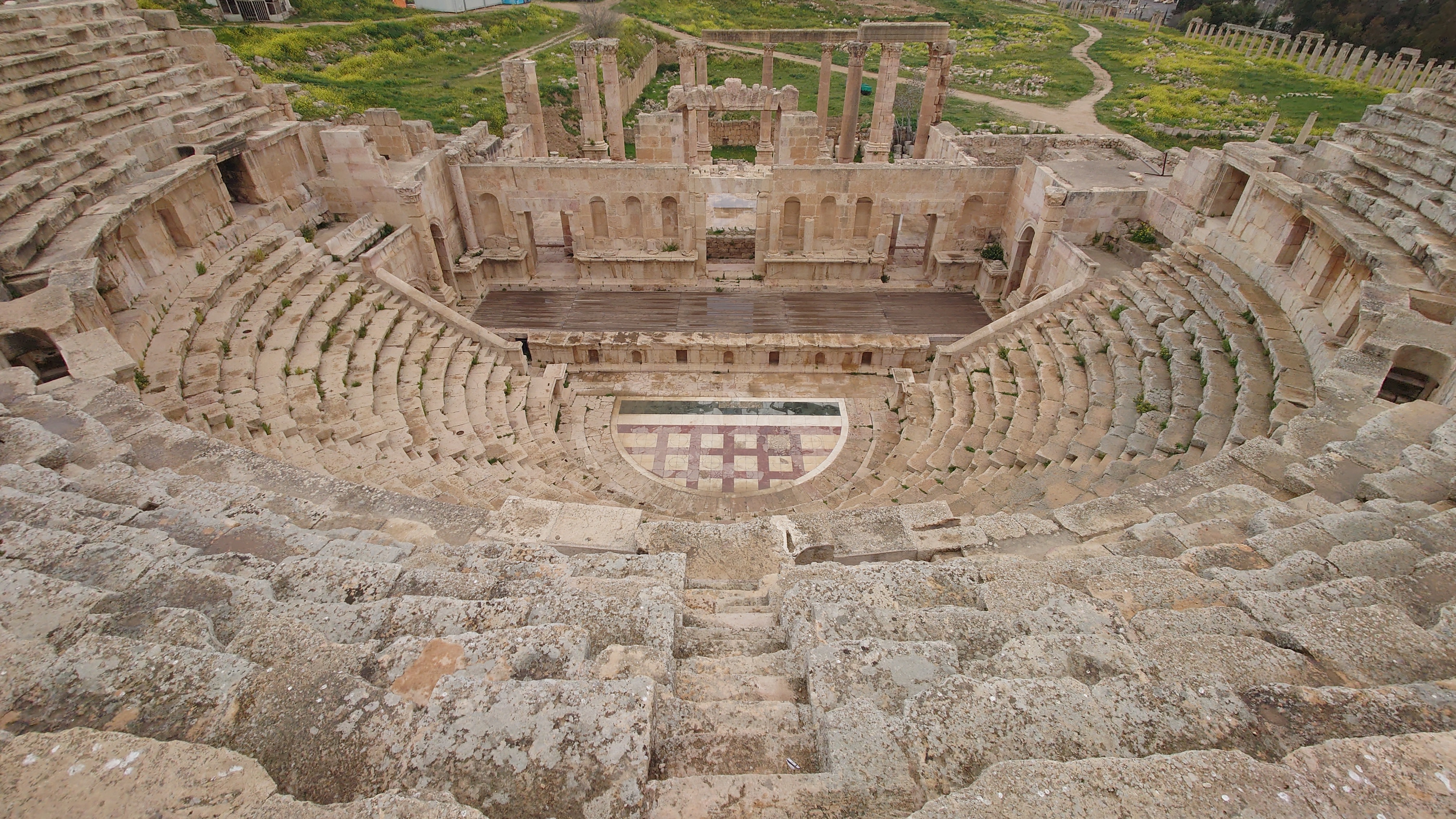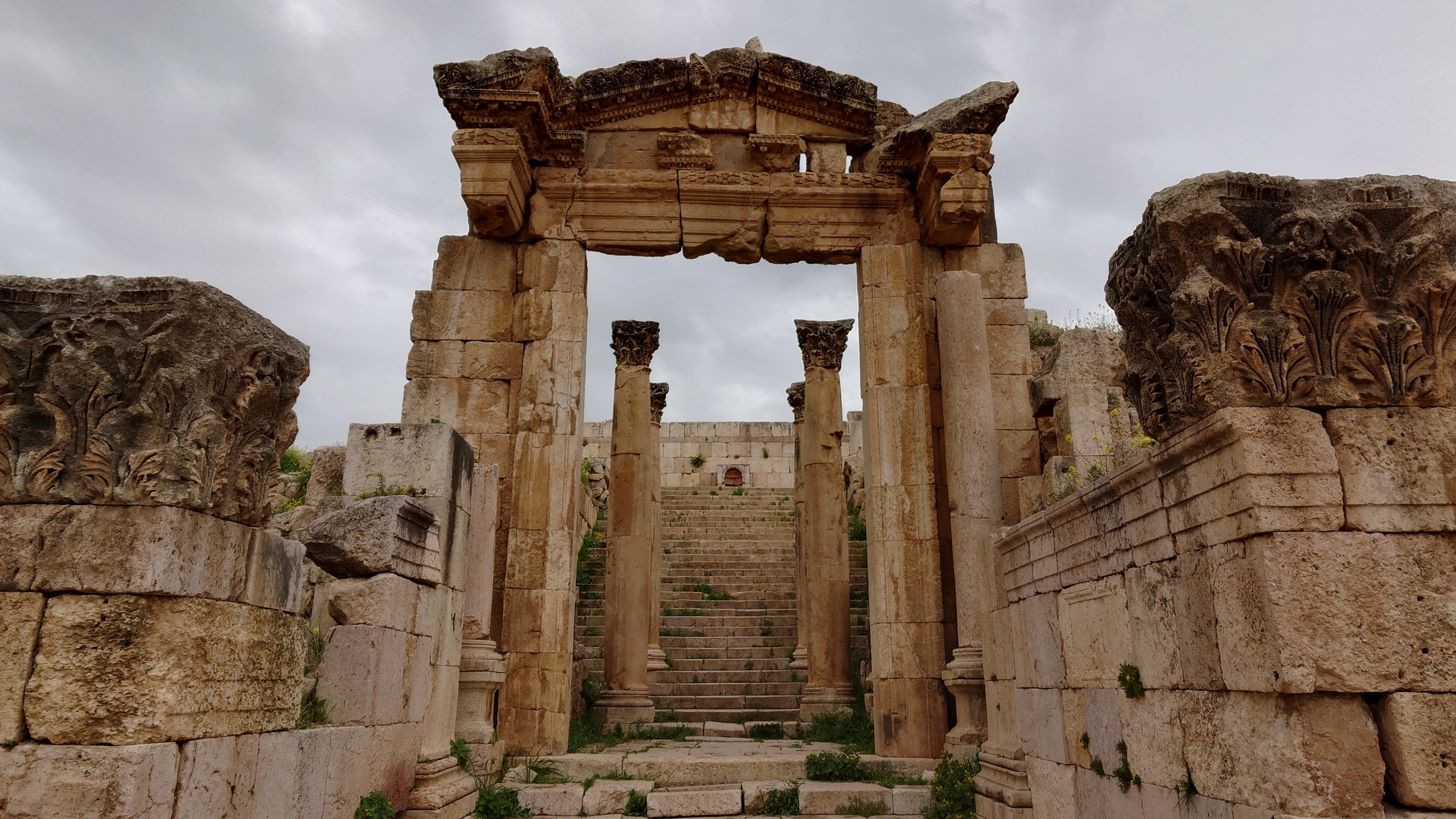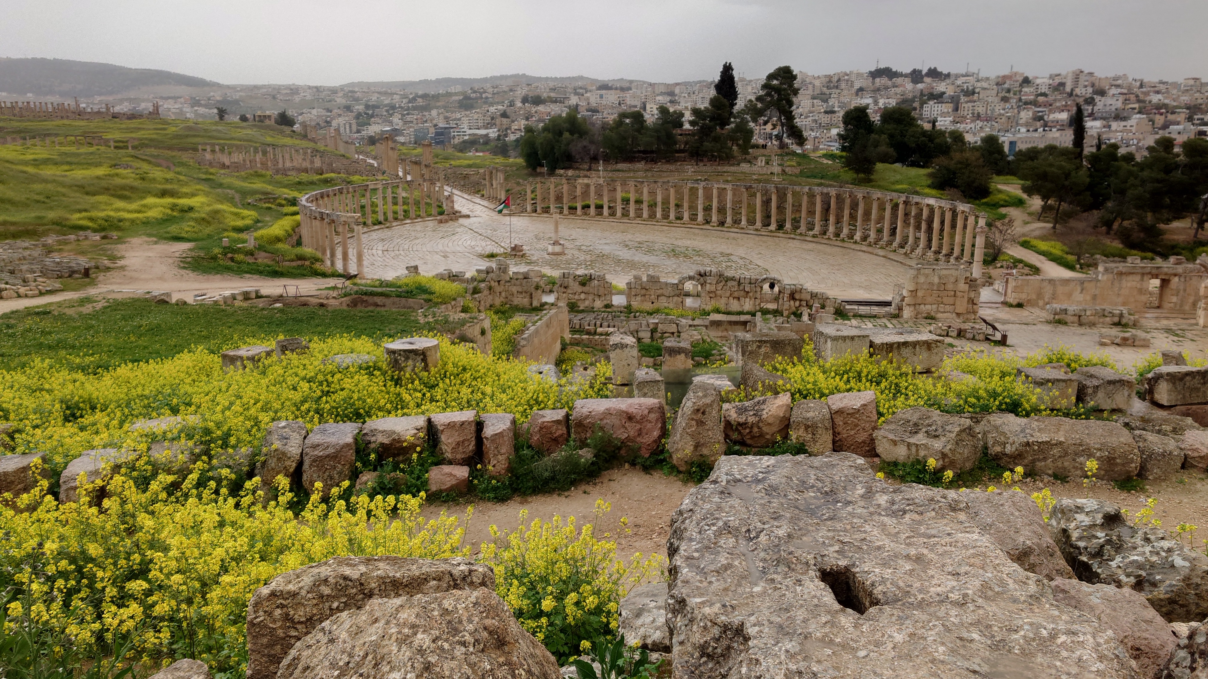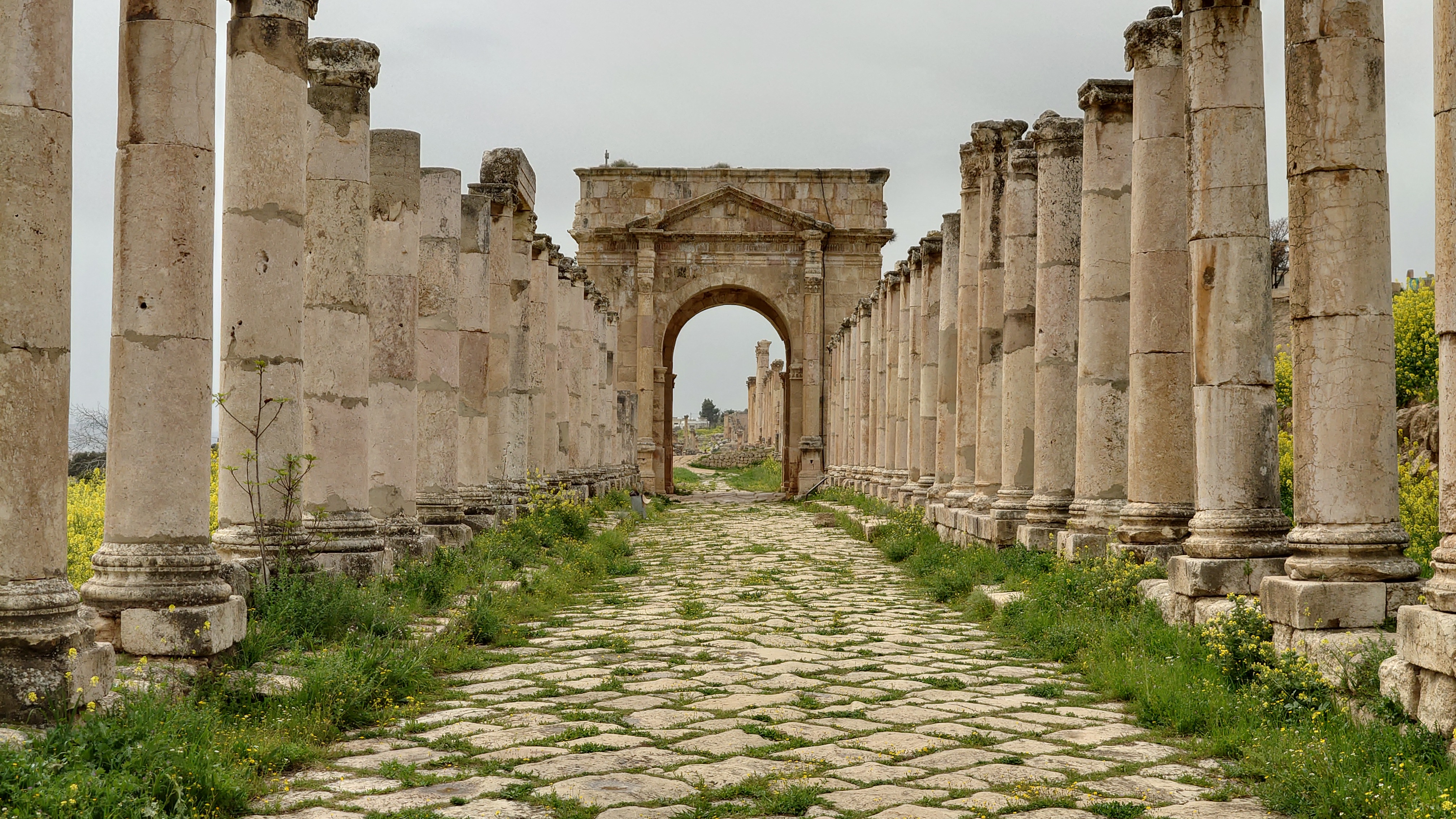 Das Areal ist groß und bietet eine Stätte einer antiken Stadt, die ebenso beeindruckend erhalten ist wie Umm Qais und es beeindruckt mich sehr, wie die alten Straßenzüge erhalten sind, mit Zebrastreifen und Gullideckeln, die sogar manchmal noch eiserne Haken zum Anheben montiert haben. Drei Stunden schlendere ich alleine durch das Areal Vieles ist griechischem Ursprungs nach Alexander dem Großen entstanden. Der Raps blüht und es duftet entsprechend intensiv. Ein tolles Bild, die Regelwolken und der Raps, dazwischen die Ruinen. Eine ganz andere Stimmung offenbart sich, wenn nicht die sonst typsichen, sandfarbenen Töne im Süden bzw. im Mai das Farbbild bestimmen.