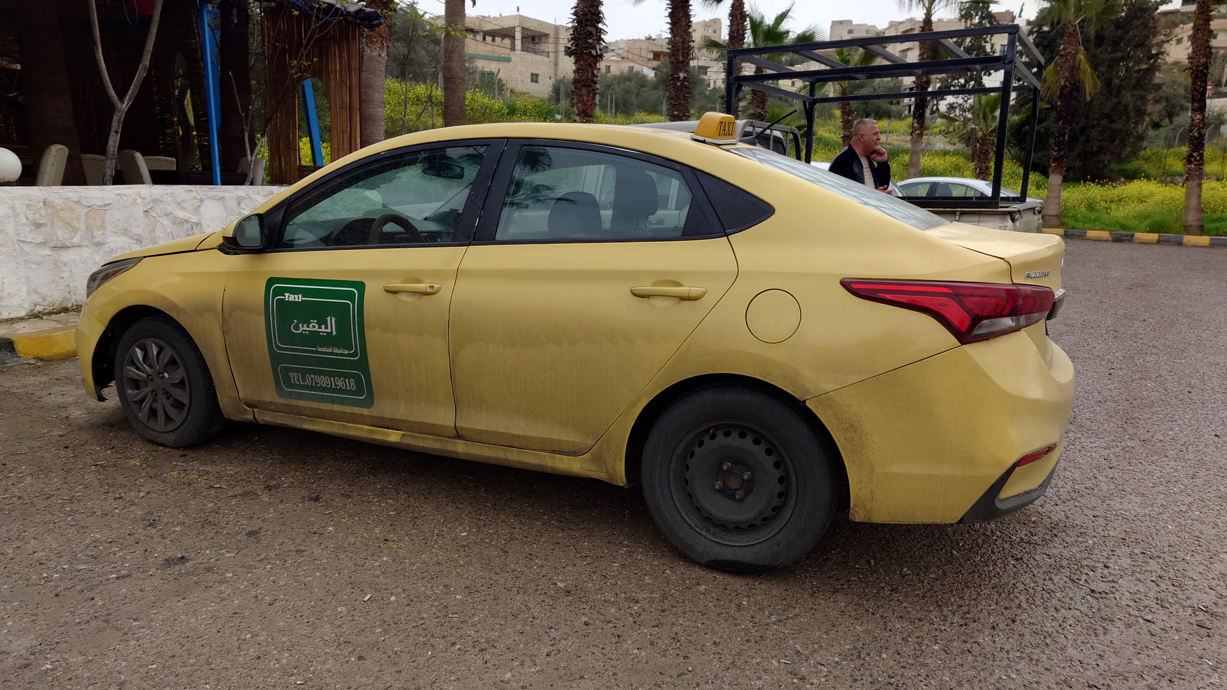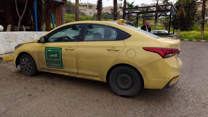 Während wir die 45 Kilometer in Richtung Norden fahren, textet ihn immer jemand an. Er soll seine Automiete bezahlen, sagt er, kann es aber zur Zeit nicht. Kaum jemand bucht ihn, auch im Taxigewerbe bleiben die Leute weg. Von daher wäre es ein Glücksfall, dass er mich gestern am Busbahnhof abgefangen hat. So hat er heute wenigstens eine Fahrt. Er würde natürlich gerne viel mehr mit mir machen und zählt alles Sehenswerte auf. Nur an all diesen Gegenden bin ich schon zu Fuß gewesen. Ich stelle immer mehr fest, dass Jordaniens Kultur und Leben sich auf einem Schmalen Grad entlang des Jordantals und auf den Anhöhen befindet. Weiter nach Osten kommt faktisch nichts mehr, außer Wüste. Auch gestern auf der Autobahn konnte ich es die ganze Strecke über beobachten. Auf Streetmaps kann man sehen, dass es noch vereinzelte Ortschaften gibt, um welche hunderte, kreisrunde, bewässerte Felder angelegt wurden.
