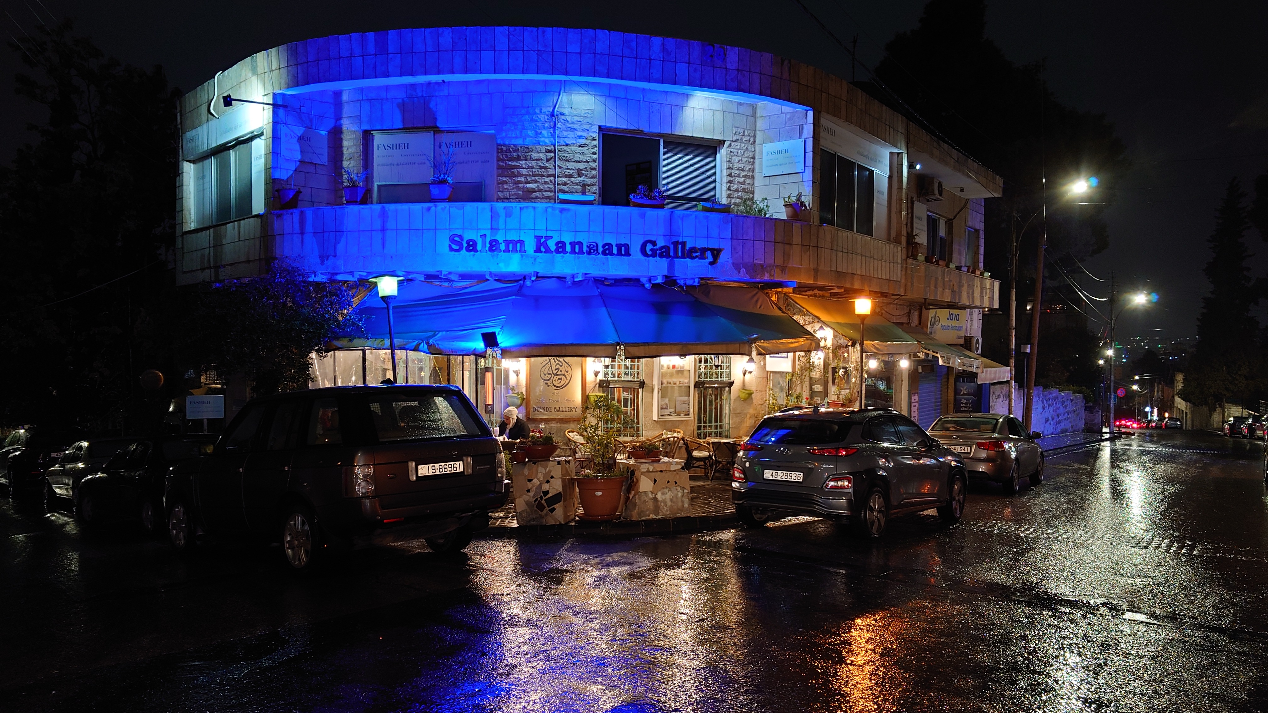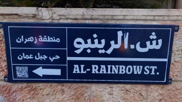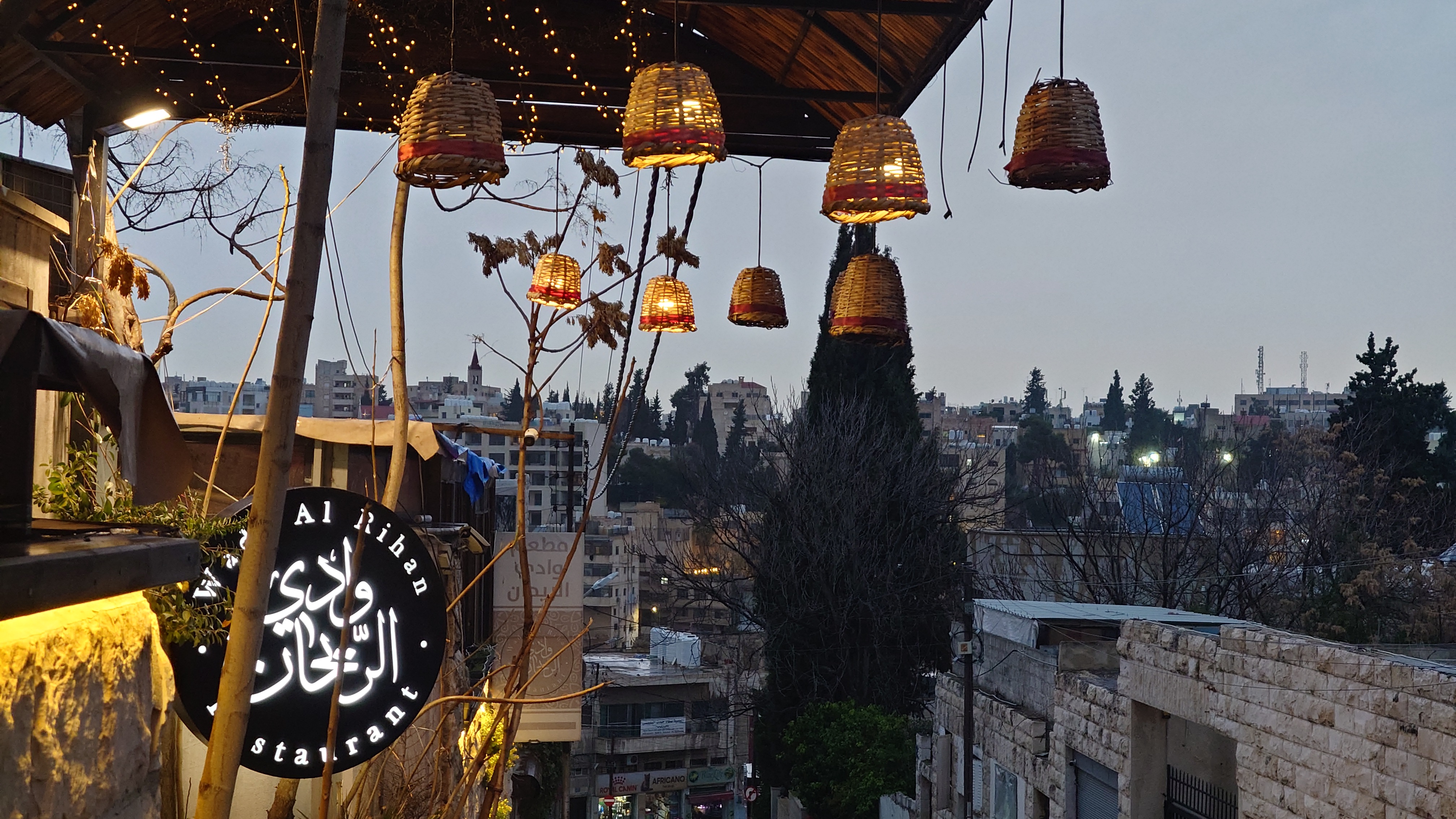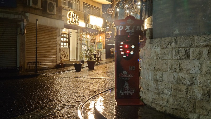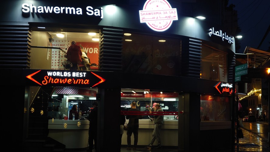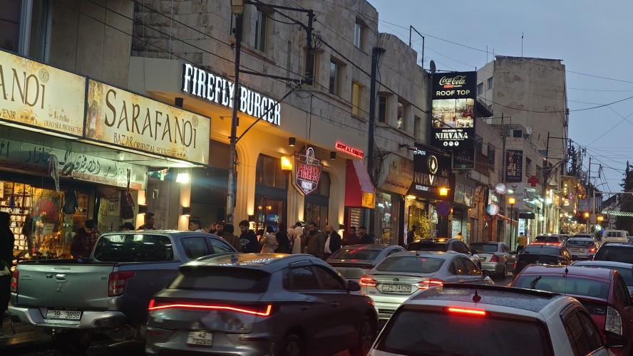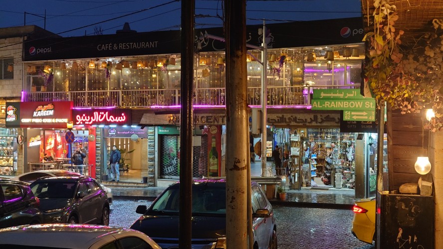 Es wird langsam dunkel. Hier jetzt nur rumzuhängen, habe ich keine Lust und gehe nochmal raus und halte mir ein Taxi an. Ich möchte die vermeintlich sagenumwogene Rainbow Street gerne sehen, die Krämerbrücke Ammans, das Portobello Jordaniens, das Holländerviertel des Ostens... oder so. Es regnet weiter in Strömen. Die Straße soll bunt erleuchtet sein, dann habe ich wenigstens coole Reflektionen. Das Taxi hält an einer Ecke. Hier soll das sein? Joa, da steht Rainbow St. Ich habe aber gelesen, dass der Ursprung des Namens auf das Rainbow Cinema zurückgeht, das hier in den 70ern war. Das war ein Spitznamey der irgendwann damm tatsächlich dazu führte, dass die ursprüngliche Abu Bakr al-Siddiq Straße umbenannt wurde. Die Straße wird aber erst auf den dritten Blick interessant. Es funkelt in allen Farben, die schreckliche LED Gierlanden mit defekten Trafos so hergeben. Aber es gibt eben ein paar spannende Läden und Hotspot-Restaurants, wo es jetzt um 18:30 alle möglichen Leute hinzieht. Bestimmte Restaurants sind gerammelt voll mit Leuten, die vor leeren Tellern sitzen und sich unterhalten. Wir wird dann auch schnell klar warum. Sie haben sich schonmal einen Sitzplatz ergattert, müssen mit dem Essen aber warten, bis 18:52 Uhr ist und Allah gerufen wird. Ramadan Kareem Buffets werden überall vorbereitet. 9.99 JD kostet es überall. Ich geselle mich im "Crazy House" zu der wartenden Gemeinschaft. Hab Hunger ohne Ende. Dann ist es soweit. Der Muezzin ruft den Allerheiligsten mit den 99 Namen endlich an. Wie nach einem Startschuss stehen alle auf, um das Buffet zu plündern. Es gibt alles, was die jordanische Küche hergibt in Mengen und jeder haut sich Berge von Essen auf die Teller. Das scheint bei Ramadan also eine Art Tradition zu sein, so essen zu gehen mit der ganzen Familie. Ich sitze wieder wie ein Alien mittendrin und genieße tatsächlich ein wenig die herzliche Aufmerksamkeit. Alles an Essen wird mir erklärt, auch wenn es nur griechischer Salat ist. Dabei gibt's Limo. Ich bin ja eigentlich ein zuckersüßer Zahn, aber dieses Konzentrat musste selbst ich mit 500ml Wasser verdünnen. Wie bekommen die das unter. Irgendwann leeren sich die Teller und die Luft füllt sich mit dem süßen Qualm der Shishas. Ich bin herrlich satt und ziehe mal weiter hinaus in die Nässe.
