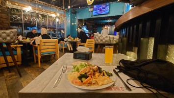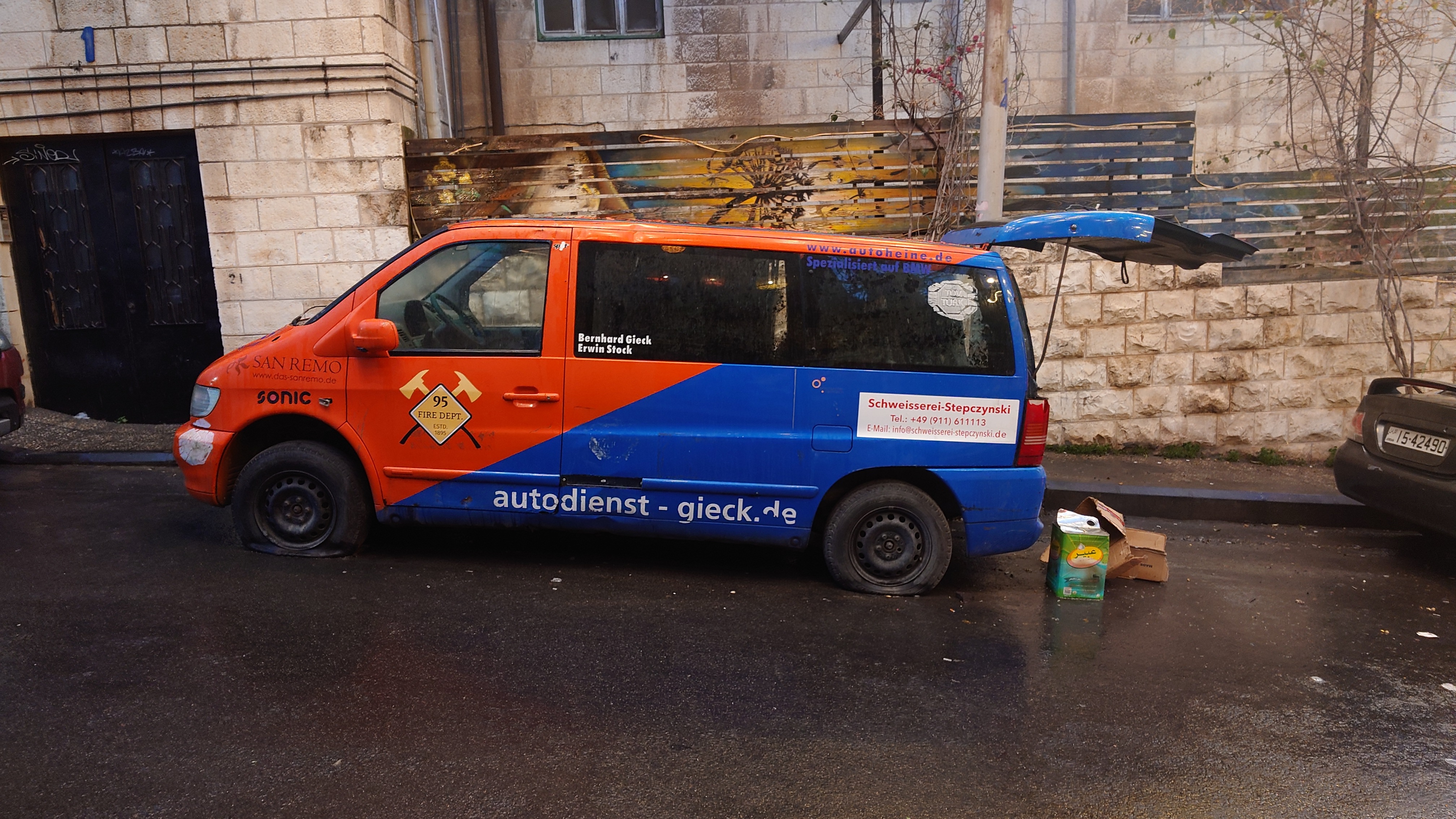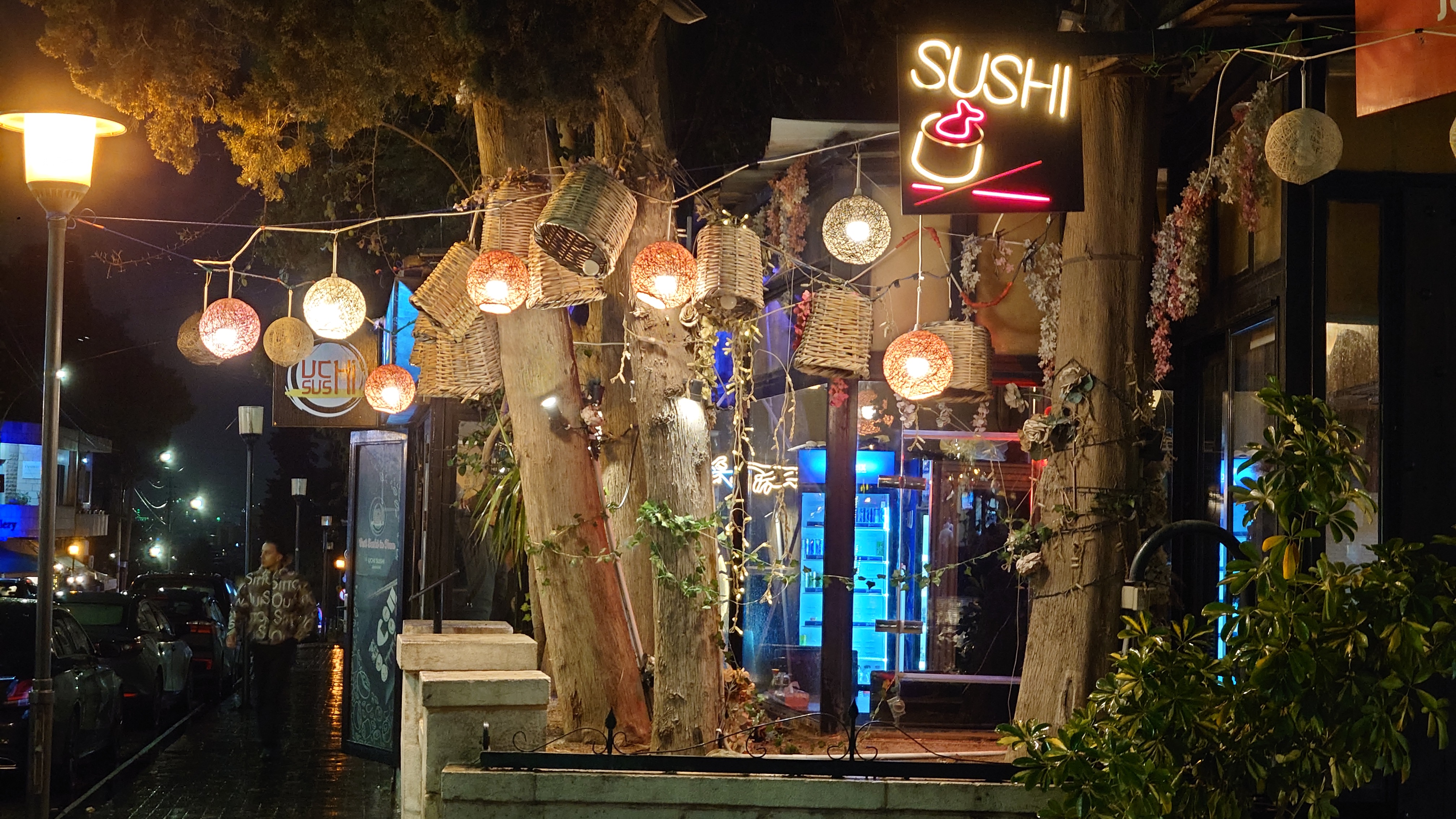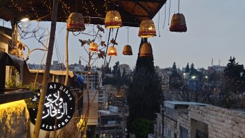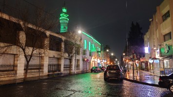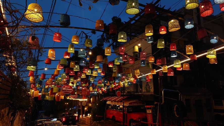 Es wird langsam dunkel. Hier jetzt nur rumzuhängen, habe ich keine Lust und gehe nochmal raus und halte mir ein Taxi an. Ich möchte die vermeintlich sagenumwogene Rainbow Street gerne sehen, die Krämerbrücke Ammans, das Portobello Jordaniens, das Holländerviertel des Ostens... oder so. Es regnet weiter in Strömen. Die Straße soll bunt erleuchtet sein, dann habe ich wenigstens coole Reflektionen. Das Taxi hält an einer Ecke. Hier soll das sein? Joa, da steht Rainbow St. Ich habe aber gelesen, dass der Ursprung des Namens auf das Rainbow Cinema zurückgeht, das hier in den 70ern war. Das war ein Spitznamey der irgendwann damm tatsächlich dazu führte, dass die ursprüngliche Abu Bakr al-Siddiq Straße umbenannt wurde. Die Straße wird aber erst auf den dritten Blick interessant. Es funkelt in allen Farben, die schreckliche LED Gierlanden mit defekten Trafos so hergeben. Aber es gibt eben ein paar spannende Läden und Hotspot-Restaurants, wo es jetzt um 18:30 alle möglichen Leute hinzieht. Bestimmte Restaurants sind gerammelt voll mit Leuten, die vor leeren Tellern sitzen und sich unterhalten. Wir wird dann auch schnell klar warum. Sie haben sich schonmal einen Sitzplatz ergattert, müssen mit dem Essen aber warten, bis 18:52 Uhr ist und Allah gerufen wird. Ramadan Kareem Buffets werden überall vorbereitet. 9.99 JD kostet es überall. Ich geselle mich im "Crazy House" zu der wartenden Gemeinschaft. Hab Hunger ohne Ende. Dann ist es soweit. Der Muezzin ruft den Allerheiligsten mit den 99 Namen endlich an. Wie nach einem Startschuss stehen alle auf, um das Buffet zu plündern. Es gibt alles, was die jordanische Küche hergibt in Mengen und jeder haut sich Berge von Essen auf die Teller. Das scheint bei Ramadan also eine Art Tradition zu sein, so essen zu gehen mit der ganzen Familie. Ich sitze wieder wie ein Alien mittendrin und genieße tatsächlich ein wenig die herzliche Aufmerksamkeit. Alles an Essen wird mir erklärt, auch wenn es nur griechischer Salat ist. Dabei gibt's Limo. Ich bin ja eigentlich ein zuckersüßer Zahn, aber dieses Konzentrat musste selbst ich mit 500ml Wasser verdünnen. Wie bekommen die das unter. Irgendwann leeren sich die Teller und die Luft füllt sich mit dem süßen Qualm der Shishas. Ich bin herrlich satt und ziehe mal weiter hinaus in die Nässe.