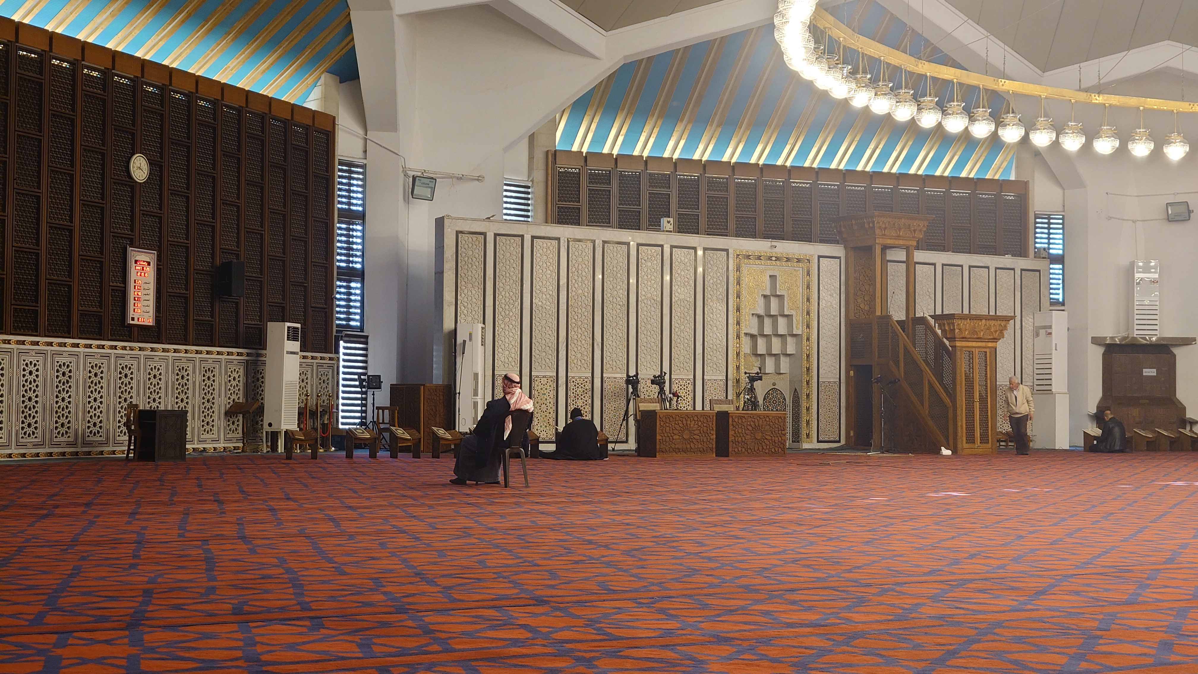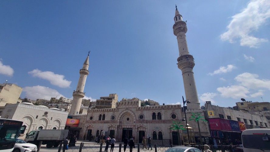 Also raus in den Lärm. Ich merke, dass ich mich immer mehr an die unvollkommene Kulisse der Stadt gewöhne und die schönen und bemerkenswerten Dinge finde. Zuerst fällt mir die große Moschee Ammans auf und ich steuere darauf zu. Sie ist kulturell nicht sonderlich bedeutsam, sondern ein eher moderner, 1989 gebaiter Betonkomplex. Aber ich war noch nie in einer Moschee drin und will mal schauen. 2 JD Eintritt, ich ziehe meine Sandalen aus und ich betrete die größte Moschee Jordaniens. Alles wirkt im Grunde sehr pragmatisch und gelassen. Ein paar Männer sind hier. Manche liegen einfach so herum und schlafen. Andere beten, wiederum andere knien vor einer Lesebank und lesen etwas. Einige unterhalten sich auch. Es hat irgendwie nicht so den Pathos wie in Kirchen. Es hat eher was von einem gewaltigen Wohnzimmer.