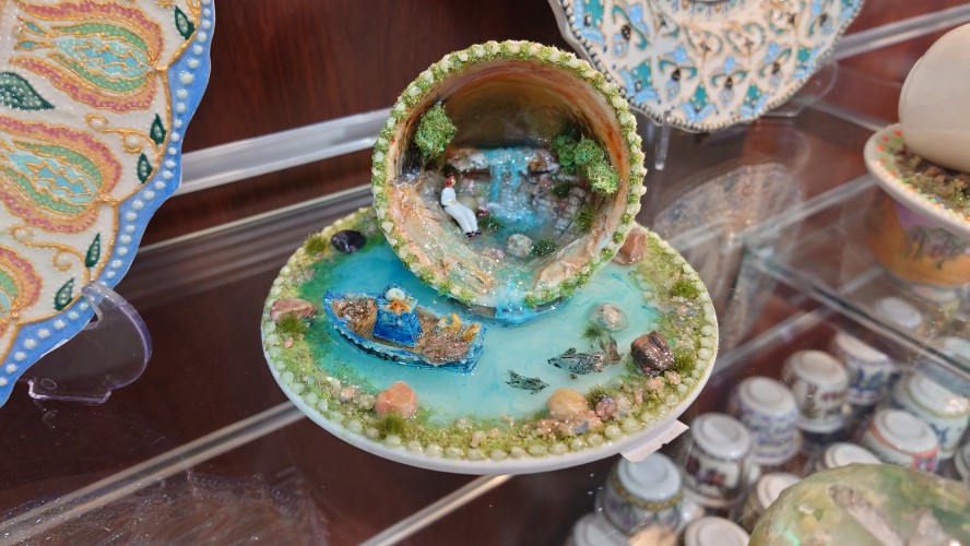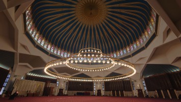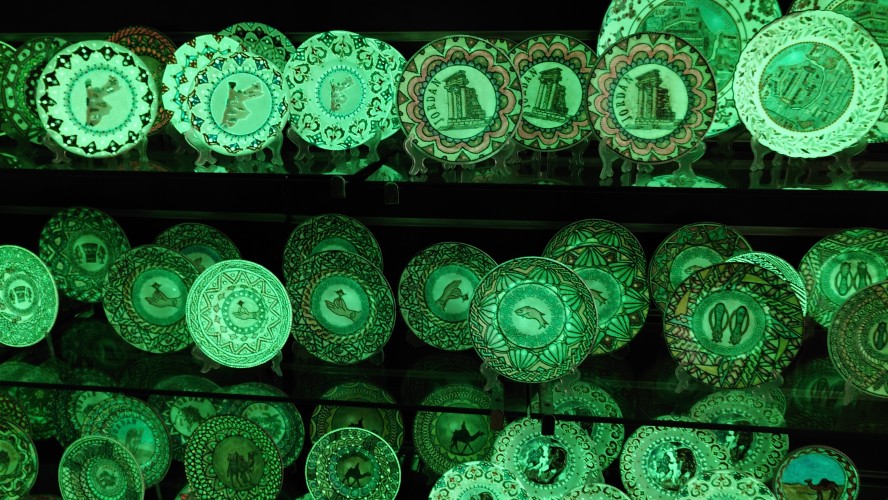 Unterhalb der Moschee befindet sich ein Konferenzraum und eine Ausstellung wichtiger Moscheen der Welt. Bilder hängen an der Wand, von Männern, die anderen Männern die Hand schütteln oder neben anderen Männerny die wichtig aussehen, in besagtem Konferenzraum sitzen. Im Eingangsbereich ist der sogenannte Wohltätigkeitsbasar mit handgemachten Souvenirs, die unter anderem von den Frauengemeinschaften angefertigt werden. Ich werde, ausnahmsweise unaufdringlich, hindurchgeführt. Besonderer Clou: sie sind in phosphorisierenden Farben bemalt. Das Licht wird ausgeschaltet und hunderte bemalter Teller erläuchten stattdessen den Raum grünlich.