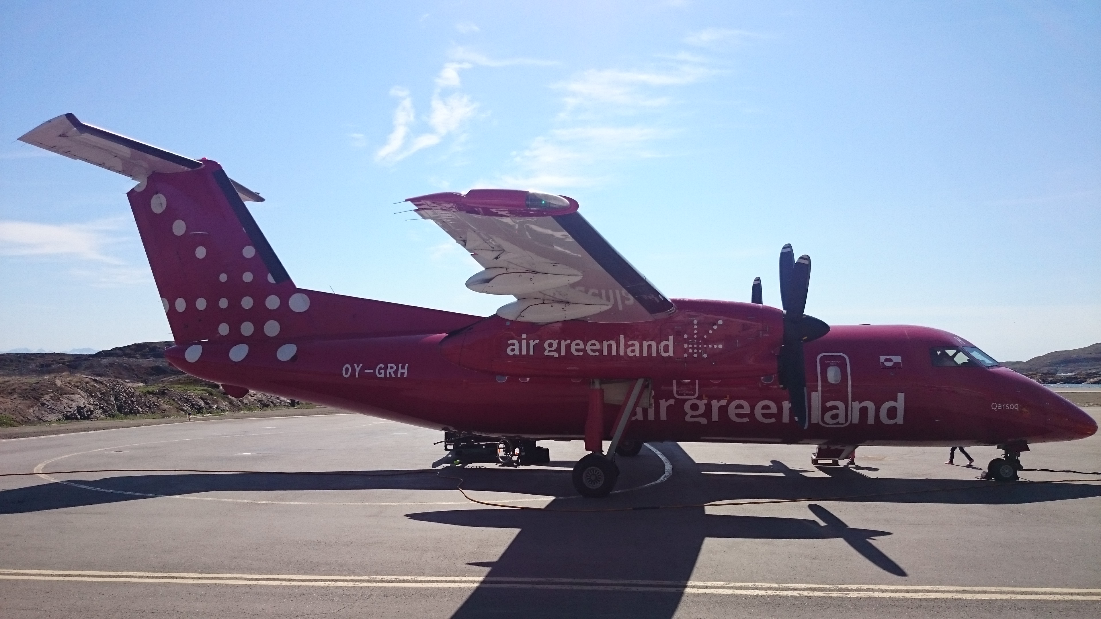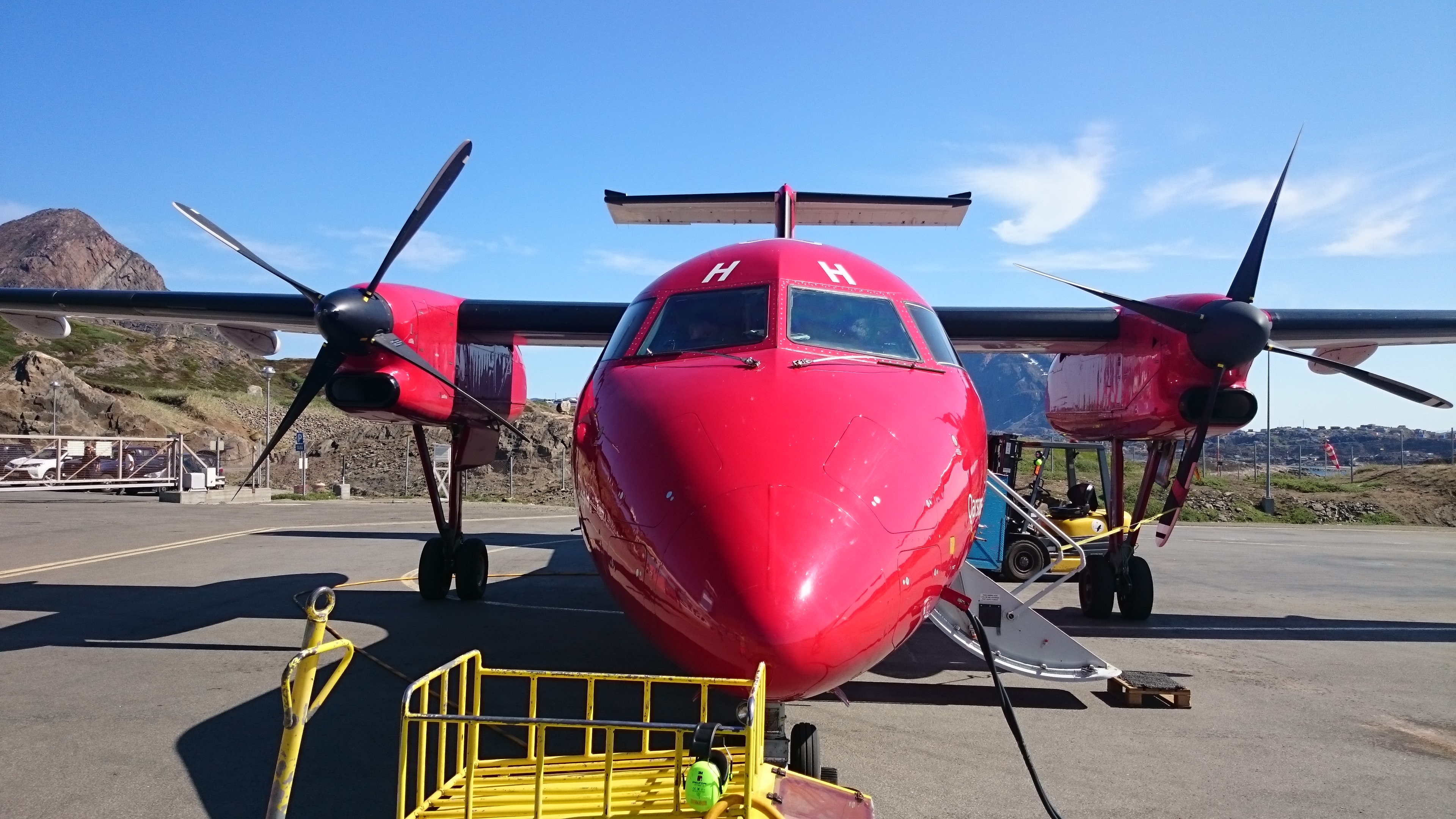 Gegen 13 Uhr geht's die lange Straße hinter der einzigen Straßenbrücke Grönlands hinauf zum Flughafen, der das Flair vom Bahnhof in Horn-Bad Meinberg hat. Ein Haus mit einem kleinen Tower, ein Schalter, Kaffeeautomat, ein Schild, falls man sich verläuft: Gate 1. Draußen eine doch recht überschaubare Landebahn, auf der schließlich eine Miniausgabe einer Dash 8 landet und uns in 50 Minuten zur Landeshauptstadt Nuuk bringt.
