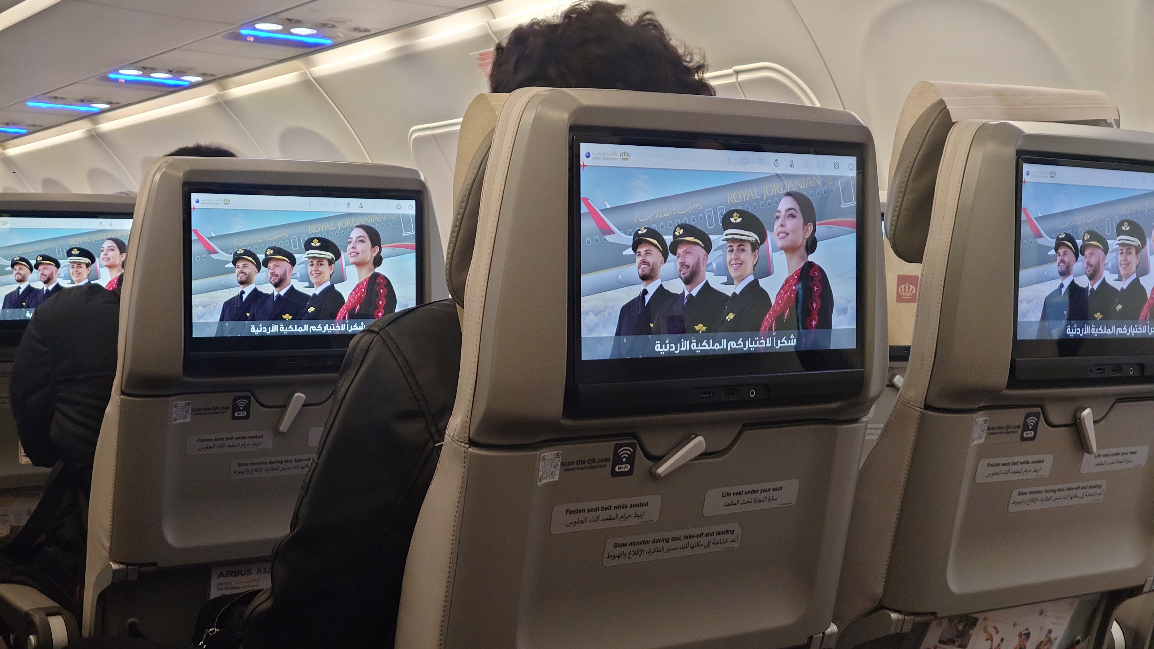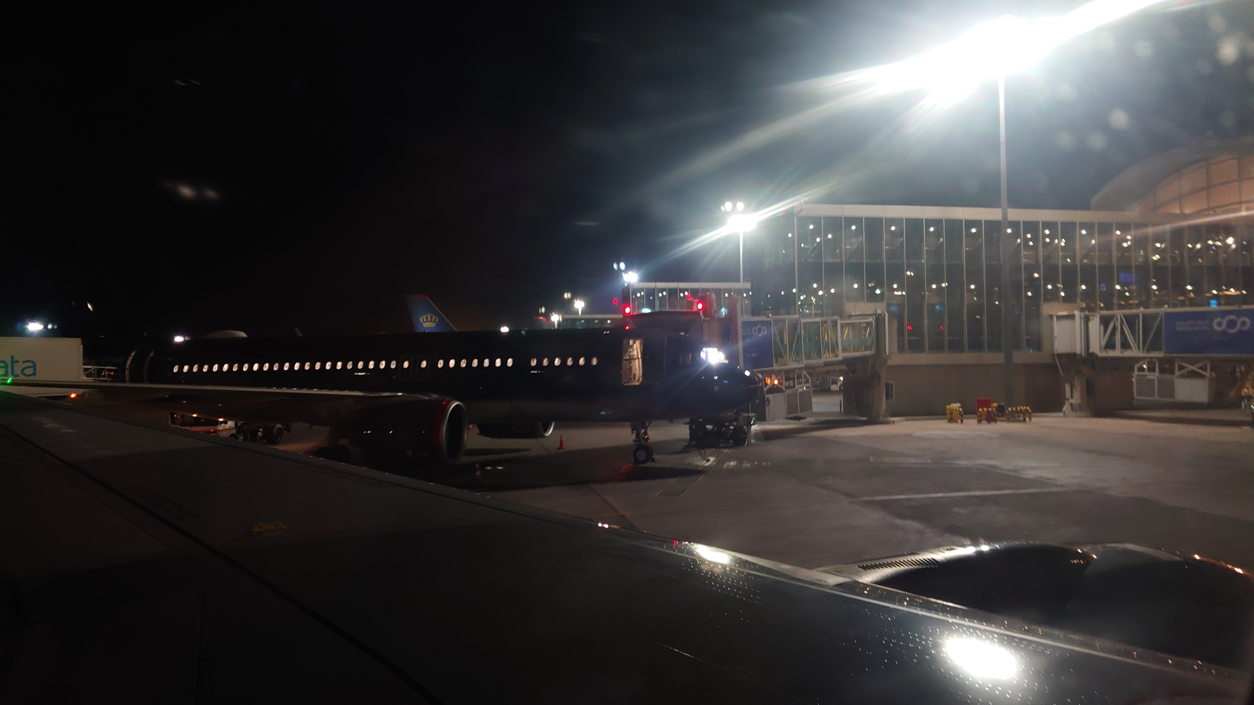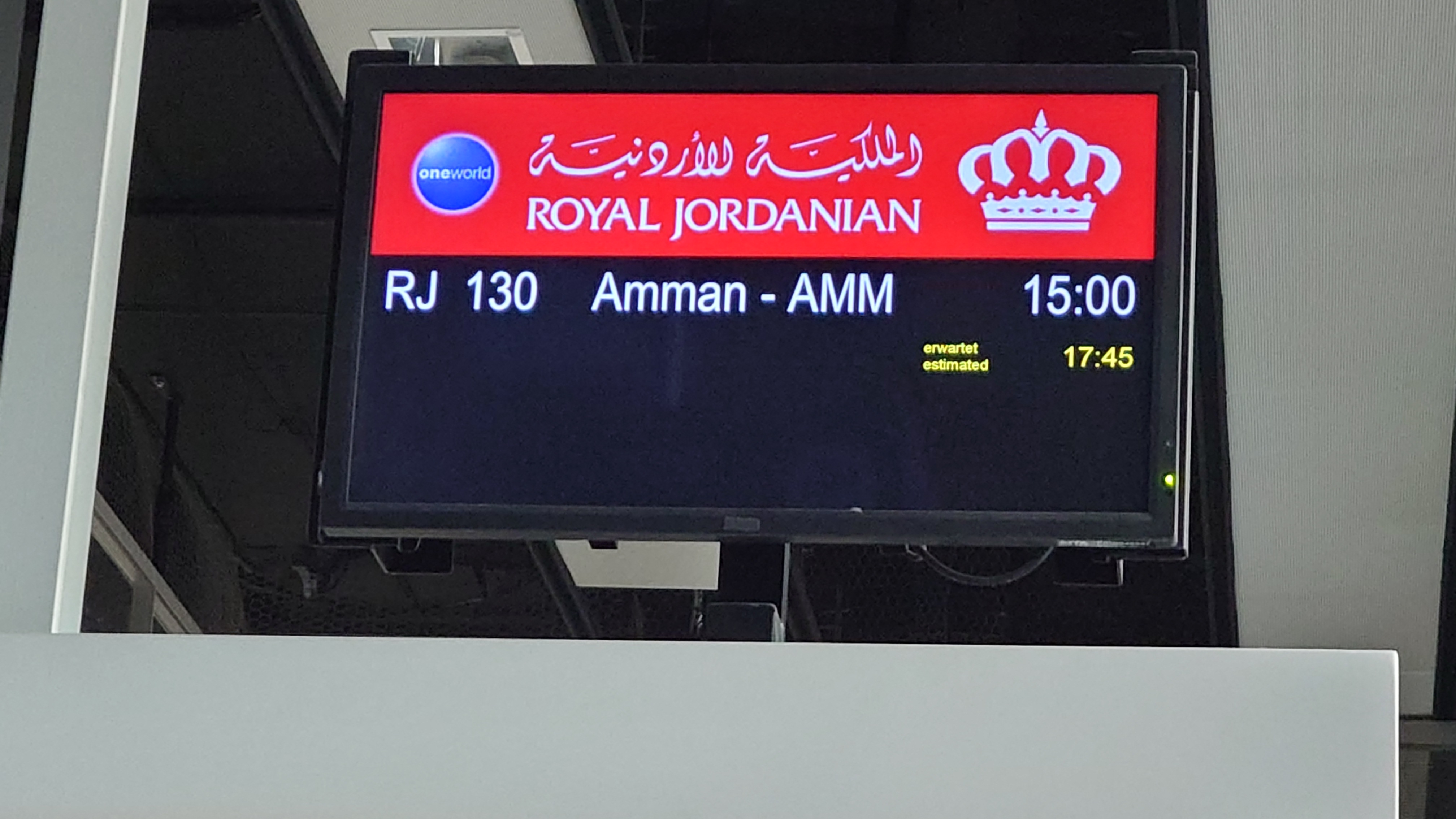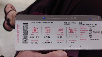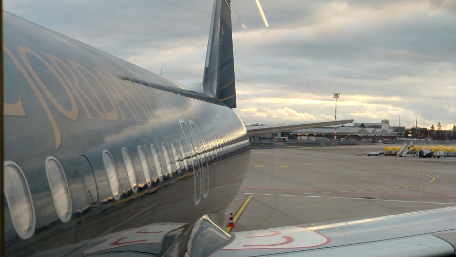Ich kann einchecken, gehe durch die Kontrolle. Am Gate erfahre ich, dass der Flughafen Amman für 2 Stunden gesperrt war, daher die Verspätung. Aber RJ wird fliegen. Als einzige Gesellschaft.