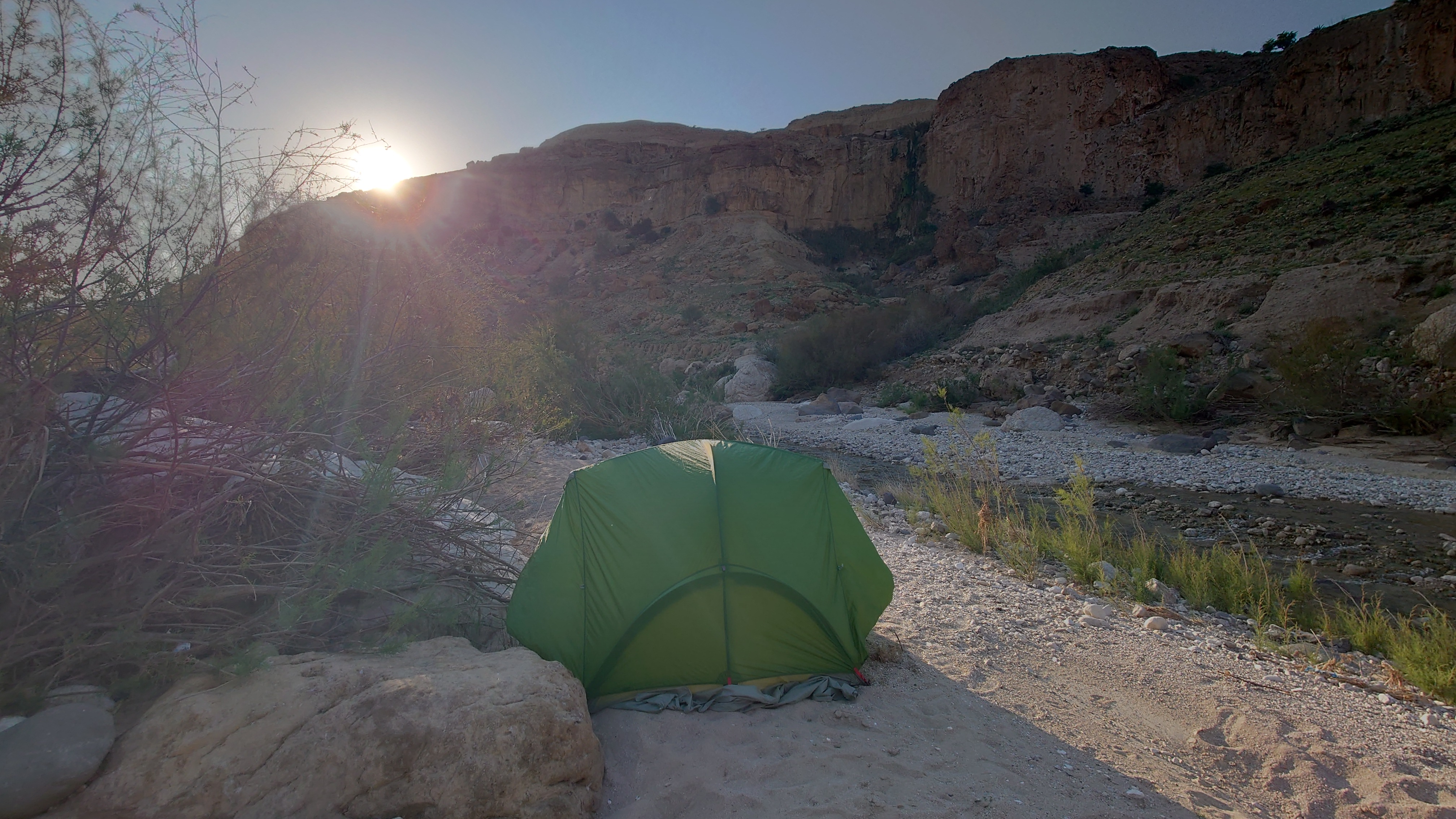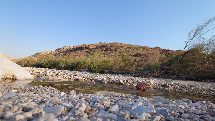 Wadi Murjib kenne ich schon vom letzten Jahr. Da bin ich von der entgegengesetzten Seite durch die Mündung zum toten Meer hin eingestiegen und die Wasserfälle hinauf geklettert. Hier oben ist es ein glasklarer Fluss, in dem weiße Kalkfelsen liegen wie Seerobben. Vor den Gebilden sind durch die Verwirbelungen kleine Pools entstanden. Rings herum sind weiche Sandbänke entstanden. Bis zu meinem Ziel ist es noch 600 Meter, aber das hier ist einfach zu herrlich. Ich bleibe genau hier und schlage mein Zeit auf. Und dann baden. Boaaaah das ist einfach sehr befriedigend, sauber zu werden. Aber die Sonne versinkt schon hinter den Schluchthängen. Also noch schnell Klamotten waschen, bevor es wieder kalt wird. Ich freue mich richtig auf mein kleines Zu Hause jetzt. Ein tolles Gefühl, alles, was man braucht, auf dem Rücken zu haben und nachts darin zu verschwinden wie eine Schildkröte. Und dann noch an einem so herrlichen Platz. Daran könnte ich mich gewöhnen.