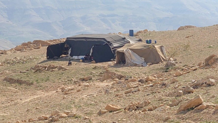 .. bis mich schließlich ein voluminöses Booooom aus irgendwelchen wirren Träumen reißt. War das jetzt im Traum oder nicht?! Ich mache das Zelt auf und schaue heraus. Eine Rakete fliegt nordwestlich meines Vadis in einiger Entfernung durch die Luft und zieht einen rauchigen Feuerschweif hinter sich her, während lauter kleine Explosiönchen der Zigarre immer näher kommen. Dann ein lauter Knall und die Rakete geht in Rauch auf. Abgefangen. So geht das am Morgen immer wieder mal, sodass ich ein Muster erkenne: erst schwaches Geknitter, dann ein fetter Knall, wenn die Rakete neutralisiert wurde. Das ganze findet auf israelischer Seite jenseits des toten Meeres statt. Einerseits bin ich fasziniert. Andererseits irritiert über meine vermeintliche Gelassenheit. Nach nur einem Tag gewöhne ich mich an das gelegentliche Knallen von irgendwo weit weg. Ein Teil von mir denkt sich, dass ich lieber auf den Kanaren oder so wäre. Der andere Teil denkt sich, dass mir hier im Nirgendwo auf jordanischer Seite im Grunde nichts passieren kann. Ich bin wirklich kein lohnendes Ziel. Ich packe mein Zelt ein und mache ich an einen langen, 670m hohen Aufstieg in Richtung eines Plateaus im Süden des Vadis. Eine Ortschaft ist in weiter Ferne oben am Berghang. Eine Sirene macht Fliegeralarm und echot durchs Tag, wenn die Raketen kommen und gibt Entwarnung, wenn sie vorbei sind. Die Einflugschneise von Aqaba zum Flughafen Amman ist ebenfalls sichtbar. Flieger starten und landen, wenn auch selten. Wie lange kann sich der Iran diese Bombardements eigentlich leisten? Besonders effektiv scheinen sie nicht zu sein gegen die Bodenabwehr. Komische Gedanken für eine Wanderung. Netz habe ich hier auch nicht. Das ist wohl auch gut so. Die Nachrichten würden mich nur beunruhigen und so konzentriere ich mich auf's Wesentliche: je höher ich komme, desto sichtbarer wird eine zerfurchte Landschaft, die dem Grand Canyon sicherlich Konkurrenz machen könnte. Mag sein, dass in den Vadis ringsum nur ein Rinnsal fließt. Was nach millionen von Jahren daraus entstanden ist, ist gewaltig und gibt schichtweise die Epochen der Weltgeschichte an den abfallenden Hängen der Schluchten preis. Viele Schafhirten sind hier und immer wieder kreuzen sie meinen Weg, grüßen und ziehen weiter. Leider auch solche mit Hunden. Es ist ätzend, wenn sie mir auf einem Steilhang begegnen und ich nebenbei noch rotweiße Markierungen im Blick halten muss. Der Steintrick funktioniert aber der Puls schwillt mir jedes Mal an. Das braucht echt niemand.