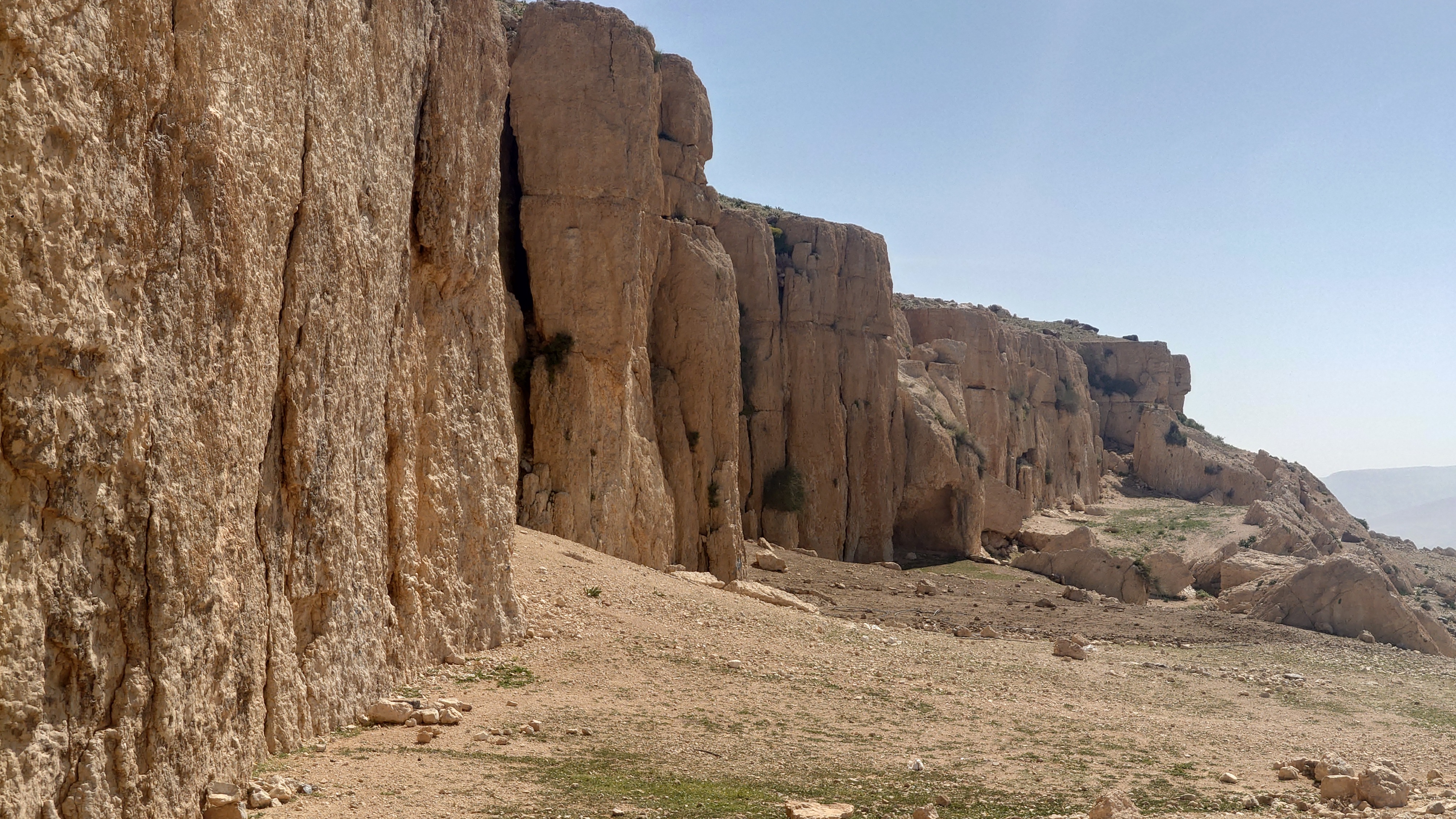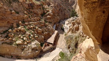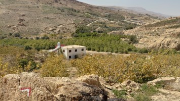 Es geht von Karak steil bergab auf einem markierten Pfad, wen man nur in der Theorie "Weg" nennen darf. Auch daran gewöhne ich mich. "Wanderweg" darf man nicht mit dem alpinen Vorbild gleichsetzen, bei dem die Markierungen einen ausgetretenen Weg begleiten. Immer wenn die Pisten enden, bleibt das Gefühl, dass außer dem Menschen mit dem rotweißen Farbeeimer nie jemand Menschliches den Boden betreten hat. Ziegen sicherlich. Diese Pfade führen regelmäßig in die Irre. Wenn ich nicht im Minutentakt das GPS Signal checken will, heißt es, die Intuition zu schärfen: Was hätte ich als Erbauer mit den Wanderern am ehesten vorgehabt? Das funktioniert erstaunlicherweise ähnlich gut wie beim Geocachen: Halte alle Formationen im Blick, schaue dir bei jeder Markierung an, in welche Richtung sie ausgerichtet ist und suche von dort aus die nächste. Das klappt! Aber man ist unglaublich langsam unterwegs, erst Recht mit 30% Gefälle.