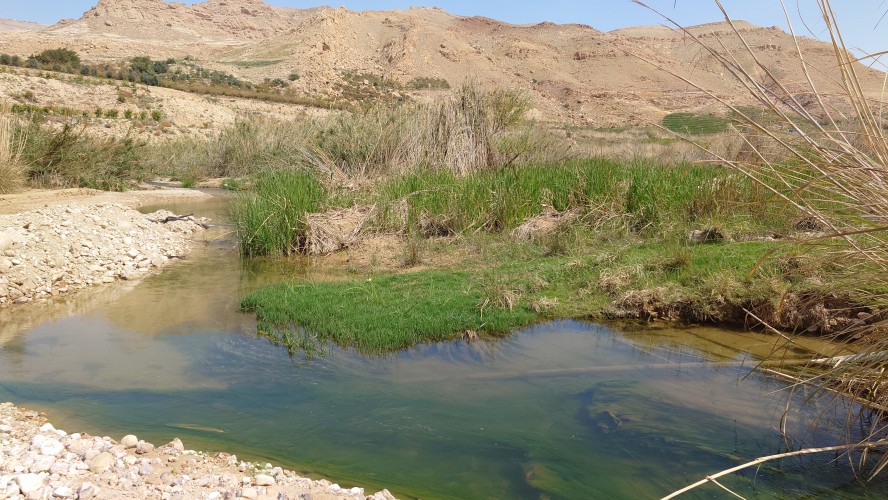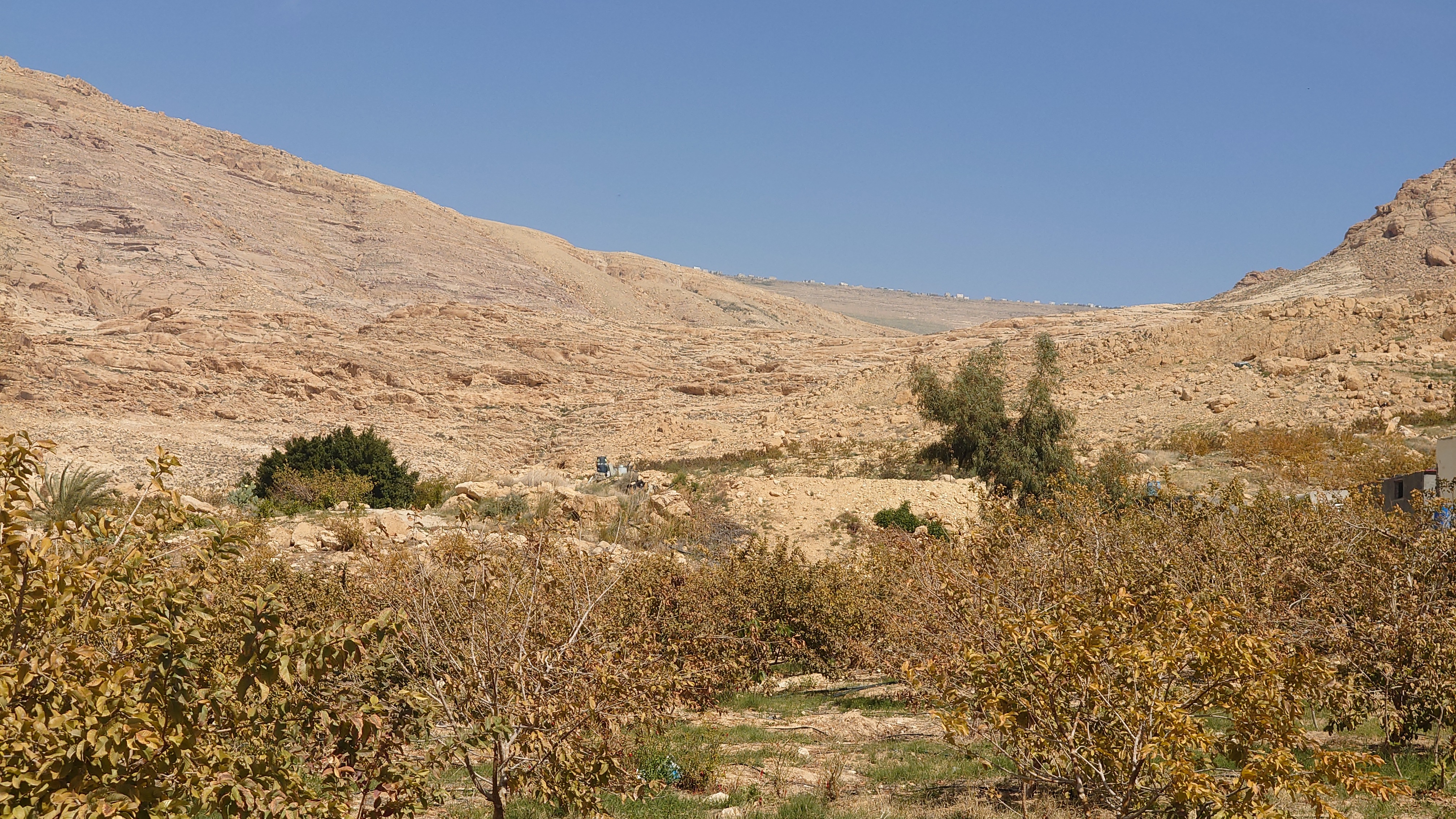 Das Wasser im Wadi ist lauwarm. Und mein Weg ist auf einmal weg. Hier unten wurde rumbegabbert. Der Weg war im Weg. Jetzt ist hier eine versehentlich renaturierte Furt entstanden, die ich nicht umlaufen kann. Und schon macht mein Schuhwerk wieder Sinn: Hosenbeine hoch und ab durch den Schlamm und das Wasser. Mein Ziel soll hier auch sein, ein Resort. Aber es sieht total verwaist aus. Keine Gäste, keine Saison, wie auch immer. Aber so sehr schön ist es hier auch nicht, eher reudig mit einigen landwirtschaftlichen Betrieben. Und was mache ich jetzt? Hier in der Nähe sollen heiße Quellen sein, hat mir Google Maps gestern verraten. Das Navi sagt 3km nach Westen auf einer Straße, die dort angeblich aufhört und 300m weiter wieder auftaucht. Was soll das denn? Naja, im Zweifel kenne ich mich offroad rumstaksen ja jetzt aus, also los, ich will baden.