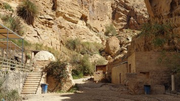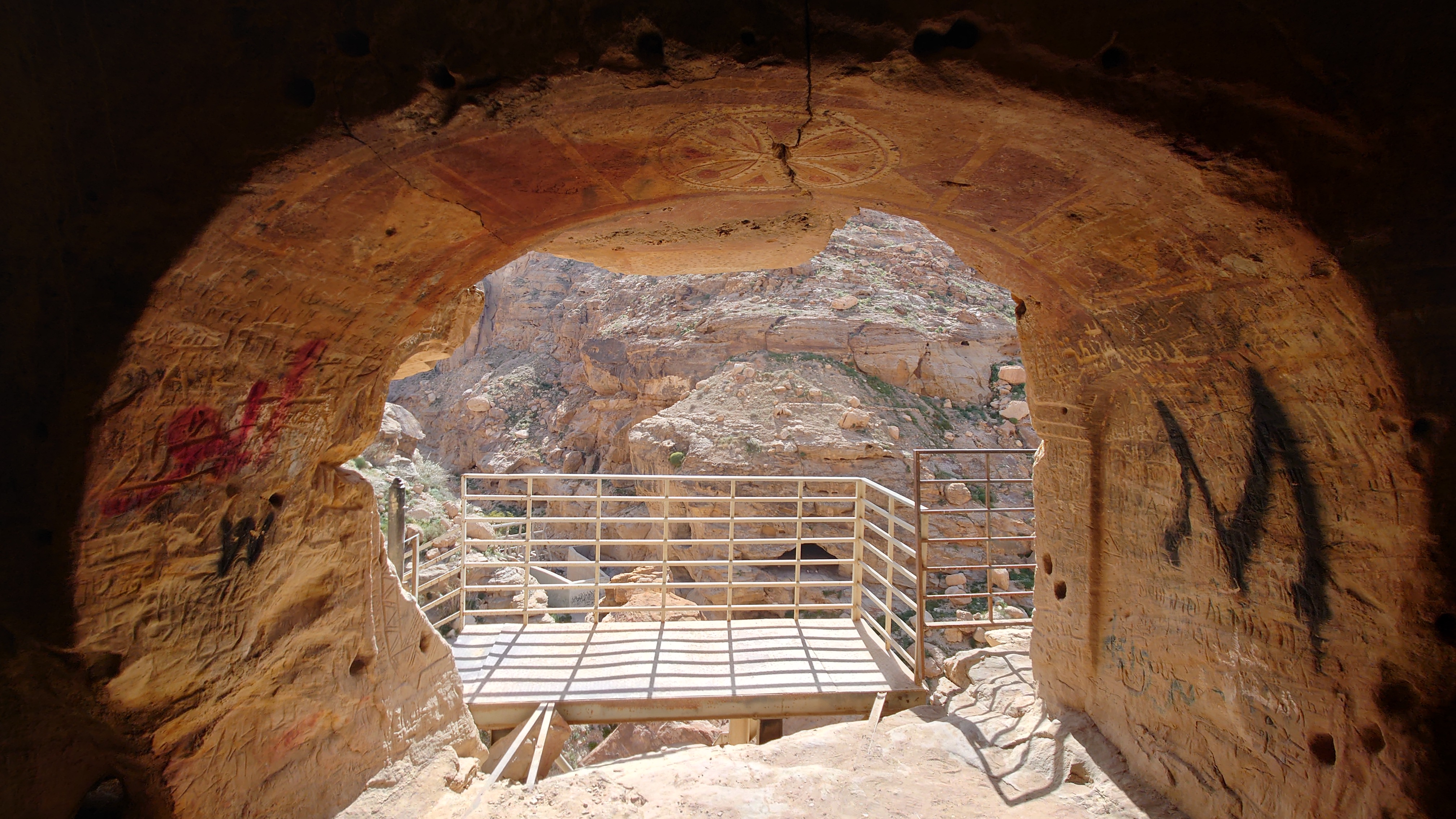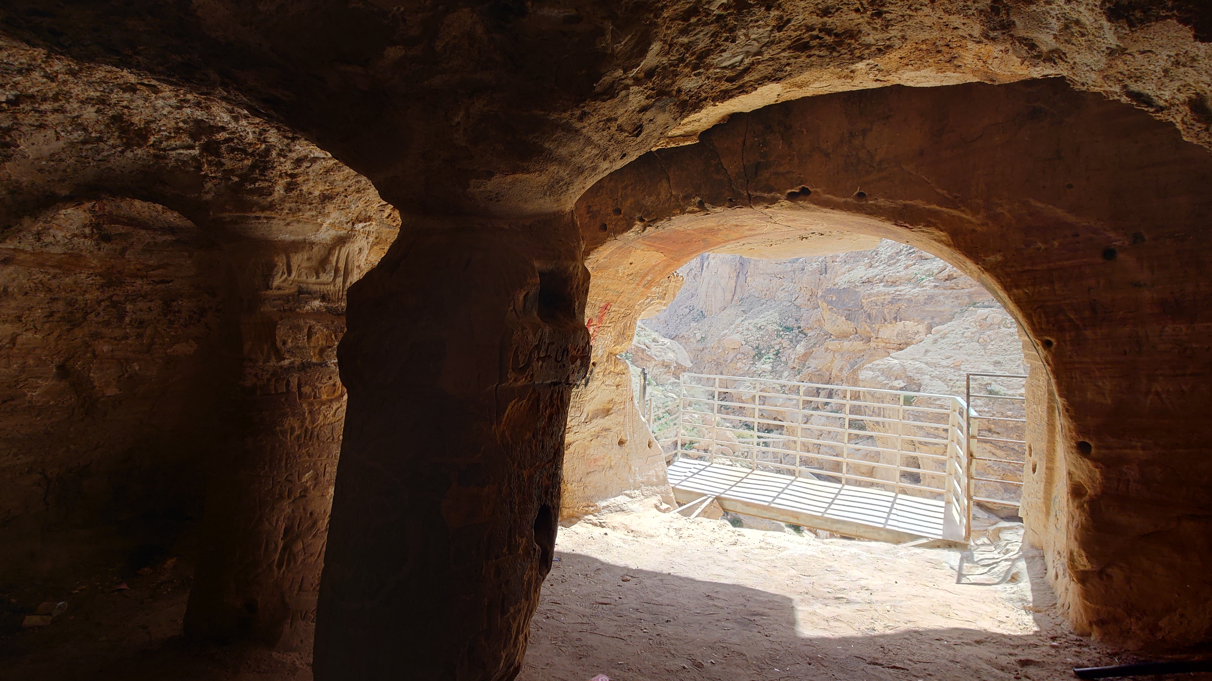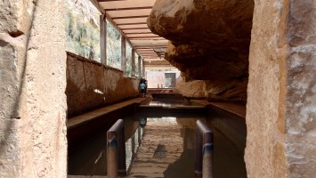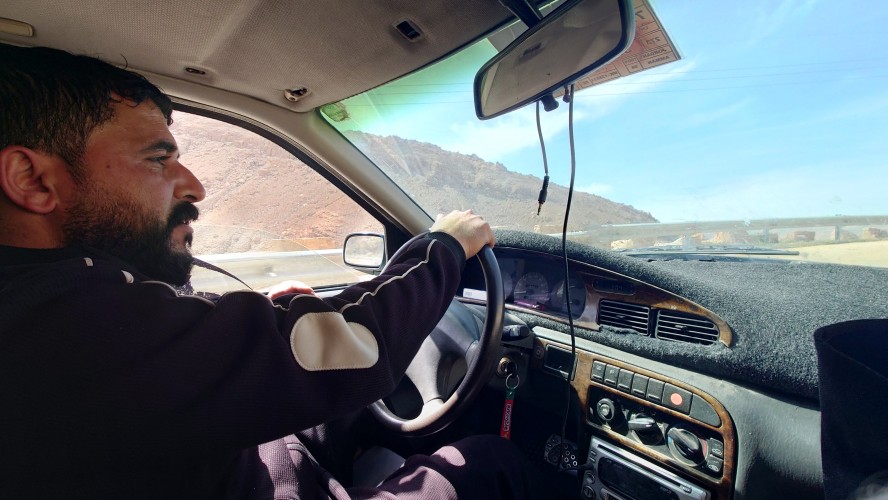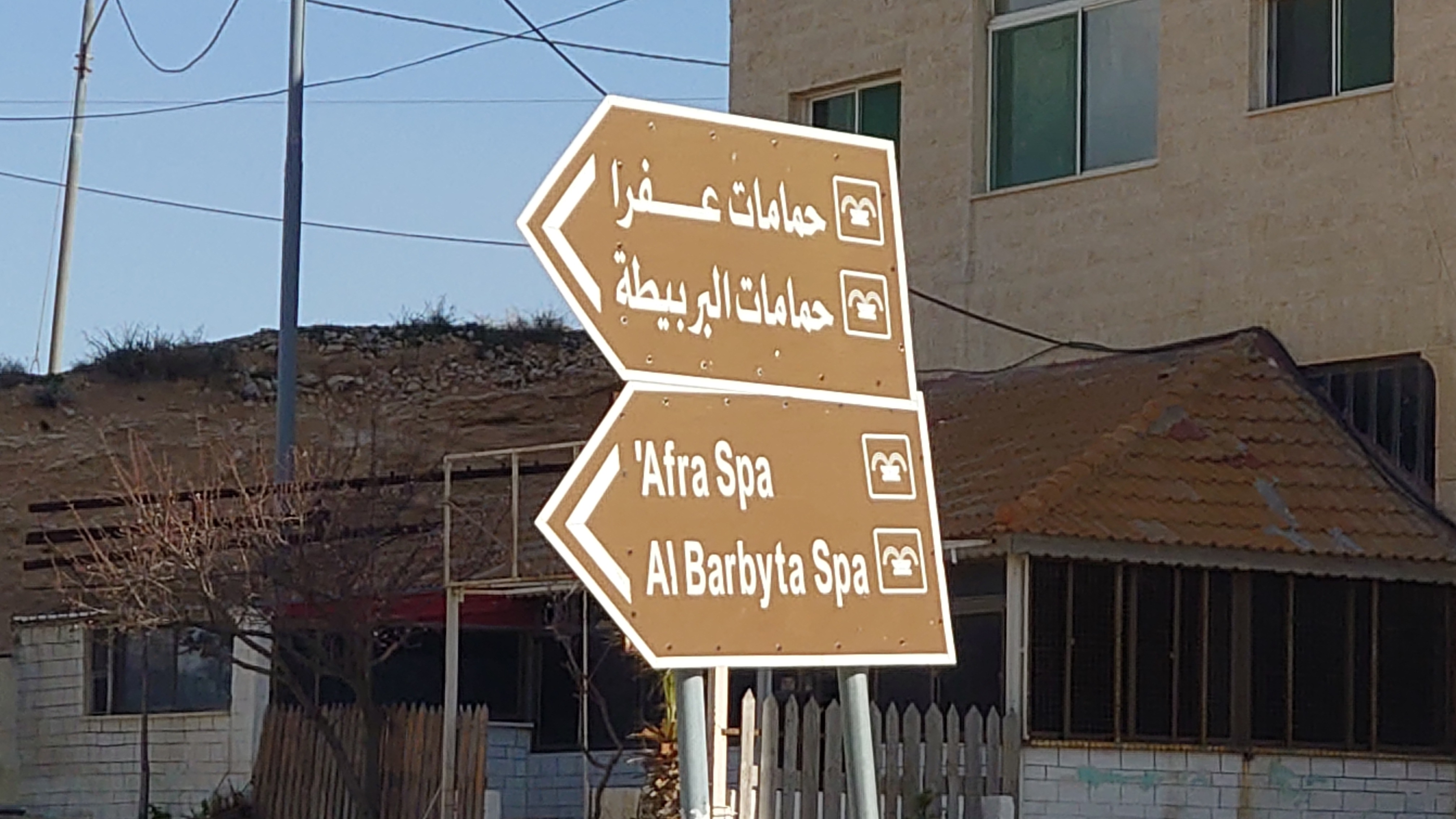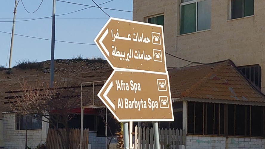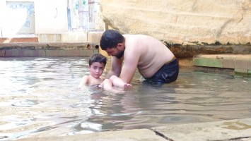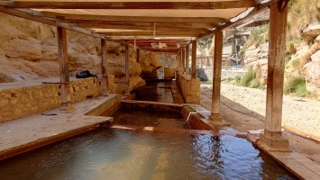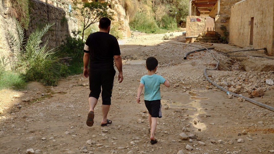 Niemand ist hier, bis schließlich auf halber Strecke ein südkoreanisches Blechgebildet neben mir hält. Zwei Männer und ein Kind schauen heraus: Sie wollen zu den heißen Quellen. Ich auch? Ich auch! So steig doch ein! Mache ich. Es grüßen mich Hamsa, Said und der kleine Abujenda, der Schwimmen lernen soll. Wir fahren also gemeinsam zum Afra Hot Spa, wo wohl so richtig was los... sein... könnte... wenn Menschen da wären. Vor Ort ist nur ein Händler für Getränke, der mich freudig mit einer 2 Liter Matrix Wildberry Flasche begrüßt. Es sieht verwahrlost aus. Hier war wohl auch mal ein Restaurant und ein Resort. Das muss aber alles stark mitgenommen worden sein durch eine Schlammlawine, die hier einst wütete. Ich gehe mit den Männern in eine Schlucht, in welche Bäder gebaut wurden und das Wasser mit über 40 Grad hinein fließt. Genau was ich gesucht habe. Aber leider weiß ich jetzt auch, warum hier die Straße endet. Sie ist einfach nicht mehr da und dafür einer Art Rückhaltebecken gewichen, das die Schlucht unpassierbar macht. Sackgasse. Egal, darum kümmere ich mich später. Erstmal soll ich mit baden kommen. Ich brauche ewig, bis mein Körper die Hitze aushält. Sie lachen sich kaputt. Jaja, habt mal ne empfindliche Wunde! Abujenda sitzt verunsichert im Becken, während der Vater versucht ihm Wasser über den Kopf zu gießen. Ich liege im Becken herum und fange regelrecht an zu schwitzen. Neee, der Kleine weiß nicht so recht, was mit dem Wasser gemacht werden soll und so gehen wir nach 20 Minuten wieder heraus. Hamsa will mir noch eine antike Felsenbehausung im Berg zeigen. Auch nett. Und nun? Ich stelle fest, das ich nur umdrehen kann. Naja, die drei auch. Sie würden mich och nach Ais mitnehmen, sagt Hamsa. Da wohnen sie. Na wenn das nicht eigentlich mein Ziel ist, das ich genommen hätte, wenn die Überquerung des Berghangs nicht so lang wäre... ich sage nicht nein. Die Strecke ist karg und unspannend. Das sagt auch mein Jordan Trail Pass. Habe ich damit gerechnet? Hmm... sagen wir so, ich schließe hier nichts mehr aus. Die Menschen sind einfach viel viel mehr miteinander, viel mehr eine homogene Gesellschaft als bei uns. Ich wusste, dass diese Option besteht, als ich in den Wagen gestiegen bin.