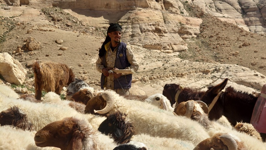 Ein nicht enden wollendes, leises Gefauche schwirrt währenddessen durch die Luft. Dann entdecke ich die wieder die weißen Striche. Viele viele Raketen in Richtung Westen. Ich kann mich mit dem Anblick nicht anfreunden. Die sehen so friedlich aus da oben. Ziel scheint nicht mehr Jerusalem zu sein. Die wurden ja permanent abgeknallt. Es muss Tel Aviv sein. Diese sind anscheinend zu hoch und passieren Jordanien ungehindert. Strategiewechsel? Ich will gar nicht nachsehen. Innerhalb von 5 Stunden komme ich langsam zum Wadi Hasa inmitten des breiten Tals und passiere viele Schafhirten, die mir alle wohlgesonnen sind, Wasser und Zigaretten anbieten und ihre Hunde im Zaum halten. Sie schauen skeptisch auf mein Schuhwerk. Das macht keinen Sinn für sie. Naja, hütete ich Ziegen, sähe ich das auch anders. Ich habe ja keine Eile hier. Und dass ich mich mit nichts untenrum am wenigsten verletze, ist tausende Kilometer lang erprobt. Gut, gegen Dummheit kann man nichts machen. Aber mein Arm hat eine saubere, farblose Kruste um mein Aua herum gebaut.