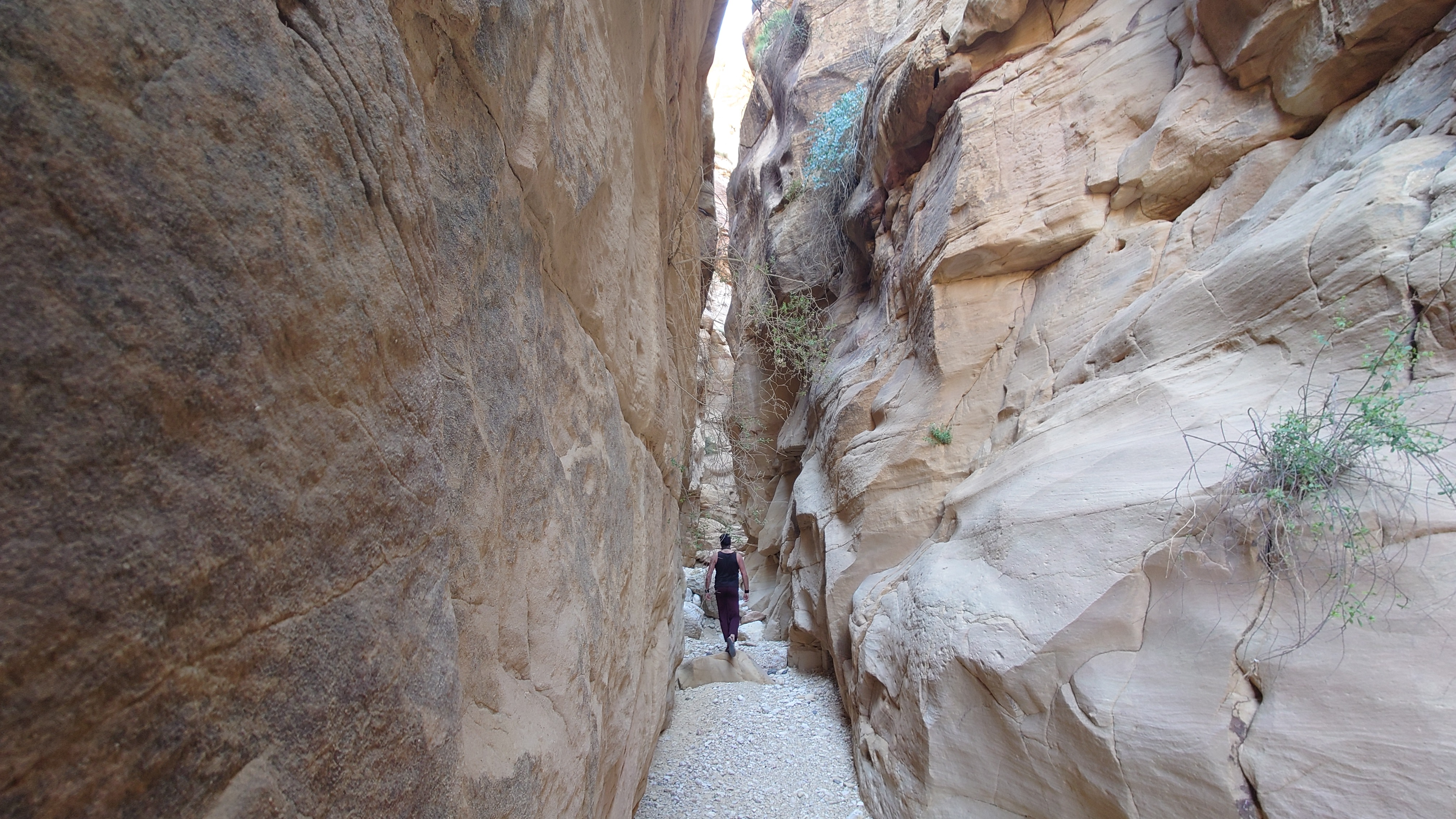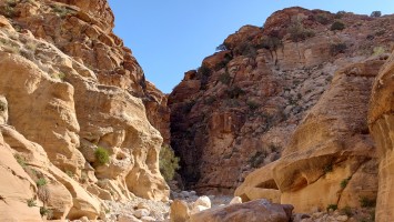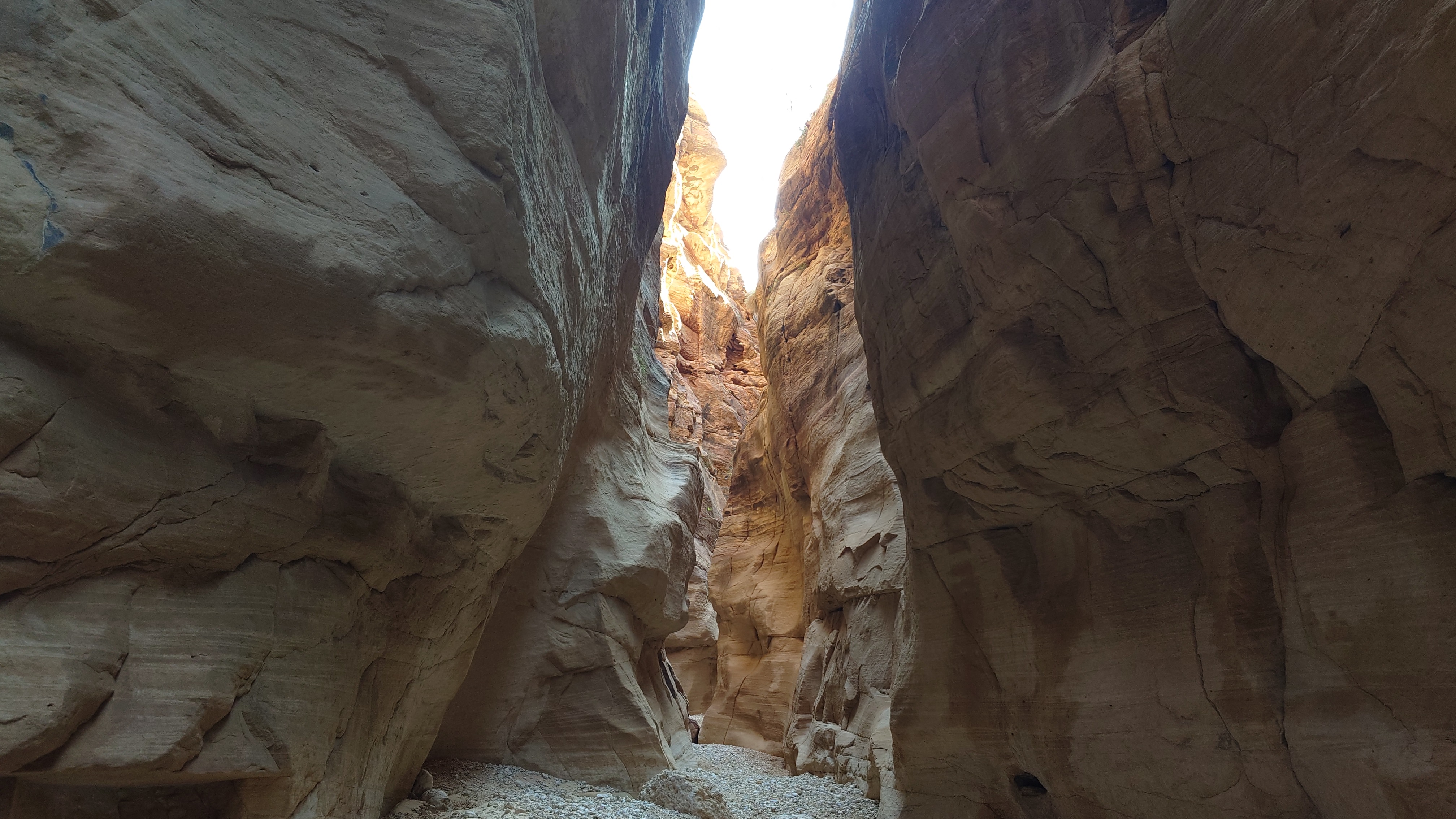 Den Tag über bleibt es unter 10 Grad. Es geht hinab ins Wadi unter meiner Übernachtungsstätte in eine faszinierende, schmale Schlucht. Ich soll laut Karte gleich wieder hinaus. Nee. Das muss ich mir anschauen und lasse meinen Rucksack zurück, um ein wenig hindurch zu wandern. Das würde auch Spaß machen: Von hieraus bis ins Jordantal durch die Schlucht. Viele quiekende Vögel haben hier ihre Nester.