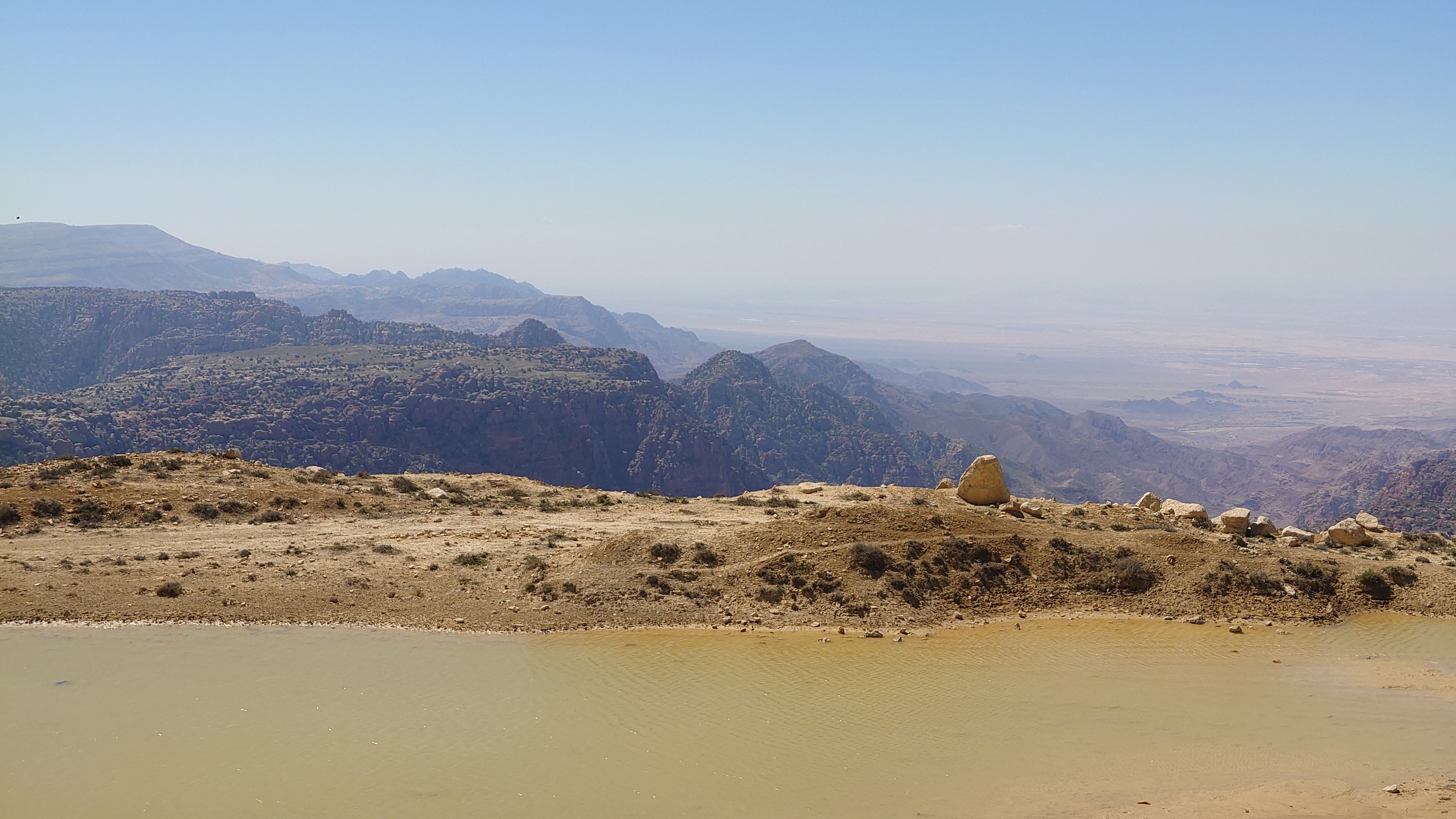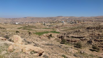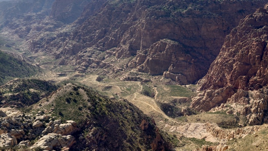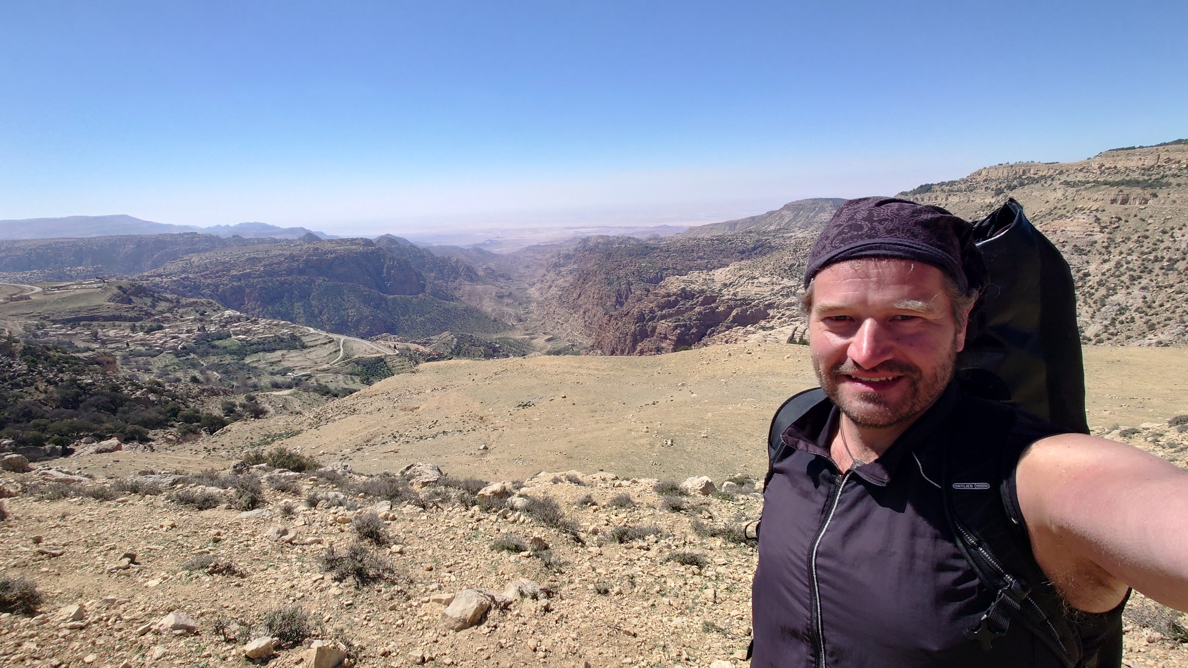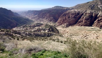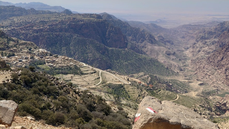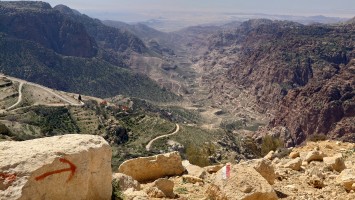 Der Aufstieg ist moderat, aber ewig lang, führt mich durch eine Ortschaft und einer nicht fertig gestellten Autobahn bis auf 1500 Meter Höhe hinauf. Ein saukalter Wind pfeift, der meine Glieder steif werden lässt, bis ich schließlich über den Zenit zum nächsten Tal schauen kann. Schlagartig verändert sich die Vegetation. Wo eben noch Wüste war, kommen auf einmal Kiefernwälder in Sicht. Die Hänge sind bewaldet. Weit unten strebt das Wadi Dana von mir weg und sieht komplett anders aus als alle Wadis vorher. Es ist geprägt durcht zerklüfteten, roten Sandstein und zieht sich lang durch in das -400 Meter tief gelegene Jordantal, das jetzt sehr breit geworden ist. Das Tote Meer habe ich mittlerweile hinter mir gelassen. Wunderschön sieht das Tal aus. Vor mir liegt das Dorf Dana zum Tal hin exponiert am Hang. Mein heutiges Ziel.