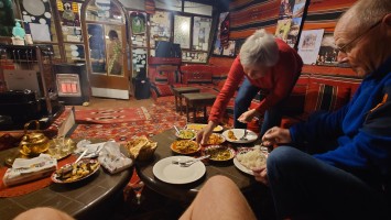 Das Abendessen hat Selma gekocht. Sie ist Köchin aus Bangladesch und vor 8 Jahren mit 20 ausgewandert, um hier ihr Glück zu suchen. Sie kocht für drei. Neben mir wohnt ein Ehepaar. Wolfram und Iris aus Chemnitz hat das selbe Schicksal wie mich ereilt. Sie sind am 27.2. aus Frankfurt angereist. Da war der Luftraum über Israel noch geöffnet. Jetzt sind sie ebenfalls hier, allerdings mit Mietwagen und nehmen es gelassen. Beim Essen kommen wir lange ins Gespräch. Sie sind beide Rentner und gut dabei, Sie bleiben mehrere Tage in Dana als Basislager und gehen viele Tagestouren von hier aus. Seit sie jung waren erwandern sie,.was geht. Ich nehme mir die beiden zum Vorbild. Wenn ich so drauf bin mit 60, dann ist alles gut. Sie verraten mir, dass es an meinem morgigen Zielort eine antike Kupfermine geben soll.