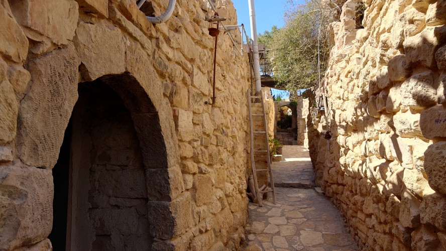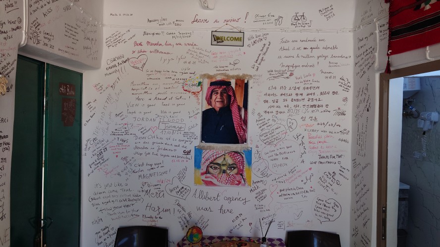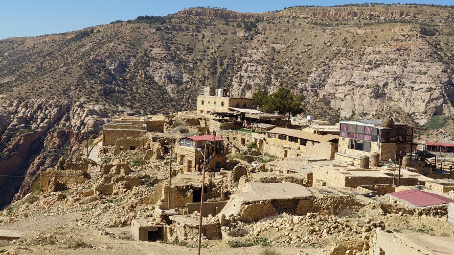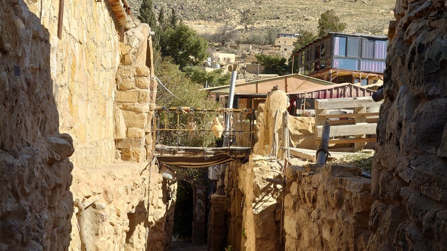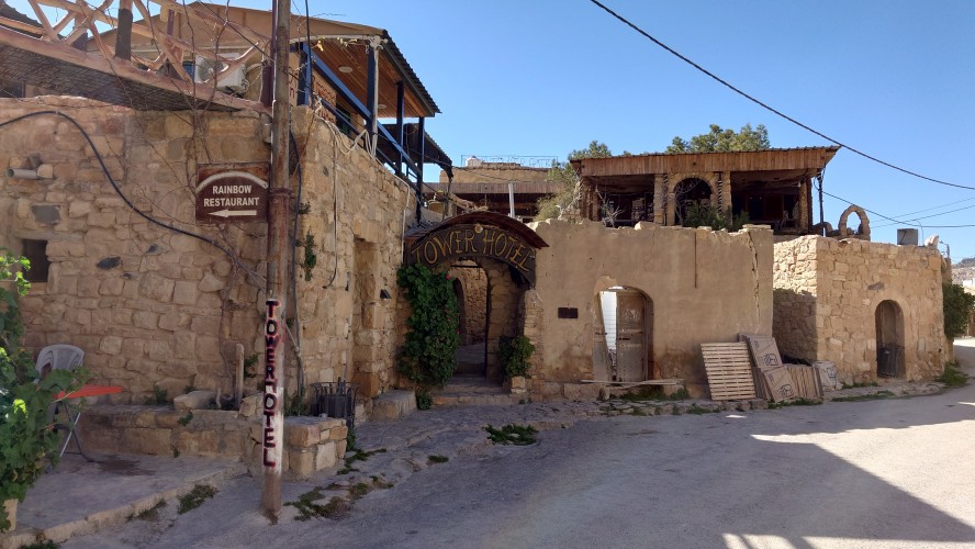 Der Ort ist relativ verlassen, besteht aber fast ausschließlich aus Fremdenunterkünften. Hiér ist an wärmeren Tagen - bzw. wenn gerade kein Krieg ist - sicherlich viel Wandertourismus. Ich habe mich für gnadenlose 10 JD ist Dana Tower Hotel eingebucht. Es ist ein Klötzchenwirrwar aus Mini-Zimmerchen, die man über schmale Treppen und Leitern erreicht. Auch ein Turmzimmer gibt mit Blick auf das imposante Tal. Tatsächlich bin ich nicht der einzige Gast heute.