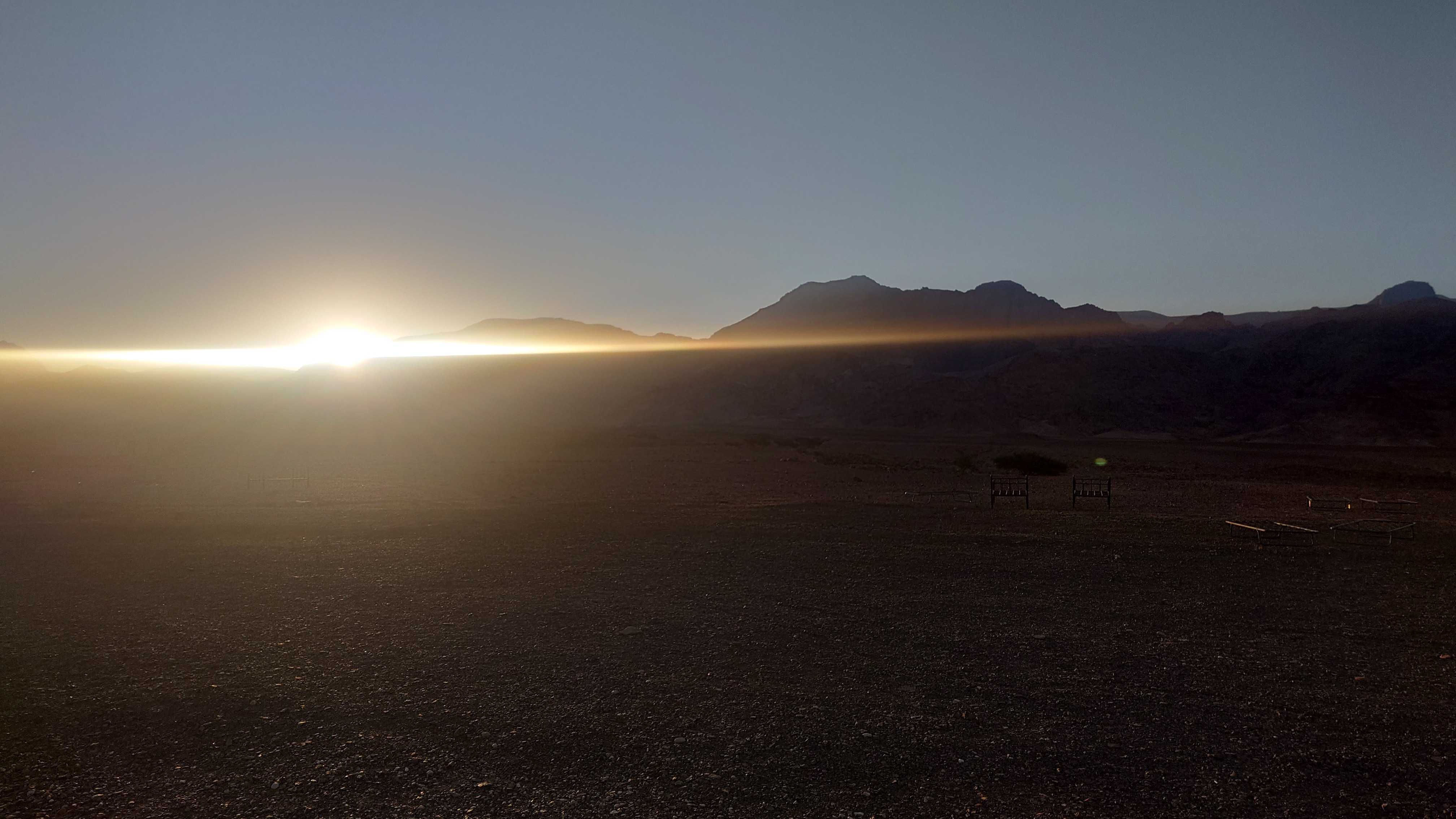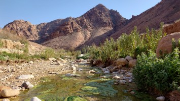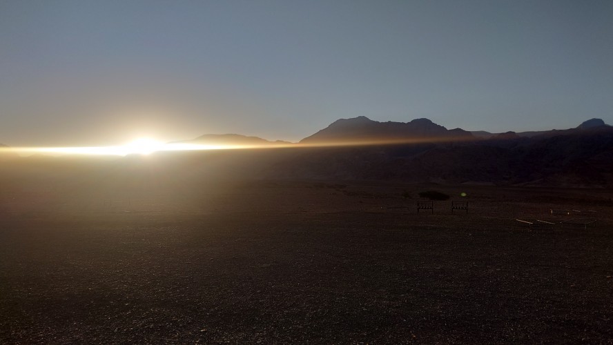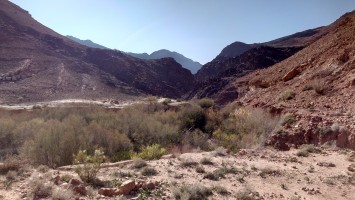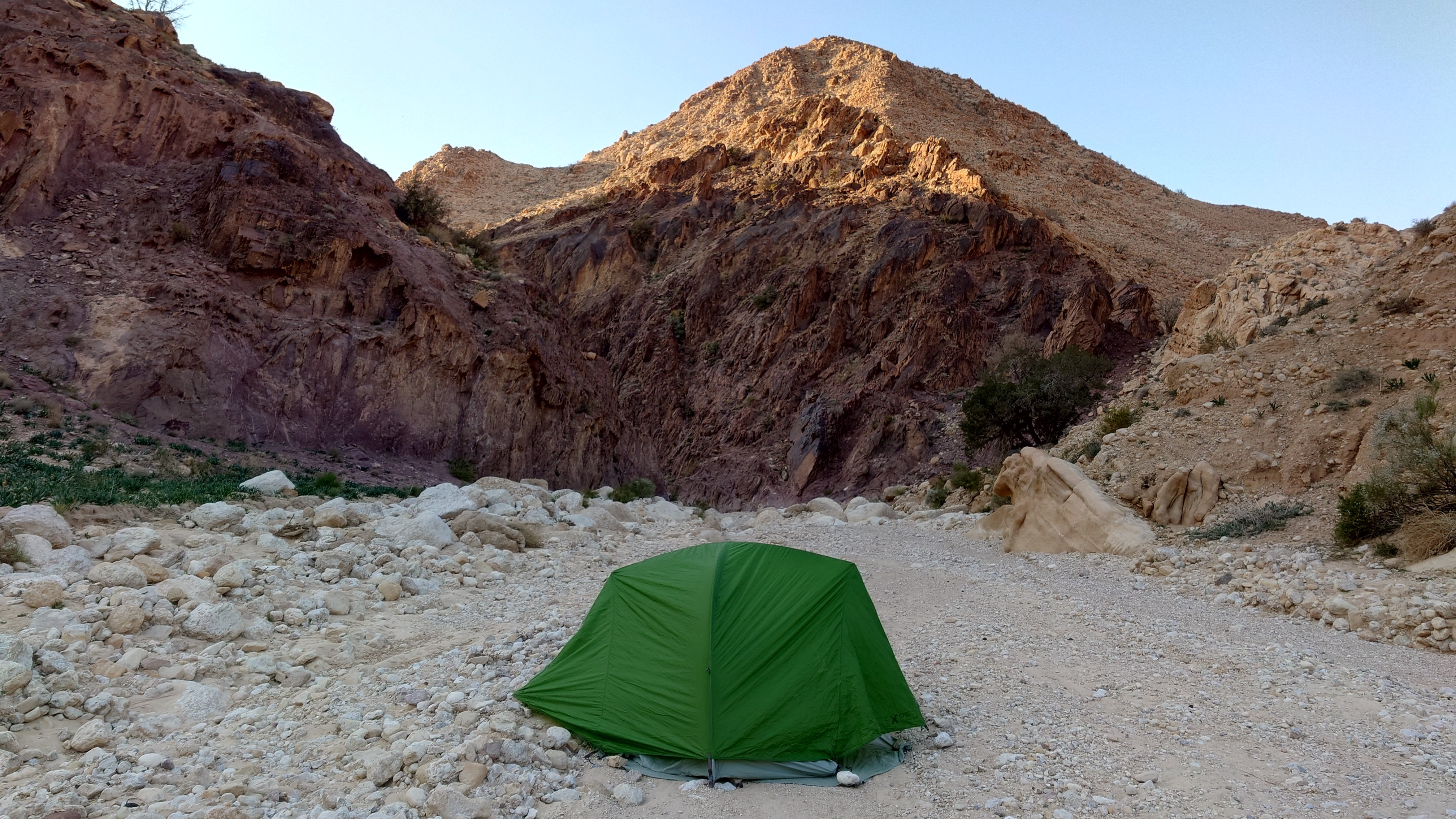 Gegen 17:30 erreiche ich tatsächlich ein Nebental, in dem es verdächtig rauscht. Und tatsächlich, es führt Wasser. Nicht viel. Ein "Wasserfall" ist das nicht, aber ein Bach, der so tief ist, dass ich meine Füße reinstecken und endlich Trinkpause machen kann. Das war anstrengend bis hierher. Zu anstrengend. Erstmal Fladenbrot von heute Morgen und Kekse futtern und Brausetabletten im Wasser auflösen. Ein Festessen. Viel Zeit kann ich mir nicht lassen. Ich fülle meine beiden Flaschen mit Flusswasser auf. Noch 3 Kilometer durch keine Schlucht muss ich hindurch, bis ich schließlich 18:30 kurz vor der Dämmung das Ende der Etappe erreiche. Eigentlich ist es kein richtiges Ende. Ich stehe mitten im Wadi... und das war's irgendwie. Um mich herum ist es totenstill. Hmm... na gut. Ich schlage mein Zelt im Flussbett auf. Dort ist es sandig und eben. Regen ist nicht angekündigt, dann wird es sich wohl über Nacht nicht adhoc füllen. Ich baue mein Zelt auf. Es wird auch schon kalt. Schon Bemerkenswert, dass ich während der 12 Stunden Dunkelheit jetzt dort drinhocke. Es ist so still, dass wirklich alles zum ein Vielfaches lauter erscheint draußen. Gruselig. Irgendwann vernehme ich einem sehr leises, weit entferntes Fliegeralarm-Echo von den Berghängen widerhallen. Ein Stein kullert irgendwo herunter. 18:48 wird auch irgendwo Allah gerufen. Dann ist es dunkel und nichts ist zu hören.