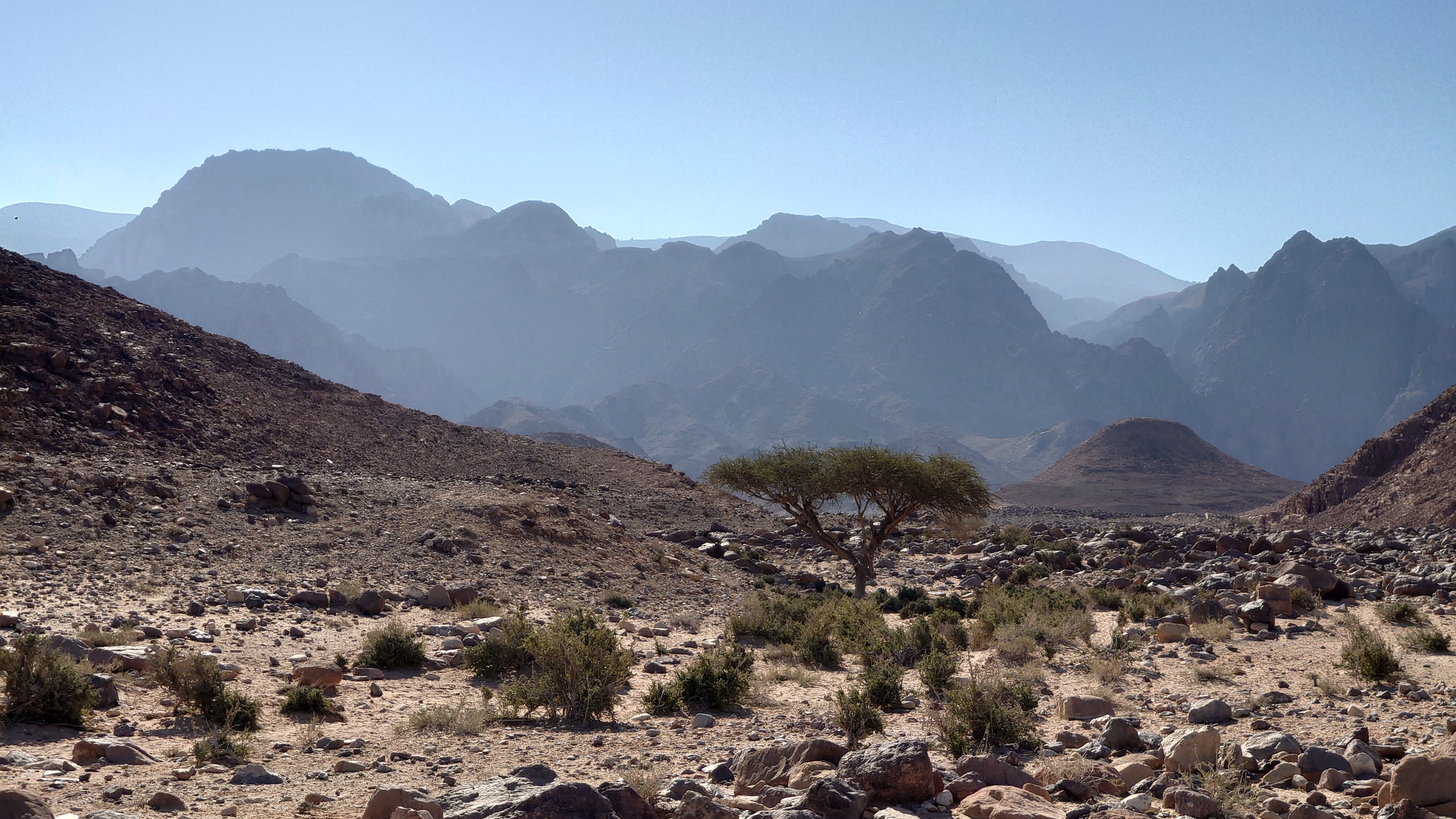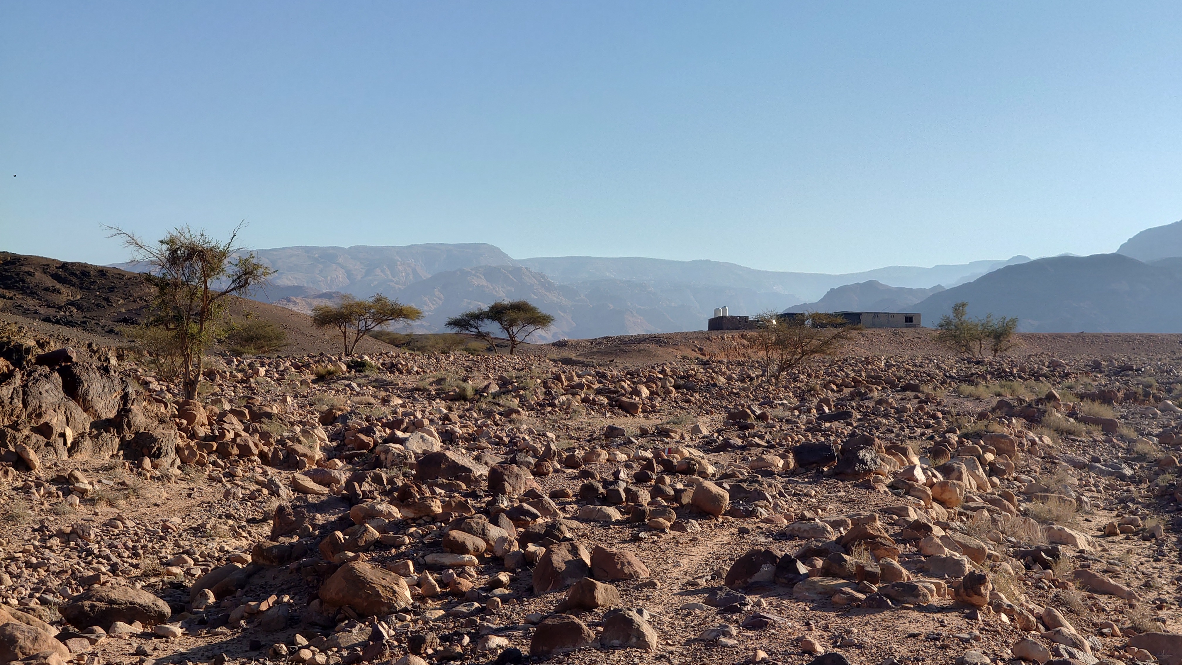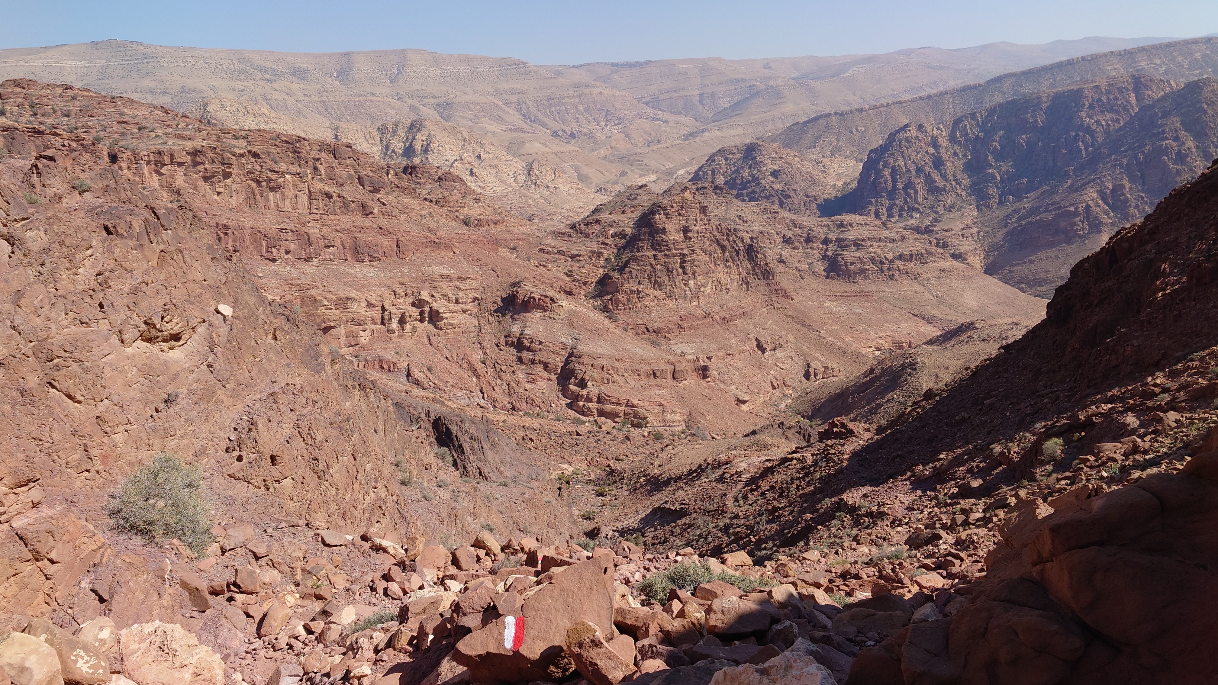 Der Weg führt lange entlang der Tiefebene an mehreren Beduinencamps vorbei. Es gibt auch Hunde, aber die Aggression der nördlicheren Camps ist hier nicht. Sie bellen zwar, aber lassen mich in Ruhe. Neugierige Köpfe gucken aus den Zelten und grüßen mich oder winken. Manchmal fliegt ein "Welcome" herüber. Es gibt wirklich niemals Missgunst. Hier unten sind Massen an Fliegen unterwegs. Es nervt gewaltig. Es weht auch kaum Wind und wird schnell warm. Der Weg ist anstrengend, weil es viel über Geröll geht, sodass auch vermeintlich ebene Streckenabschnitte zur Herausforderung werden. Irgendwann geht es endlich bergauf, sodass wenigstens die Fliegen weg geweht werden. 900 Meter geht es hinauf und es wird nicht besser. Es ist ein stundenlanger Balanceakt von Stein zu Stein und meine Füße brennen. In einem hatte Mohammed aber Recht: der Weg ist verdammt gut markiert. Alle 20 Meter ein Streifen, dazu Steinmännchen, die man schon von 2 Kilometer Entfernung aus sieht und ich den GPS Track im Grunde gar nicht brauche. Grandios. So muss das sein. Muss ich in Amman gleich als Kritikpunkt anbringen, dass "sein" Teil aber wirklich, wirklich... wirklich geil markiert ist und man das doch in den Abschnitten 1 bis 5 ebenso machen könnte.