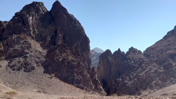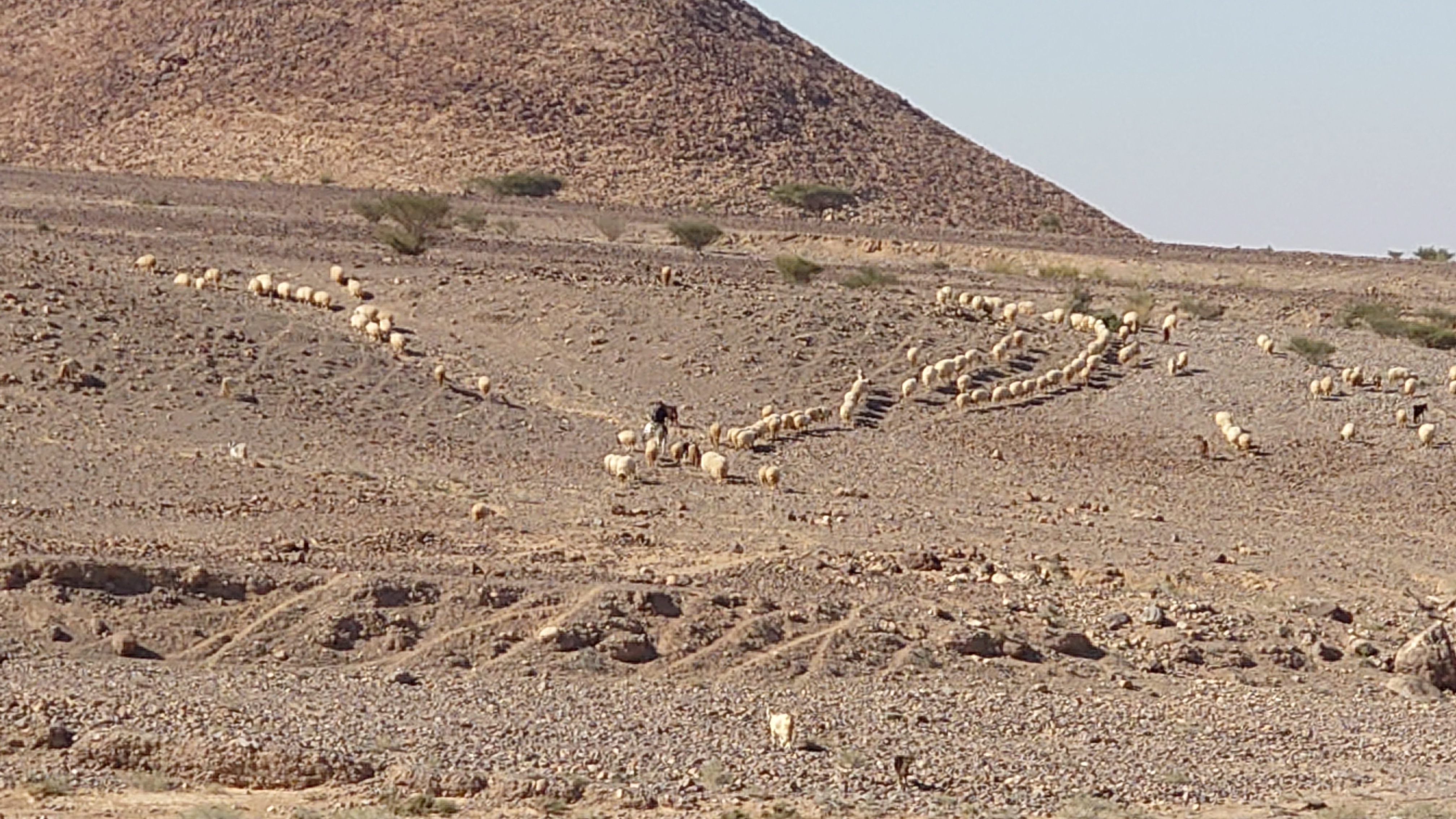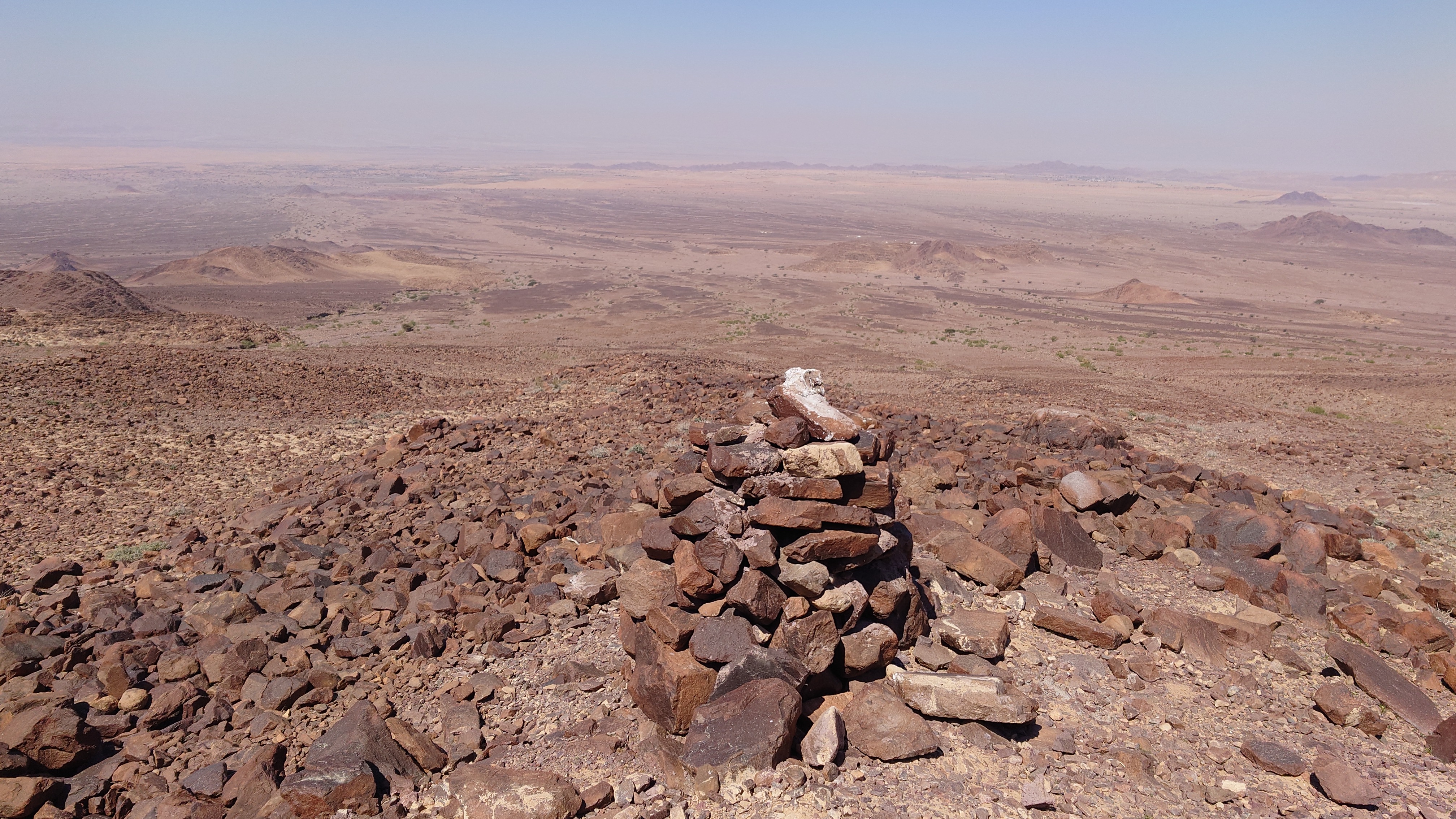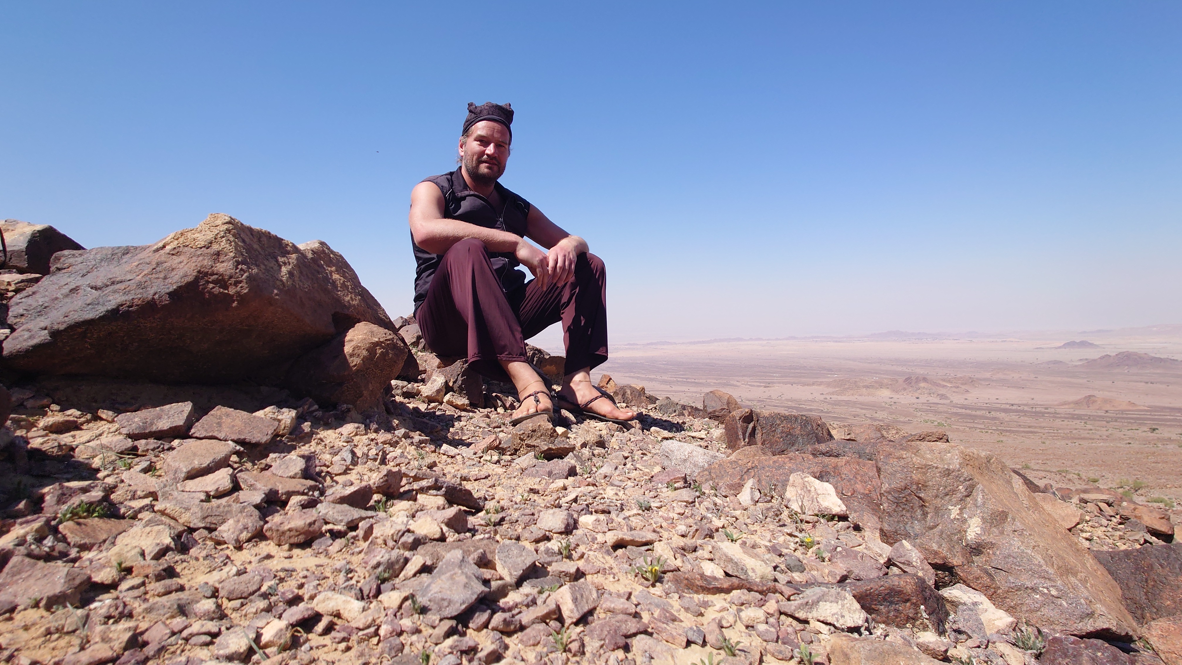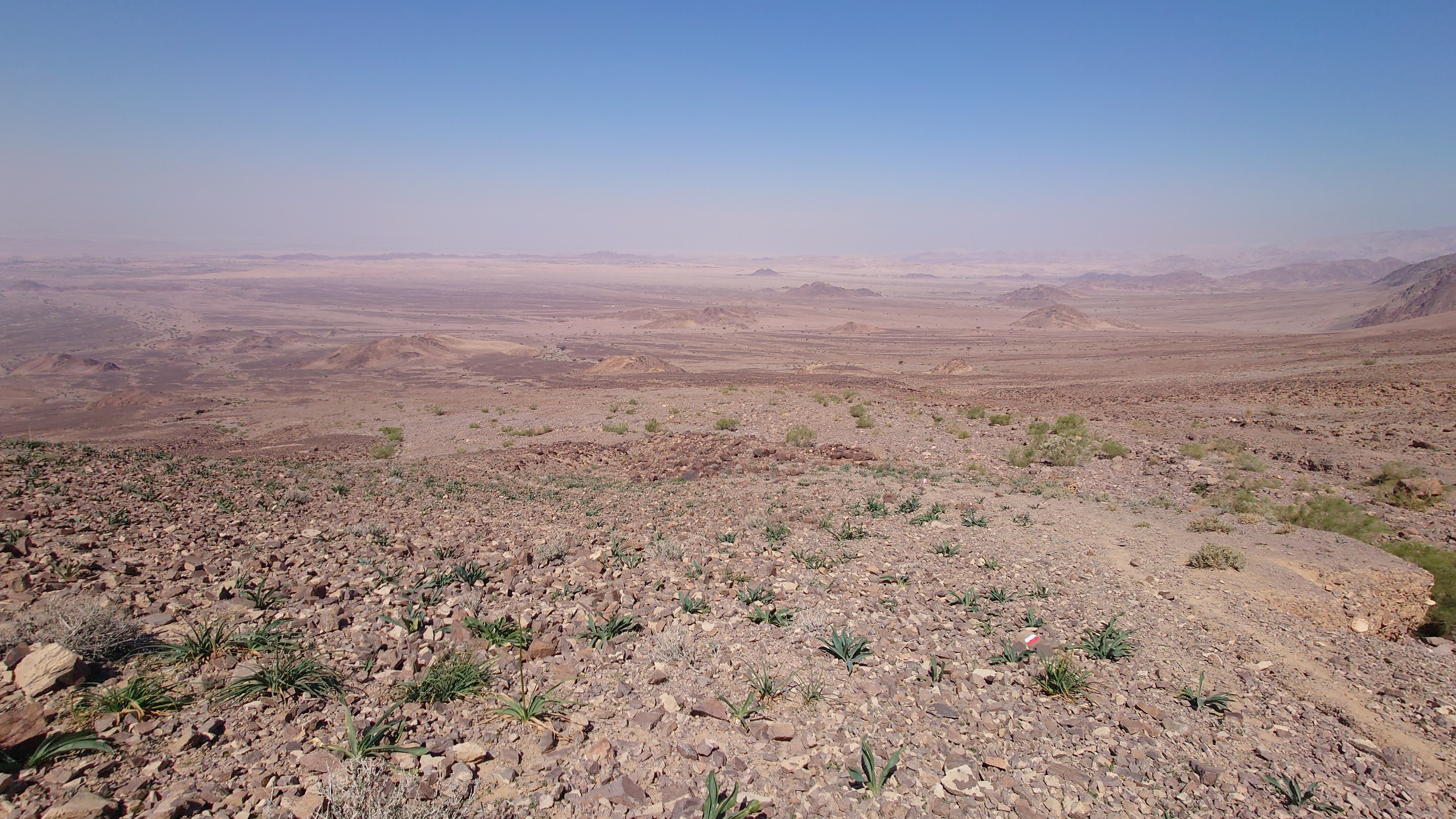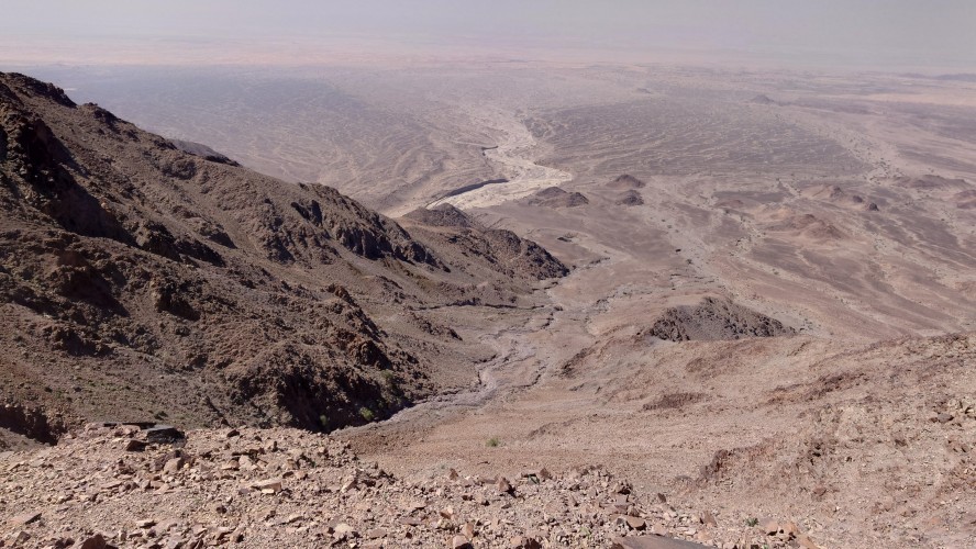 Je höher ich komme, desto mehr erstreckt sich unter mir eine endlos wirkende Wüstenlandschaft in den Südeesten. Da leben bestimmt Oryxe. Hier oben leider nur Fliegen, die meine Ohrmuscheln zum Hamsterrad spielen toll finden. Der Weg mündet in ein Kerbtal und es wird langsam wieder etwas grüner und schattiger. Mist. Wenn es schon schattig wird, bin ich viel zu spät dran. Gerade mal 7 Kilometer und schon 13:30 Uhr. Das ist nicht gut. Jetzt fangen meine Fußsohlen langsam an zu bribbeln. Zu viel spitzes Gestakse und jeder Schritt muss mit Vorsicht und Bedacht gesetzt werden. Es schlaucht. Gegen 15 Uhr passiere ich erst den höchsten Punkt auf etwa 1000 Metern, nur um vor mir eine Geröllhalde abwärts zu finden. Der eine Kilometer Luftline, den ich bergab muss, zieht sich über zwei Stunden. Ich bin körperlich das erste Mal am Limit. Viel Wasser habe ich noch nicht getrunken , weil ich nicht riskieren will, dass ich kein Wasser mehr habe, wenn der noch angekündigte Wasserfall doch trocken ist. Ich traue dem nicht ganz. Wo soll hier ein Wasserfall kommen. Es ist furztrocken. Ein Dromedarhirte mit Gewehr über der Schulter kommt mir entgegen. Ich frage ihn, ob gleich Wasser käme, aber er bietet mir nur was aus seinem Schlauch auf dem Esel an, den er mitführt. Nee. Das hält mein Darm ist aus, fürfhte ich. Außerdem habe ich noch 1,5 Liter. Aber ich muss was trinken, hilft nix. Mir kribbeln schon die Hände.