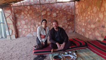 Beim Frühstück treffe ich das Pärchen ebenfalls an und wir kommen ins Gespräch. Abgesehen von den Wanderern gestern sind das hier eigentlich die ersten Hiker, die in etwa das selbe machen wie ich. Er heißt Eberhard... auf französisch wird das aber anders ausgesprochen. Sie heißt Michelle. Ich errate, dass sie aus Belgien kommen. Sie sind überrascht, die meisten würden wie bei Hercule Poirot auf Frankreich tippen. Naja. Letztes Jahr waren alle französisch sprechenden Touristen Belgier. Scheinbar lieben sie Jordanien. Die beiden machen geführte Tagestouren mit ihrem Begleiter Mohammed. Alleine trauen sie sich das nicht zu. Er fährt sie zu schönen Trails und sie machen gemeinsam Tagesetappen. Abends organisiert er Unterkünfte wie diese hier. Auch sie hat der Krieg überrascht. Sie waren sogar in der Botschaft in Amman, um sich zu erkundigen. Die hat im Grunde zur Ruhe gebeten, woraufhin sie sich entschieden haben zu bleiben. Sie meinten, ein paar andere Hiker aus ihrer Schicksalsgemeinschaft im Airport wären sofort wieder nach Hause geflogen mit der nächstbesten Maschine. Und so sind wir drei jetzt hier und essen Eier, Fladenbrot und trinken Tee. Mohammed errät mich als Deutschen. Er meinte, das sähe man, wegen den langen, blonden Haaren. Er mache seit 15 Jahren solche Touren. Es stellt sich heraus, dass er ein Trail Agel des Jordan Trails von der ersten Stunde ist und den Weg 2015 mit aufgebaut und getestet hat und findet, dass "seine" Abschnitte zwischen Dana und Petra natürlich die schönsten des ganzen Trails sind. Er ist sehr überzeugt von sich. Eberhard geht schonmal zusammenpacken. Mohammed macht noch ein Foto mit Michelle und mir und meint, es wäre schon hart zur Zeit. Das Geschäft geht sehr schlecht. Eigentlich wären in Camps wie diesem abends immer gemeinsame Lagerfeuer mit vielen anderen Wanderern. Aber das ist schon seit Corona deutlich anders geworden und erst Recht mit Beginn der Konflikte im Gazasteifen ab 2024.