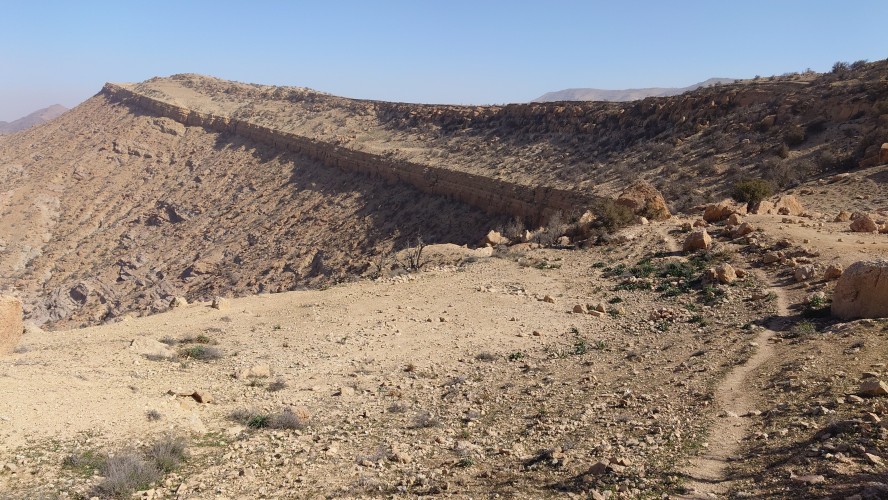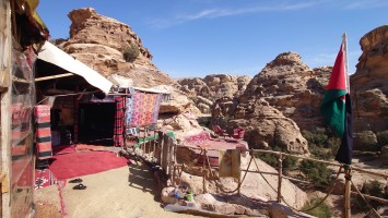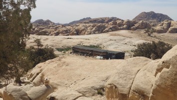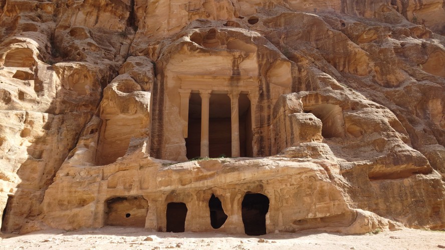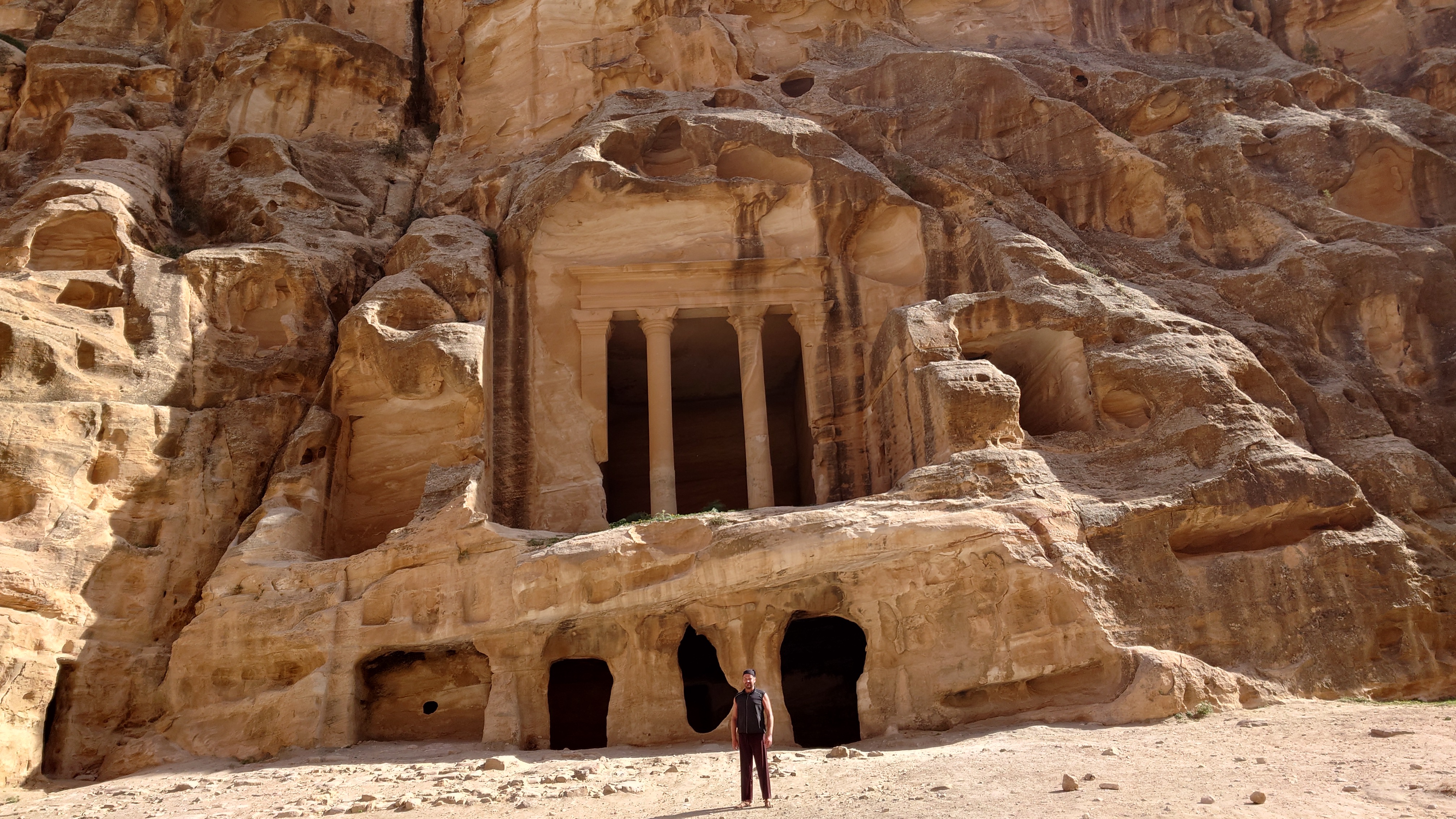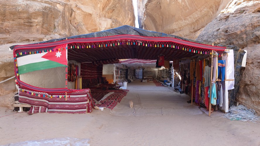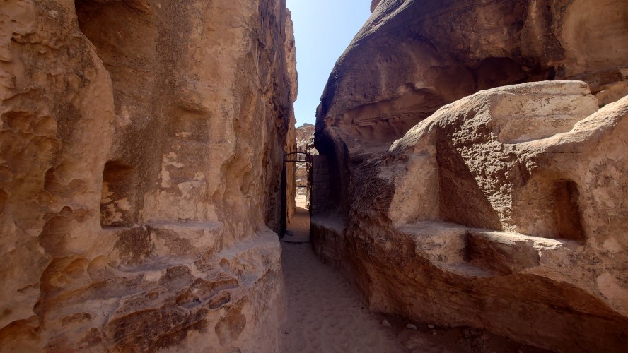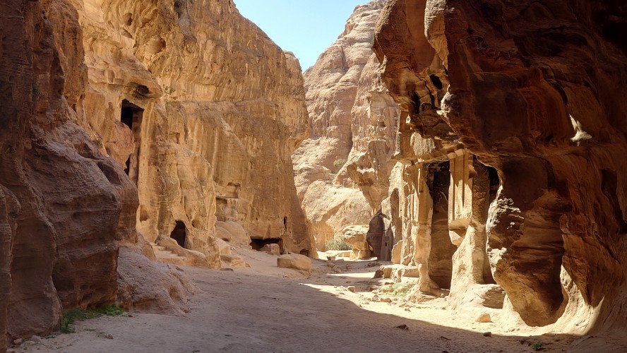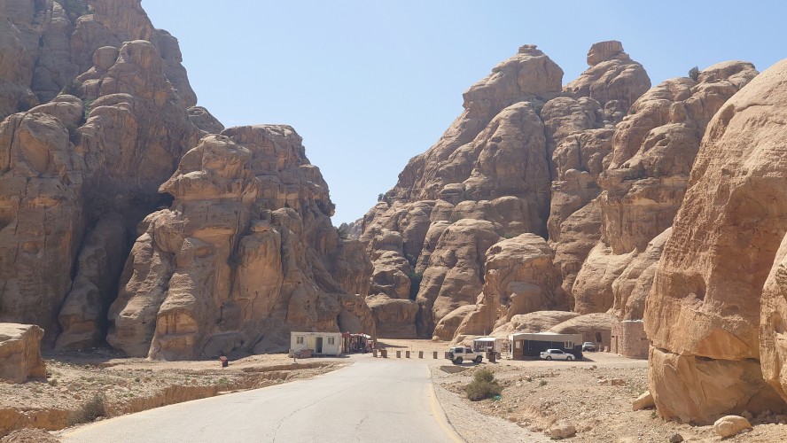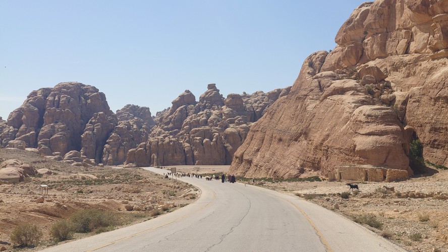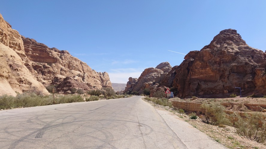 Die Piste führt schließlich zurück in die Zivilisation zu einer Straße, die zu meinem Zielort Al Beyda führt. Eine Infotafel am Eingang der Piste verrät, dass ich bereits auf einem Wandernetzwerk im Einzugsgebiet von Petra unterwegs bin. Mein Ziel ist nah. Aber erst einmal 8 Kilometer Straße. Na ob da nicht vielleicht ein... 30 Minuten bin ich unterwegs, bis schließlich ein... natürlich will ich mitfahren. Wir fahren die restlichen 5 Kilometer hinab nach Al Beyda. Von dort aus ist es nicht mehr weit bis zum Etappenziel mit dem Namen Little Petra. Die Umgebung hier ist eindeutig touristisch geprägt. Viele Camps: Beduin Camp, The Rock Camp, Little Petra Camp,.Petra View Lodge... nur eines fehlt komplett: die Touristen. Ein großer Parkplatz vor dem Eingang in den sogenannten "Vorort" von Petra zeugt davon, dass hier viele Autos und Busse erwartet werden würden, wäre da nicht dieses Raketenproblem über unseren Köpfen. Shops reihen sich aneinander mit allerlei Tourikram,.in denen Frauen versuchen etwas zu verkaufen an Menschen, die auf absehbare Zeit nicht kommen werden. Ein paar Verkäufer versuchen fast flehend eine Unterkunft an mich zu vermitteln. Der Eintritt in den Felsenstadt-Vorort ist aber frei und ich bekomme einen ersten Eindruck davon, was mich wohl morgen erwarten wird. Tempel,.Behausungen, Zisternen, Bewässerungsanlagen und Treppen sind hier vor 2000 Jahren in den Fels gegraben worden. Niemenad ist da. Nur drei Ziegen huschen einmal rein, machen ein kräftig echondes "Määäh" und schwirren wieder davon. Die Location wirkt durch das gänzliche Fehlen von Leuten natürlich umso anmutiger. Alles meins. Wenn es nicht mit solch tragischen Unständen verbunden wäre, wäre es wohl der ultimative Traum eines jeden Besuchers, diese Stätten für sich allein zu haben. Aber auch hier häulen, während ich langsam von Bauwerk zu Bauwerk schlenderte, zwei Mal die Fliegersirenen los. Es rummst zweimal dumpf aus der Ferne und echot durchs das Kerbtal der Felsenstadt.