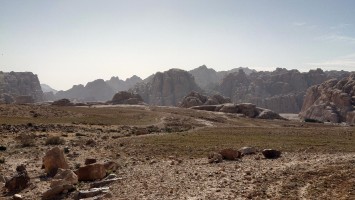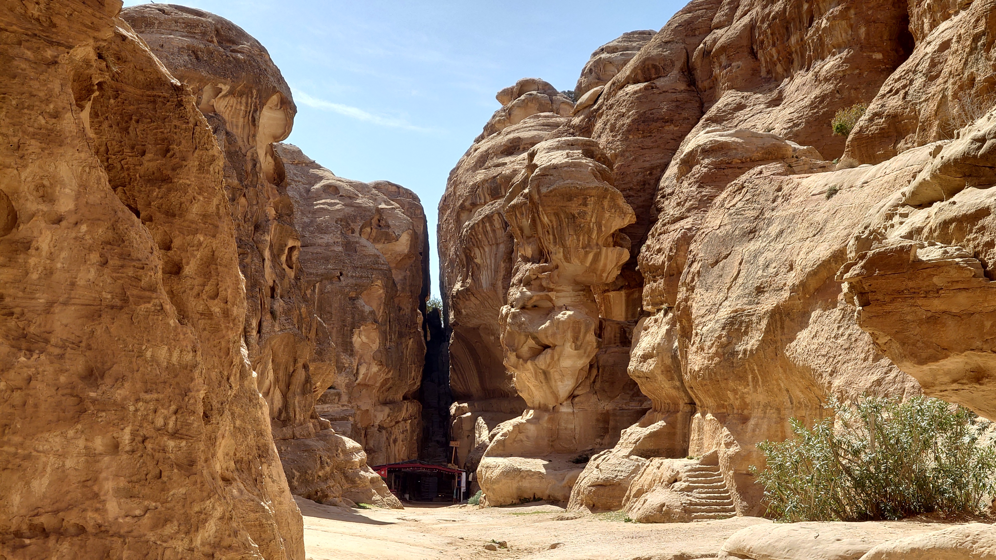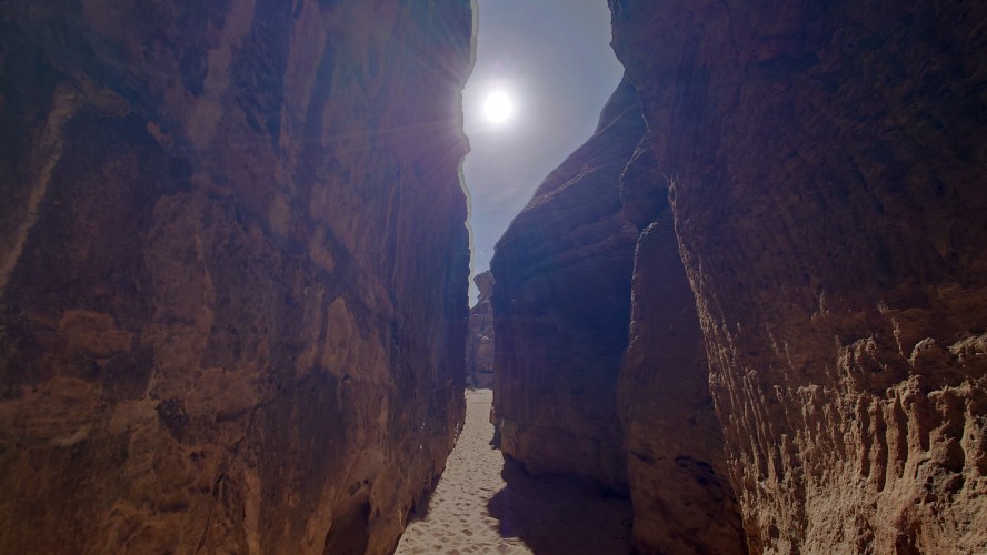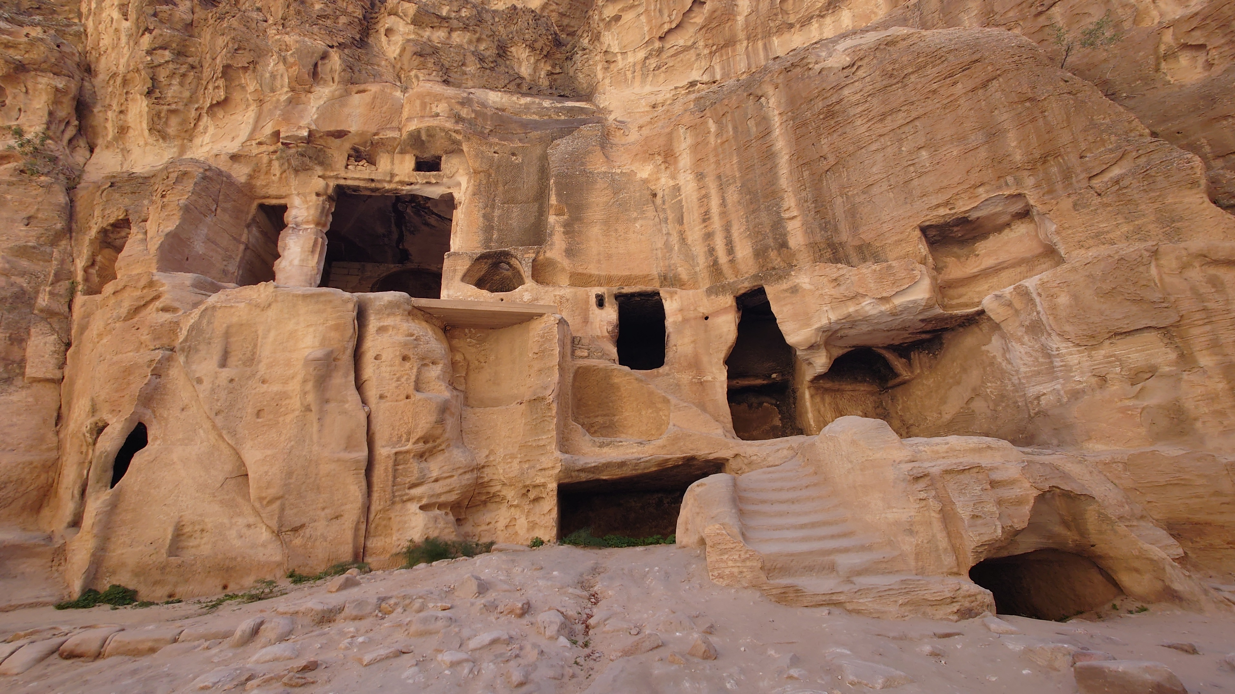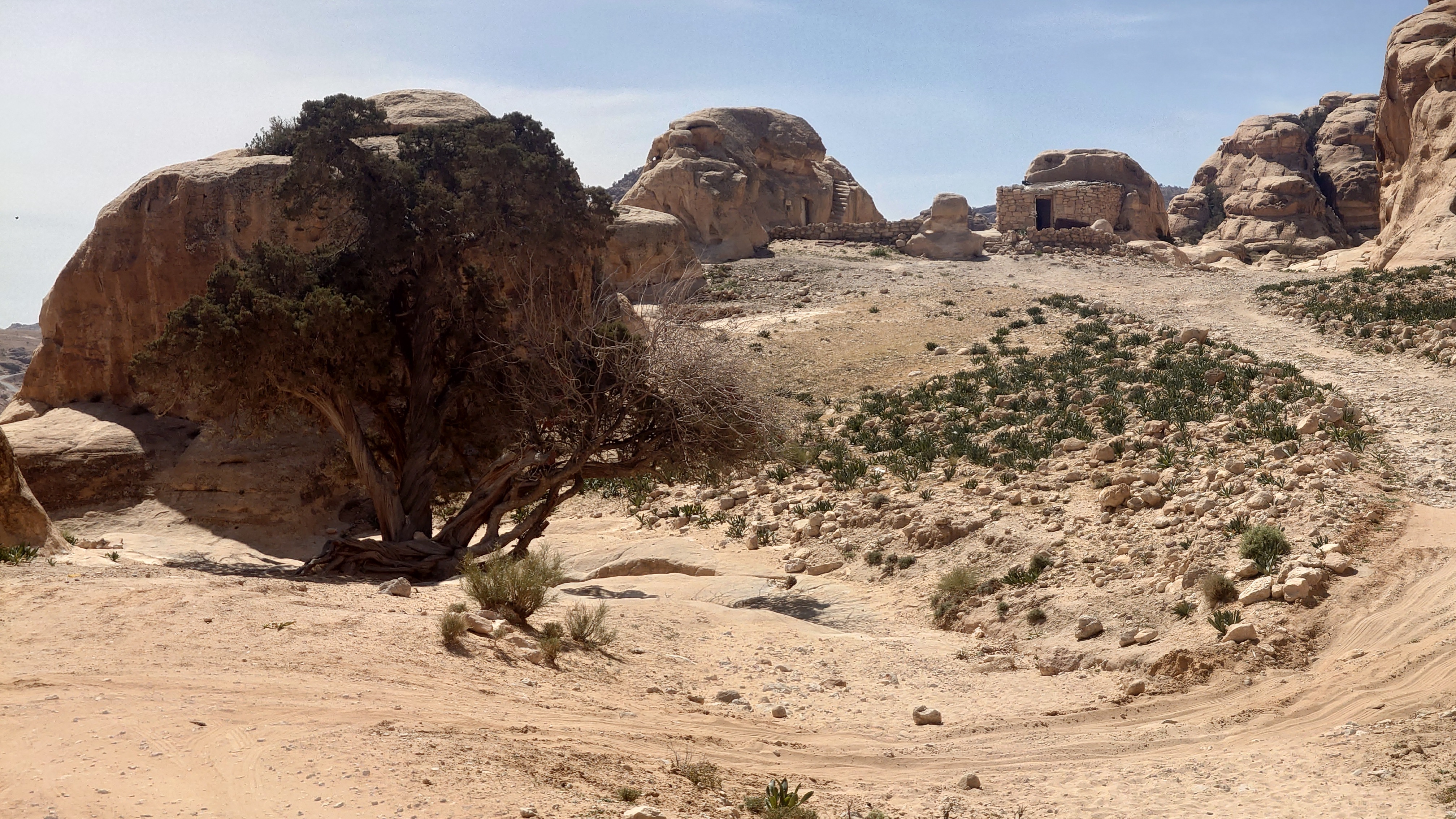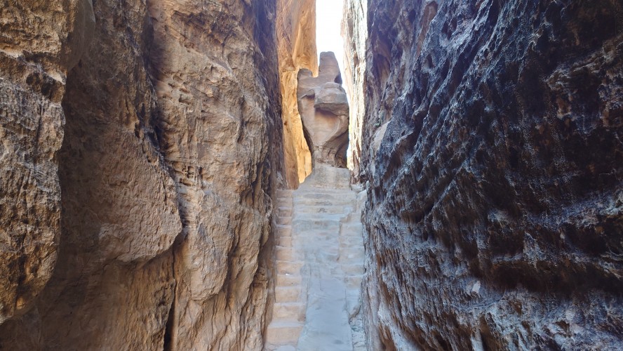 Die Piste führt schließlich zurück in die Zivilisation zu einer Straße, die zu meinem Zielort Al Beyda führt. Eine Infotafel am Eingang der Piste verrät, dass ich bereits auf einem Wandernetzwerk im Einzugsgebiet von Petra unterwegs bin. Mein Ziel ist nah. Aber erst einmal 8 Kilometer Straße. Na ob da nicht vielleicht ein... 30 Minuten bin ich unterwegs, bis schließlich ein... natürlich will ich mitfahren. Wir fahren die restlichen 5 Kilometer hinab nach Al Beyda. Von dort aus ist es nicht mehr weit bis zum Etappenziel mit dem Namen Little Petra. Die Umgebung hier ist eindeutig touristisch geprägt. Viele Camps: Beduin Camp, The Rock Camp, Little Petra Camp,.Petra View Lodge... nur eines fehlt komplett: die Touristen. Ein großer Parkplatz vor dem Eingang in den sogenannten "Vorort" von Petra zeugt davon, dass hier viele Autos und Busse erwartet werden würden, wäre da nicht dieses Raketenproblem über unseren Köpfen. Shops reihen sich aneinander mit allerlei Tourikram,.in denen Frauen versuchen etwas zu verkaufen an Menschen, die auf absehbare Zeit nicht kommen werden. Ein paar Verkäufer versuchen fast flehend eine Unterkunft an mich zu vermitteln. Der Eintritt in den Felsenstadt-Vorort ist aber frei und ich bekomme einen ersten Eindruck davon, was mich wohl morgen erwarten wird. Tempel,.Behausungen, Zisternen, Bewässerungsanlagen und Treppen sind hier vor 2000 Jahren in den Fels gegraben worden. Niemenad ist da. Nur drei Ziegen huschen einmal rein, machen ein kräftig echondes "Määäh" und schwirren wieder davon. Die Location wirkt durch das gänzliche Fehlen von Leuten natürlich umso anmutiger. Alles meins. Wenn es nicht mit solch tragischen Unständen verbunden wäre, wäre es wohl der ultimative Traum eines jeden Besuchers, diese Stätten für sich allein zu haben. Aber auch hier häulen, während ich langsam von Bauwerk zu Bauwerk schlenderte, zwei Mal die Fliegersirenen los. Es rummst zweimal dumpf aus der Ferne und echot durchs das Kerbtal der Felsenstadt.