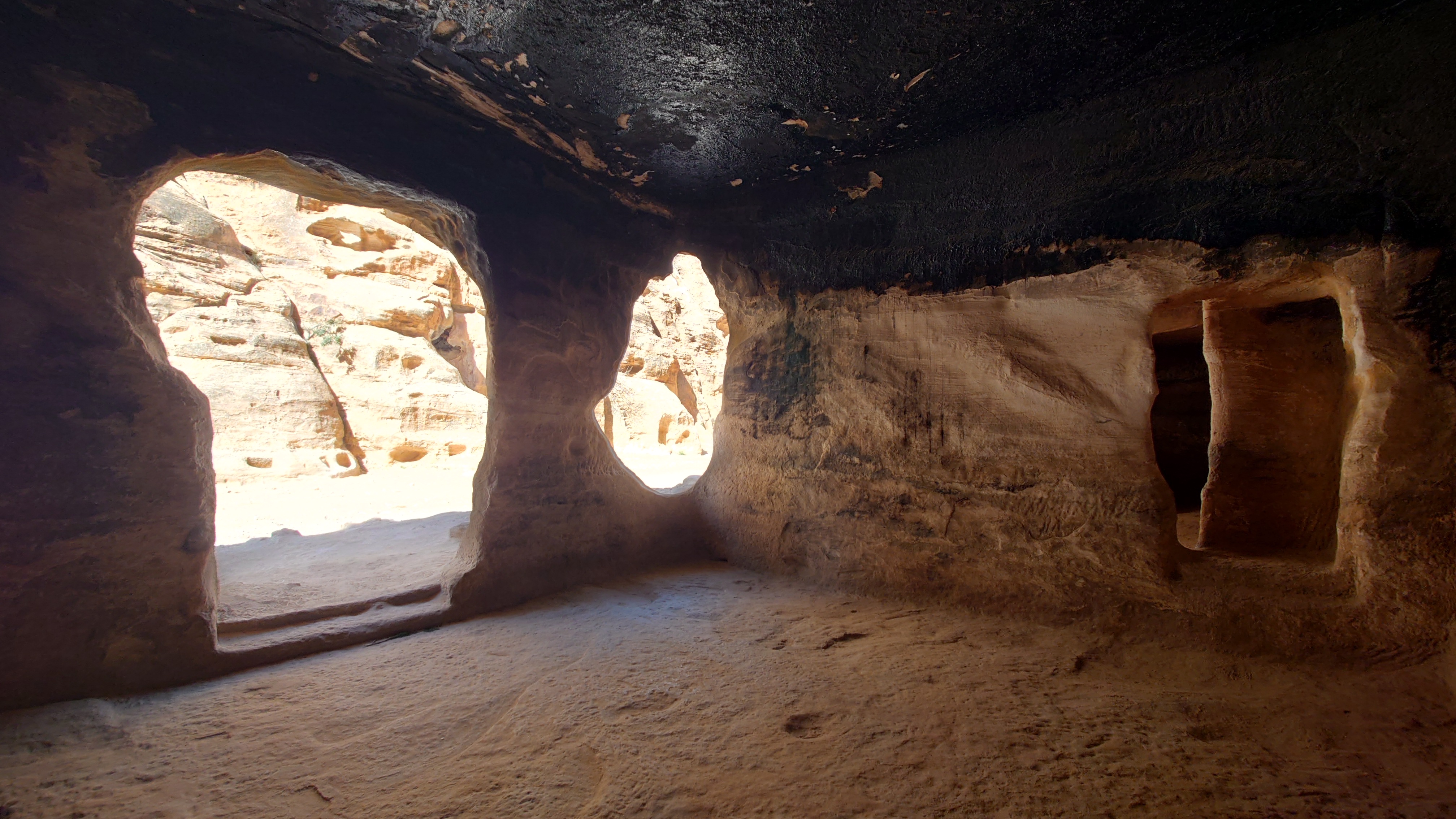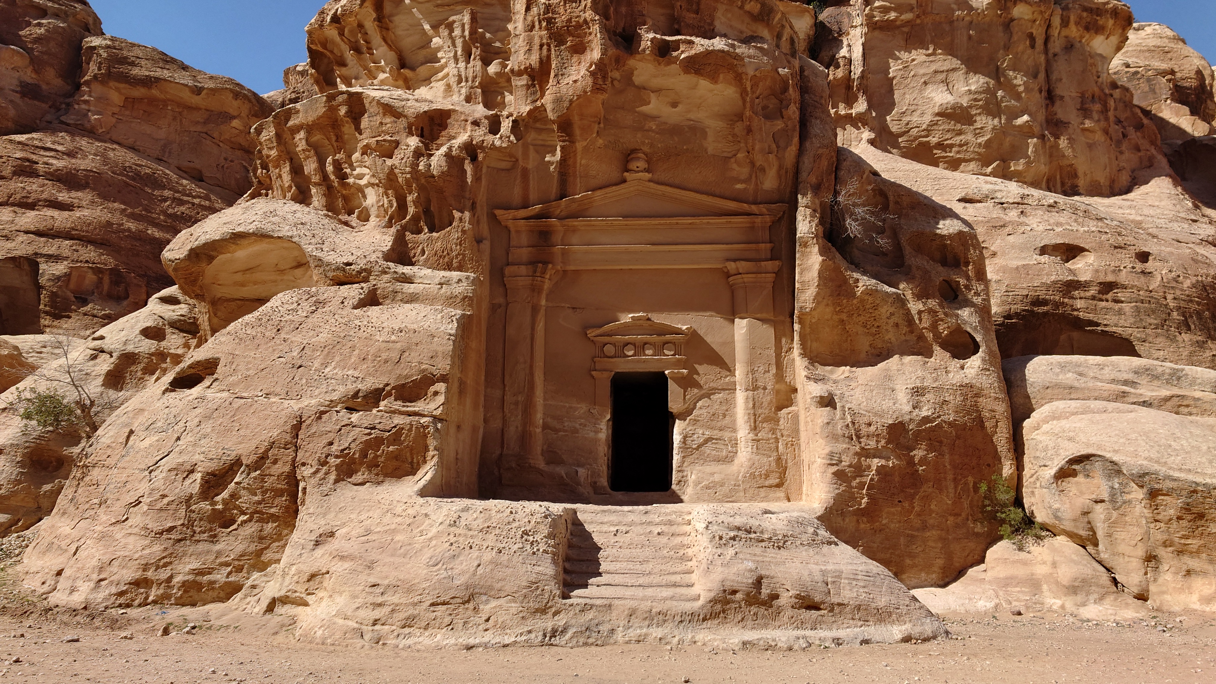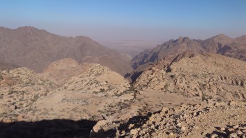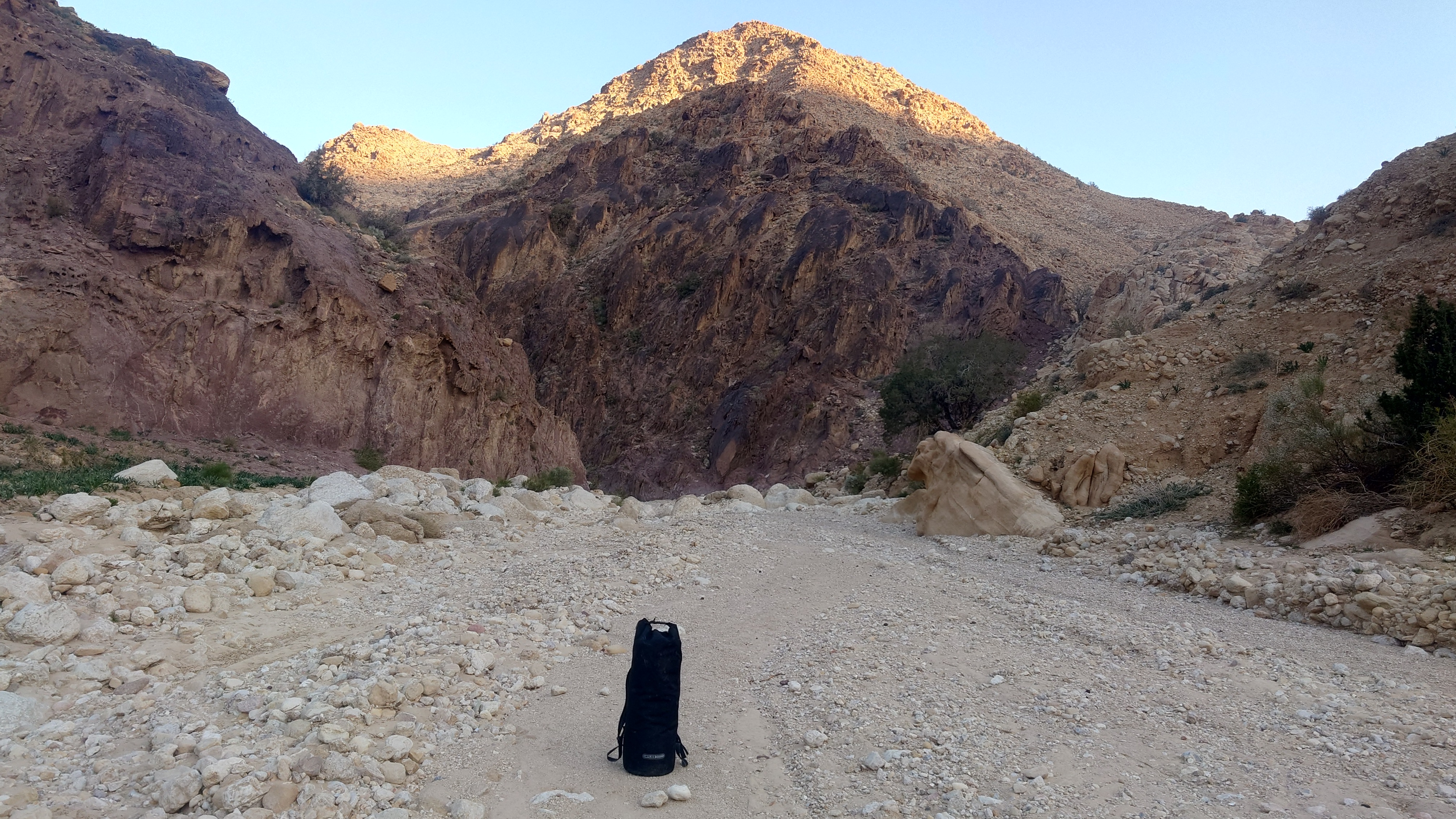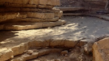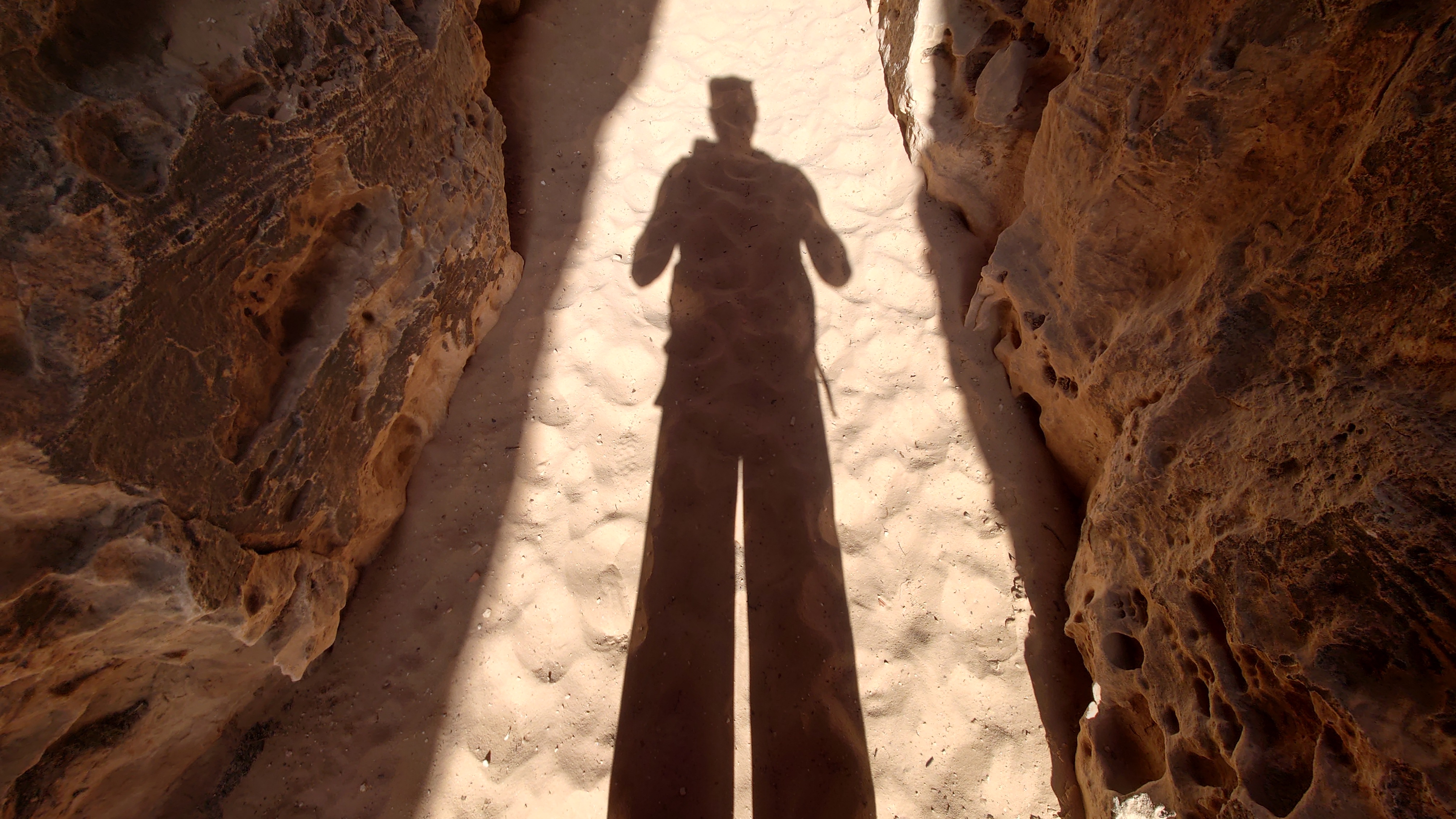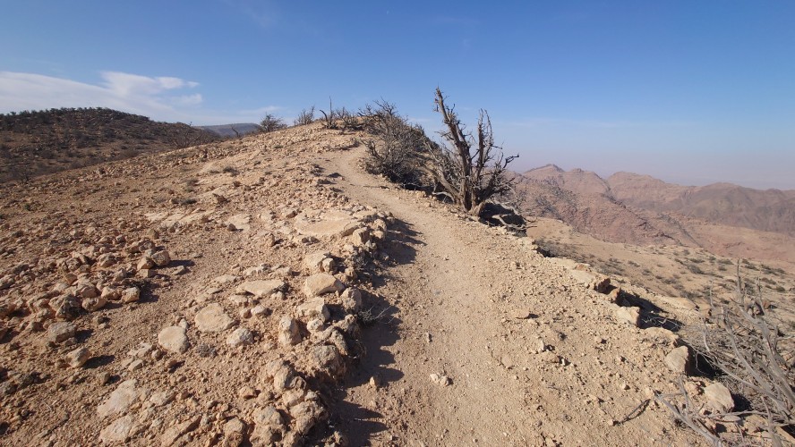 Die Piste führt schließlich zurück in die Zivilisation zu einer Straße, die zu meinem Zielort Al Beyda führt. Eine Infotafel am Eingang der Piste verrät, dass ich bereits auf einem Wandernetzwerk im Einzugsgebiet von Petra unterwegs bin. Mein Ziel ist nah. Aber erst einmal 8 Kilometer Straße. Na ob da nicht vielleicht ein... 30 Minuten bin ich unterwegs, bis schließlich ein... natürlich will ich mitfahren. Wir fahren die restlichen 5 Kilometer hinab nach Al Beyda. Von dort aus ist es nicht mehr weit bis zum Etappenziel mit dem Namen Little Petra. Die Umgebung hier ist eindeutig touristisch geprägt. Viele Camps: Beduin Camp, The Rock Camp, Little Petra Camp,.Petra View Lodge... nur eines fehlt komplett: die Touristen. Ein großer Parkplatz vor dem Eingang in den sogenannten "Vorort" von Petra zeugt davon, dass hier viele Autos und Busse erwartet werden würden, wäre da nicht dieses Raketenproblem über unseren Köpfen. Shops reihen sich aneinander mit allerlei Tourikram,.in denen Frauen versuchen etwas zu verkaufen an Menschen, die auf absehbare Zeit nicht kommen werden. Ein paar Verkäufer versuchen fast flehend eine Unterkunft an mich zu vermitteln. Der Eintritt in den Felsenstadt-Vorort ist aber frei und ich bekomme einen ersten Eindruck davon, was mich wohl morgen erwarten wird. Tempel,.Behausungen, Zisternen, Bewässerungsanlagen und Treppen sind hier vor 2000 Jahren in den Fels gegraben worden. Niemenad ist da. Nur drei Ziegen huschen einmal rein, machen ein kräftig echondes "Määäh" und schwirren wieder davon. Die Location wirkt durch das gänzliche Fehlen von Leuten natürlich umso anmutiger. Alles meins. Wenn es nicht mit solch tragischen Unständen verbunden wäre, wäre es wohl der ultimative Traum eines jeden Besuchers, diese Stätten für sich allein zu haben. Aber auch hier häulen, während ich langsam von Bauwerk zu Bauwerk schlenderte, zwei Mal die Fliegersirenen los. Es rummst zweimal dumpf aus der Ferne und echot durchs das Kerbtal der Felsenstadt.