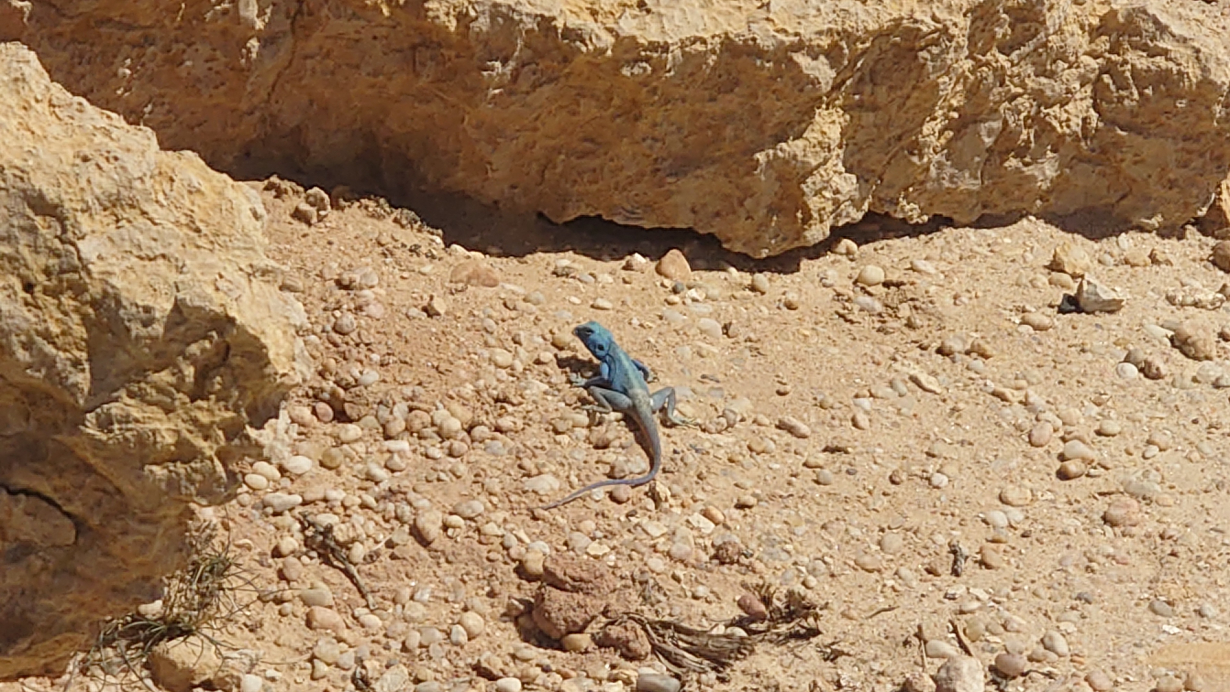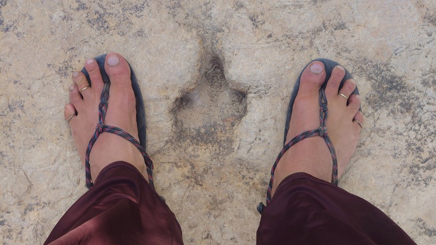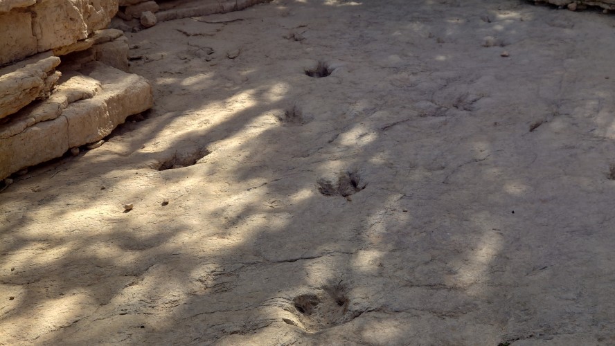 Ich treffe schließlich wieder auf den Weg, der an einer Abbruchkante entlang führt, die ein großes Tal abgrenzt. Im Gegensatz zu gestern wird der Weg zur Autobahn und verläuft genau entlang einer Gesteinsschicht, in der auffällig viele Muschelversteigerungen stecken. Es wird warm, aber erstaunlicherseise sind heute keine Fliegen mehr da. Was anstrengend bleibt, ist das permanente Kurs korrigieren, weil es meist über Sandstein gehr. Ich mäandere immer so Plusminus 50 Meter um den unmarkierten Weg herum und es kostet doch wieder Zeit.
