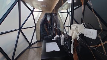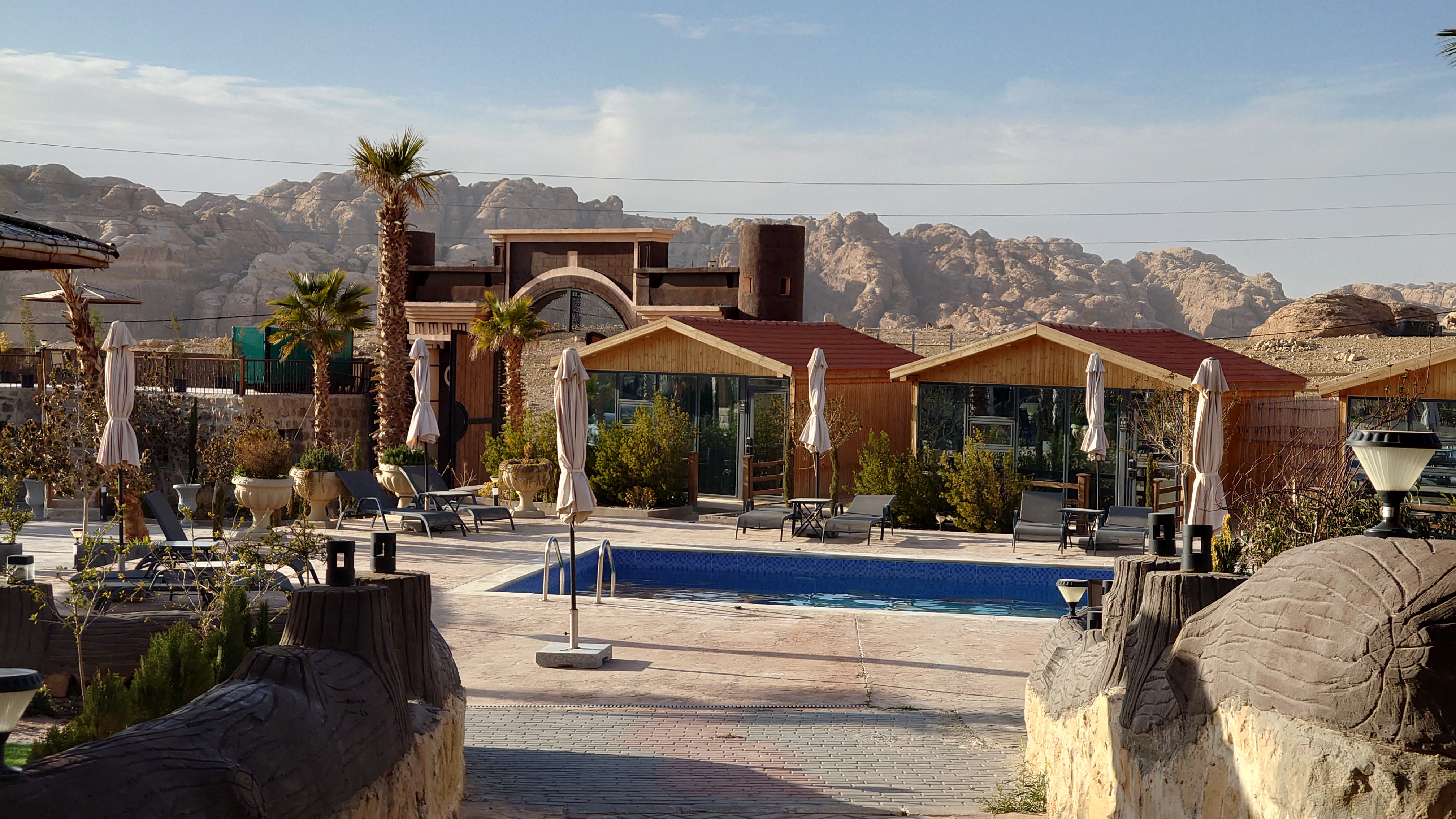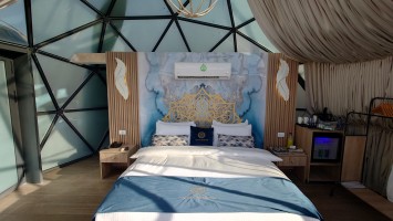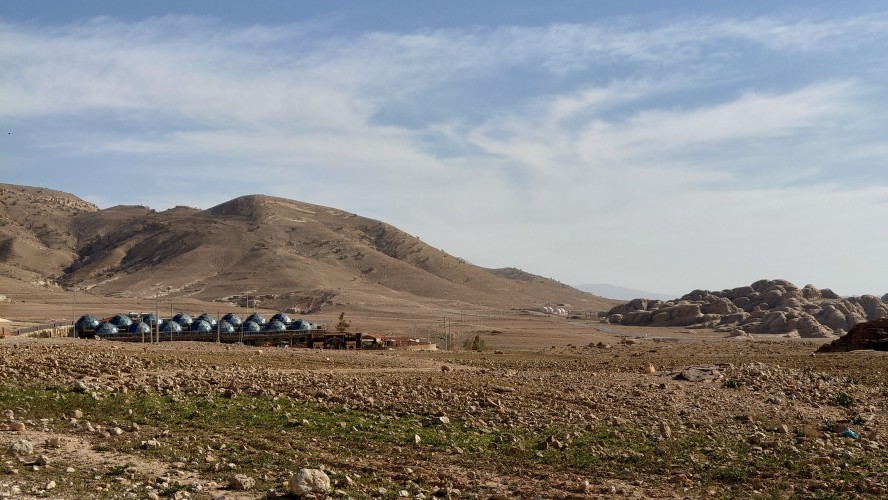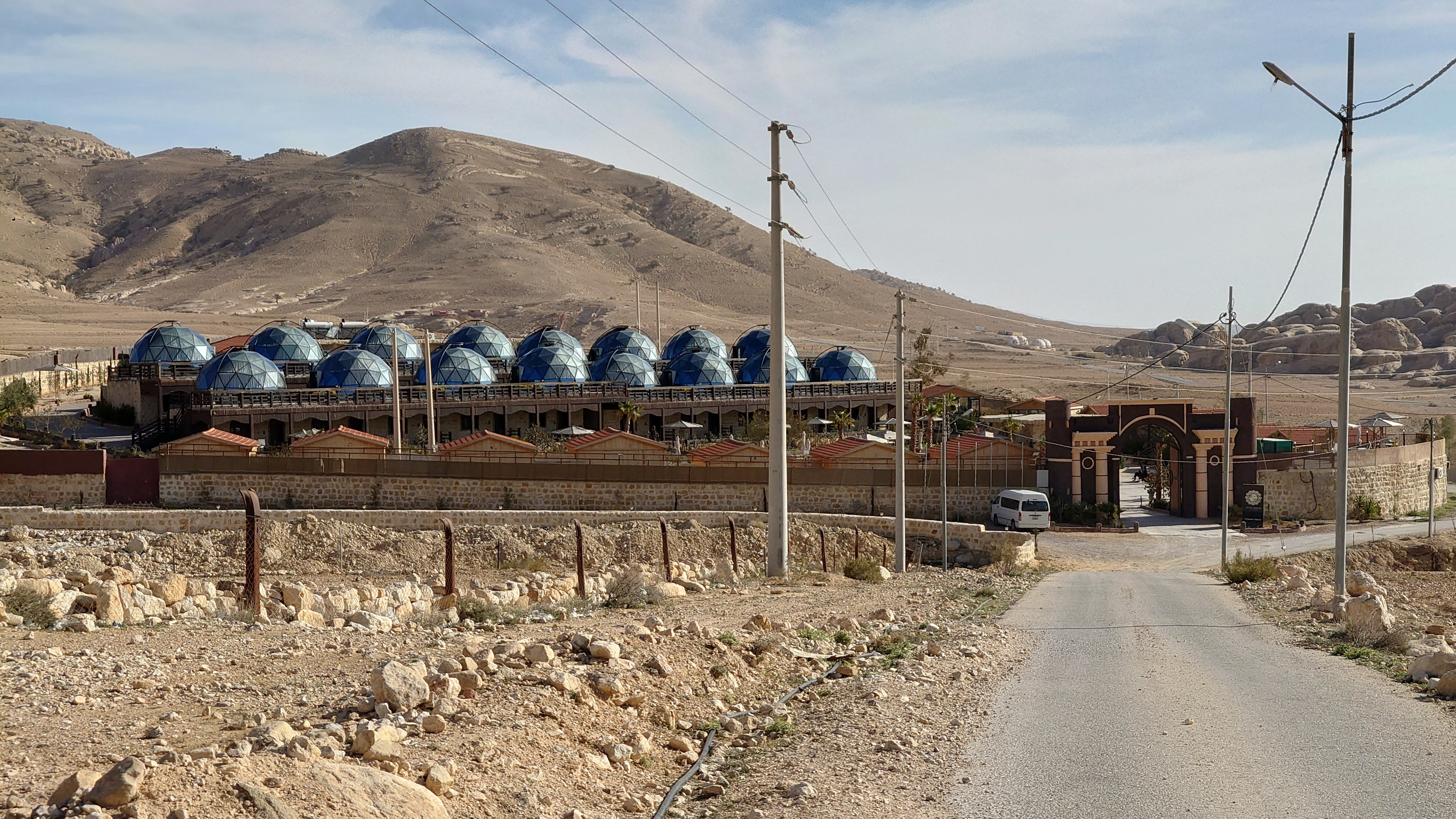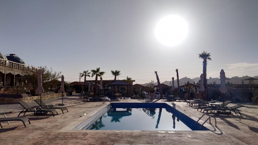 Gegen 16 Uhr begebe ich mich in den Ort, vorbei an einem Supermarkt, der komplett ausgeblutet noch genau eine Limo anbietet. Ich habe da was gesehen beim reinfahren. So ne Weltraumbehausung. Tatsächlich gibt es hier ein Grandhotel mit Sphären, unter denen man schlafen kann. Ich komme hinein und werde wieder ungläubig angeschaut. Ja, ich habe. icht gebucht und naja, vielleicht kann ich in so einer Kugel da vielleicht übernachten vielleicht? Griiiins. Ich darf. Mega Special Price. Es ist nämlich sonst niemand hier. Statt 200 JD heute nur 70. Aaaber: alles hat zu: Das Restaurant, die Bar. Kein Abendessen, kein Frühstück, kein Hotelpersonal außer dem Rezeptionisten. Aber hey. der Pool hat 12 Grad kaltes Wasser! Mehr brauche ich nicht. Ich bekomme ein Austronautenbett mit 10 Kissen unter einer Sphäre. Wieder alles meins!